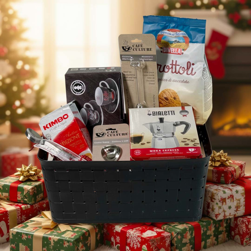 Start every morning right with authentic Italian espresso at home. This handpicked collection brings café-quality coffee to your kitchen with the classic Bialetti 3-cup Moka espresso maker and premium Kimbo ground coffee. Create barista-style drinks with the Danesco electronic milk frother, measure perfectly with the coffee scoop, and serve in style with Sara Cucina espresso cups, saucers, and spoons. Enjoy with Divella Grottoli cookies for the complete Italian coffee experience. Perfect for coffee lovers, newlyweds, or clients who appreciate the finer things.
