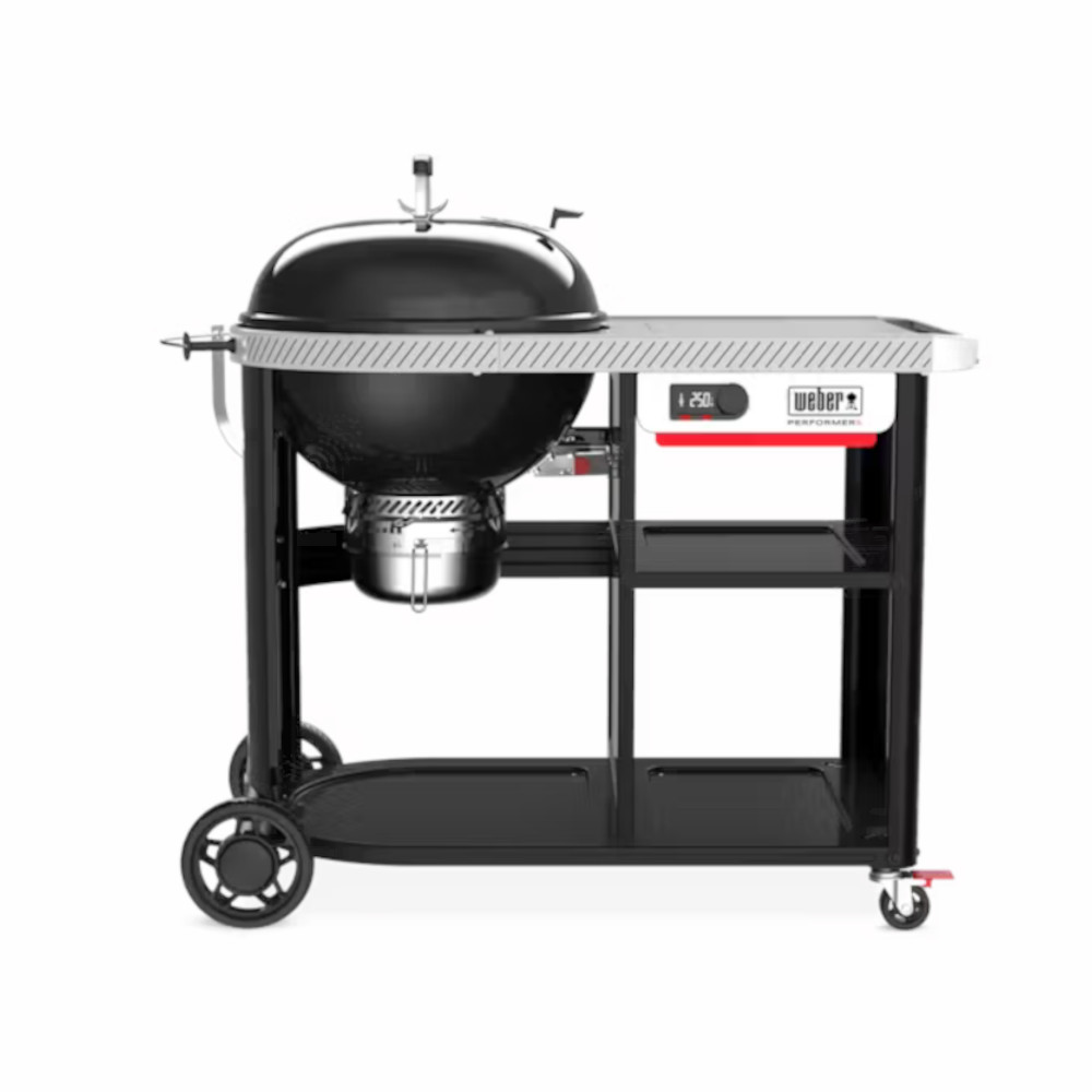 Get the classic Weber® kettle performance you love—now with built-in prep space, storage, and next-level control—with the 22” Performer™ Premium Smart Charcoal Grill. An LCD Wi‑Fi® Enabled Controller uses a digital fan to blow air into the coals so you can reach, hold, and adjust temperature with precision—ideal for long cooks and overnight smoking. Fire up faster with Rapidfire™ Assist mode, which stokes the coals after lighting a fire starter while the grill preheats. You can also monitor and control cooks from your phone using the Weber Connect® App.