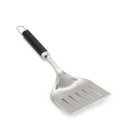 Lift and move large cuts of meat or delicate fish with ease. The wide grill spatula features a 3-sided beveled edge design that allows you lift foods with precision from any angle. The heavy-duty stainless-steel construction and soft-touch handle provide control as the oversized head picks up large cuts or fragile foods with minimal effort. Brand Name: Weber Sub Brand: Precision Tool Material: Stainless Steel Color: Black/Silver Product Type: Grill Spatula Tool Type Family: Spatulas Number in Package: 1 pc Packaging Type: Carded Height: 2.3 in. Width: 6.5 in. Length: 18 in. Heat Resistant Handles: Yes Handle Length: 4 in. Dishwasher Safe: Yes.