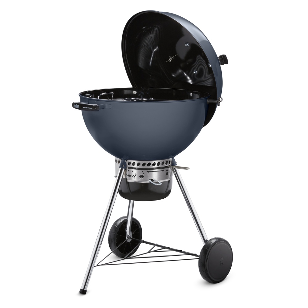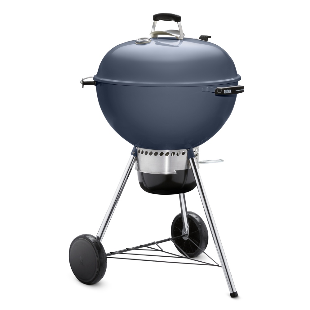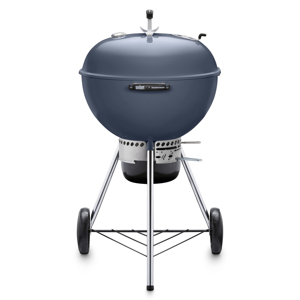 Weber Master-Touch 22 in. slate blue charcoal grill. The gourmet BBQ system hinged cooking grate provides 363 sq. in. of cooking space; warming rack adds 80 sq. in. Built-in lid thermometer displays internal grill temperature. Control temperature without lifting the lid with the rust-resistant aluminum damper. Clean-up is easy with the one-touch cleaning system. Porcelain enamel bowl and lid help maintain heat as well as preventing rusting and cracking. Glass reinforced nylon lid handle with heat shield and bowl handle with tool hooks. Includes two char baskets to help organize charcoal. Tuck-away lid holder. Push pin leg assembly with durable all-weather 8 in. rubber wheels. Features Heavy gauge porcelain-enameled bowl and lid resist corrosion Patented One-Touch cleaning system makes ash removal hassle free No-rust aluminum vent helps you reach your desired grilling temperature Conveniently features a built-in thermometer lid hook and tool hooks on bowl handlesSpecifications Color: Slate Blue Class: Entry-Level Fuel Type: Charcoal Collection: Master Touch Configuration: Freestanding Exterior Material: Porcelain Coated Steel Primary Color: Blue Cooking Grate Material: Plated Steel Cooking Grid Size: 22 Diameter Country of Origin: USA Main Grilling Area: 363 sq in. Size: Small (0 – 26 ) Weight: 37.25 lbs – SKU: TRVAL131906.