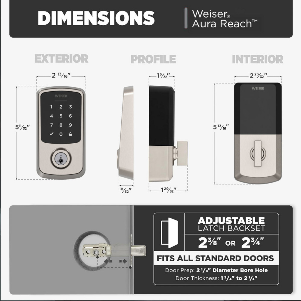 Discover Aura Reach, a Matter-enabled smart lock designed for convenience, easy integration, and exceptional security. Aura Reach works seamlessly with your existing smart home, and provides Bluetooth control when nearby. Share access with friends and family with up to 250 user codes, and rekey your lock in seconds to match your other Weiser locks using SmartKey one-key convenience. An interactive guide makes installation a snap: a screwdriver is all you need. Backed by Weser’s 120 years of experience, the Aura Reach delivers convenient connected security.
