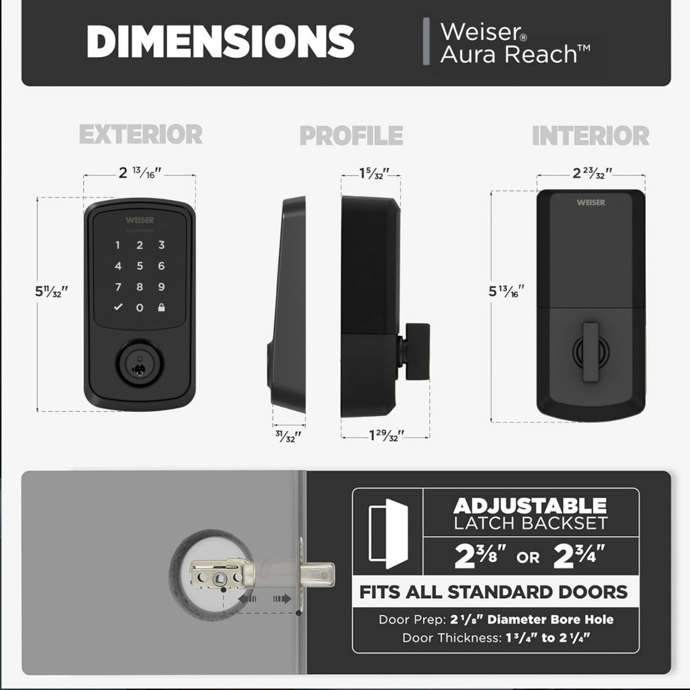 Discover Aura Reach, a Matter-enabled smart lock designed for convenience, easy integration, and exceptional security. Aura Reach works seamlessly with your existing smart home, and provides Bluetooth control when nearby. Share access with friends and family with up to 250 user codes, and rekey your lock in seconds to match your other Weiser locks using SmartKey one-key convenience. An interactive guide makes installation a snap: a screwdriver is all you need. Backed by Weser’s 120 years of experience, the Aura Reach delivers convenient connected security.