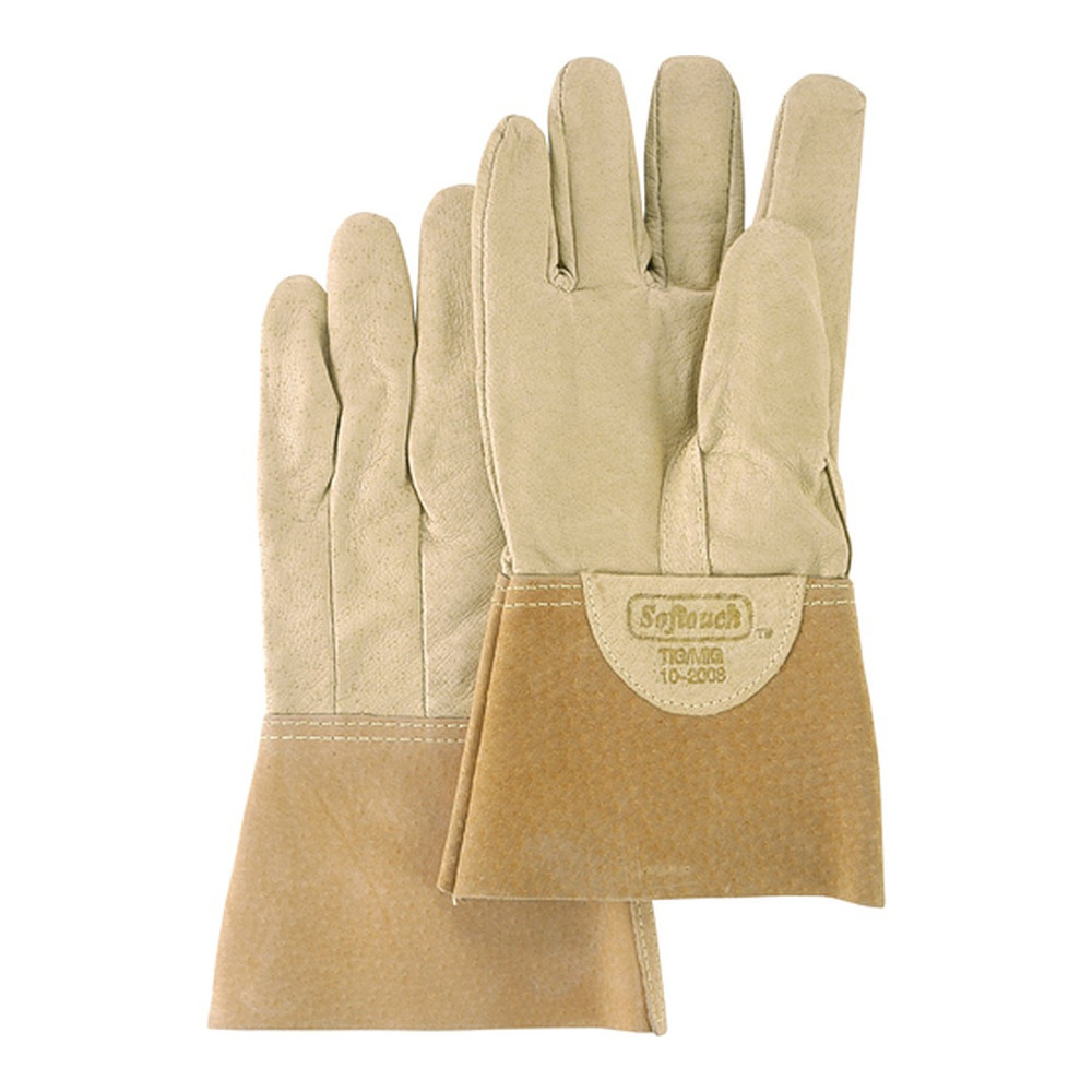 Seamless index finger construction provides unobstructed control over small diameter welding rods and ultra light TIG torches, Extra long cuff offers wrist and forearm protection against heat, 4″ split pigskin cuff, seamless index finger, Sewn with DuPont(R) Kevlar(R) thread for higher seam strength and seam flame resistance