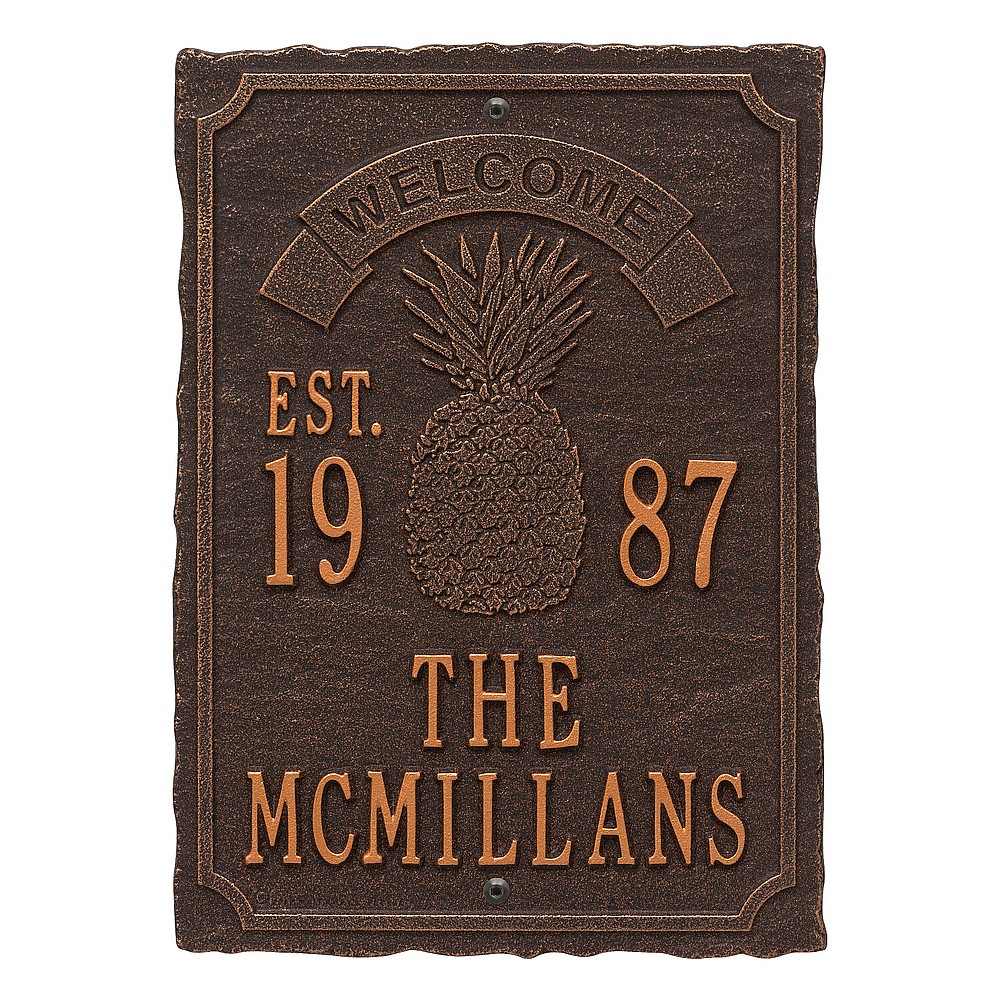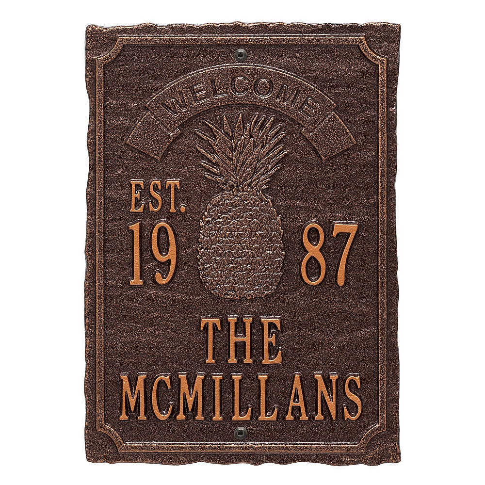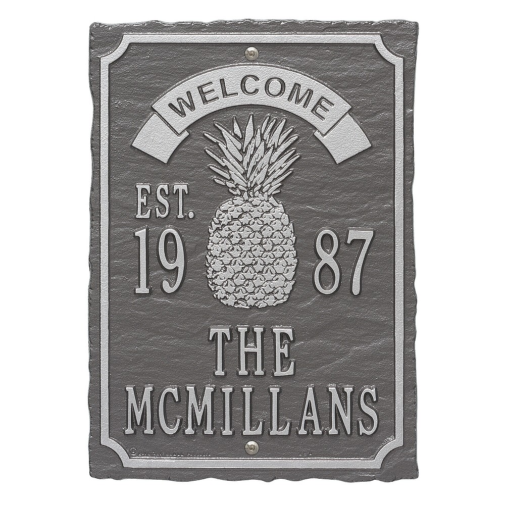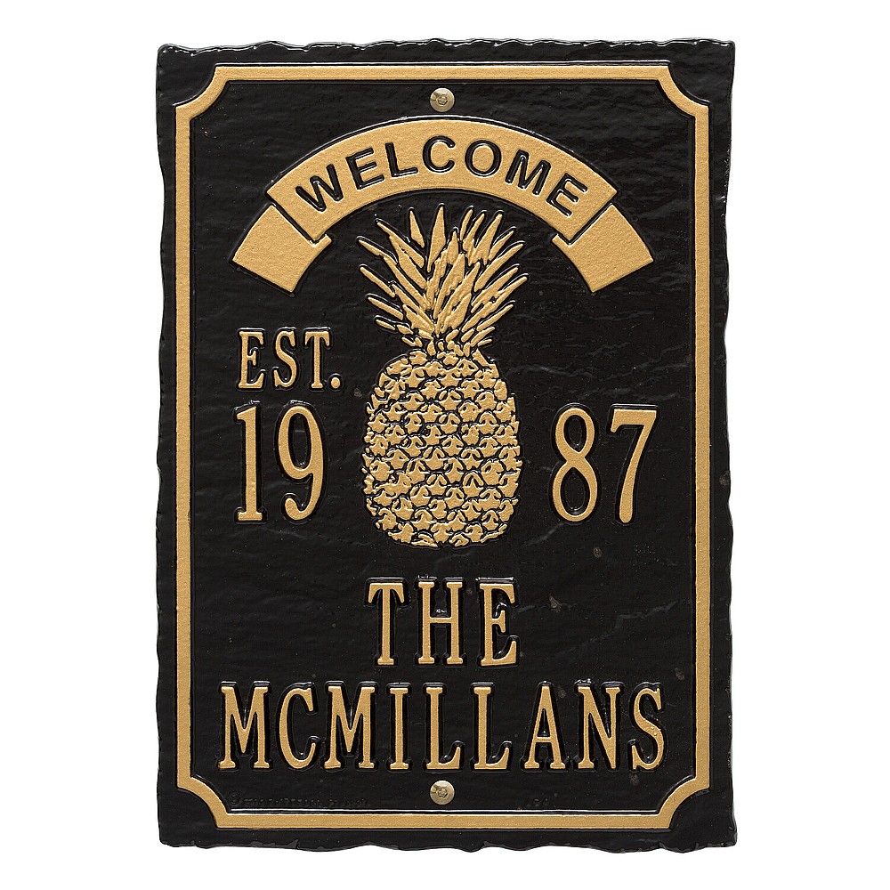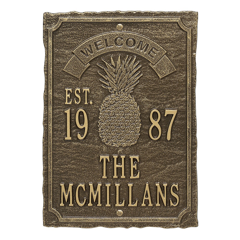 Dimensions (LxWxH): 12.5″ x 9″ x .32″ Dimensions (LxWxH): 12.5″ x 9″ x .32″ The pineapple symbolizes those intangible assets we appreciate in a home: warmth, welcome, friendship and hospitality. This personalized wedding plaque is a unique and memorable way to display a couple’s marriage and anniversary date. A Personalized plaque is a perfect gift to commemorate all of life’s celebrations. Makes a great personalized wedding, anniversary, or house warming gift. Handcrafted aluminum plaque for indoor or outdoor use. The words “welcome” and “est.” are a permanent part of the design. Alumi-Shieldâ„¢ – Protects against the harshest weather and environmental elements. Extends the product life and maintains the look and function. Made in the USA. A Personalized plaque is a perfect gift to commemorate all of life’s celebrations. Makes a great personalized wedding, anniversary, or house warming gift. Handcrafted aluminum plaque for indoor or outdoor use. The words “welcome” and “est.” are a permanent part of the design. Alumi-Shieldâ„¢ – Protects against the harshest weather and environmental elements. Extends the product life and maintains the look and function. Made in the USA.