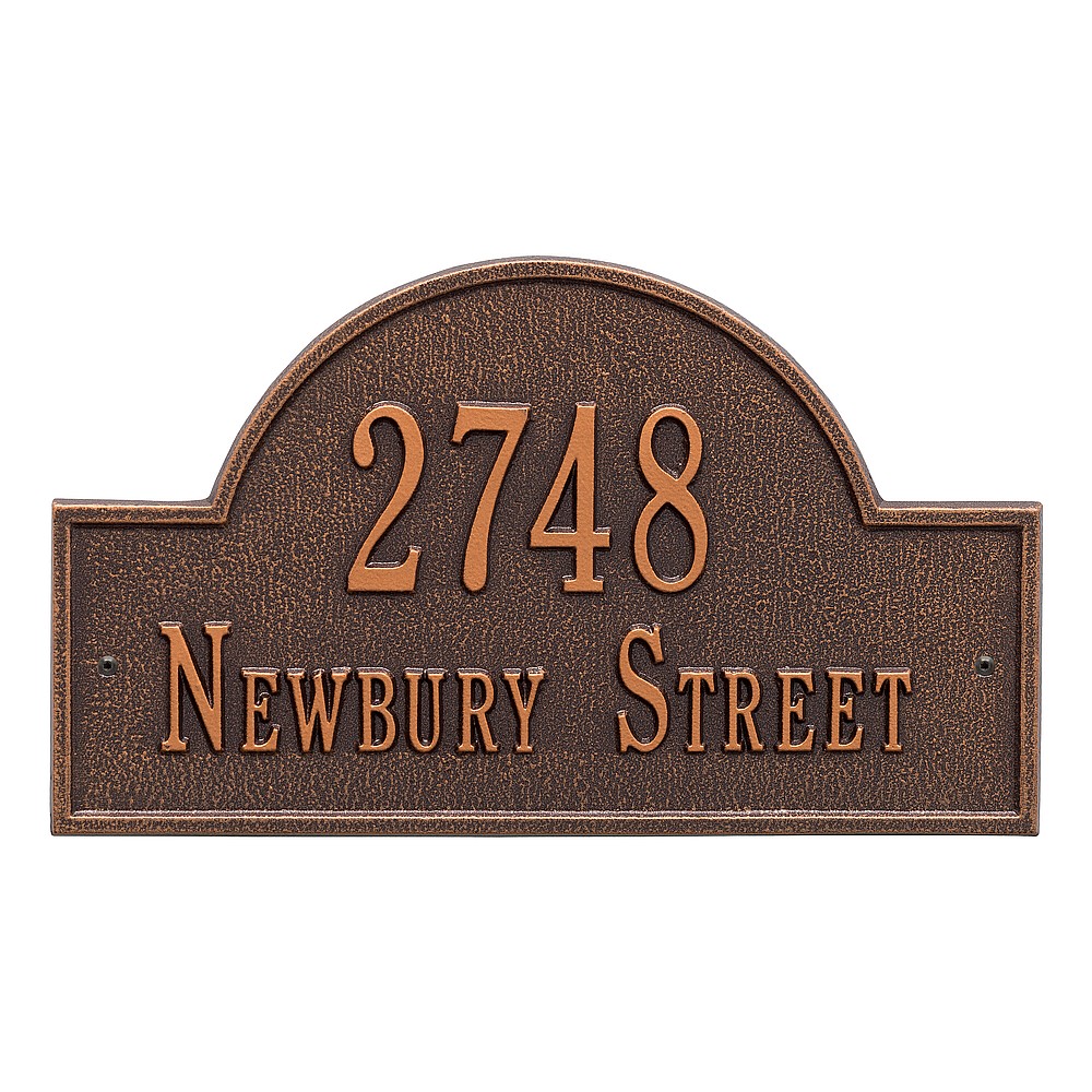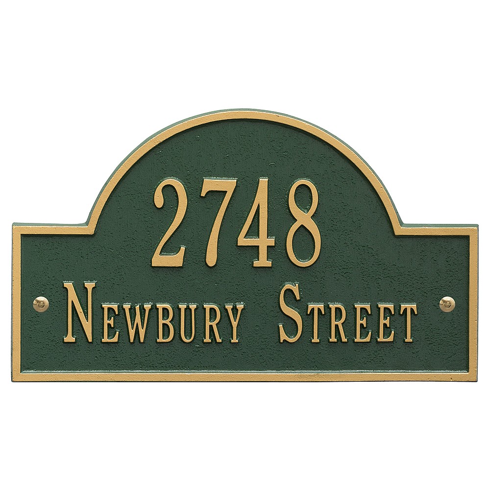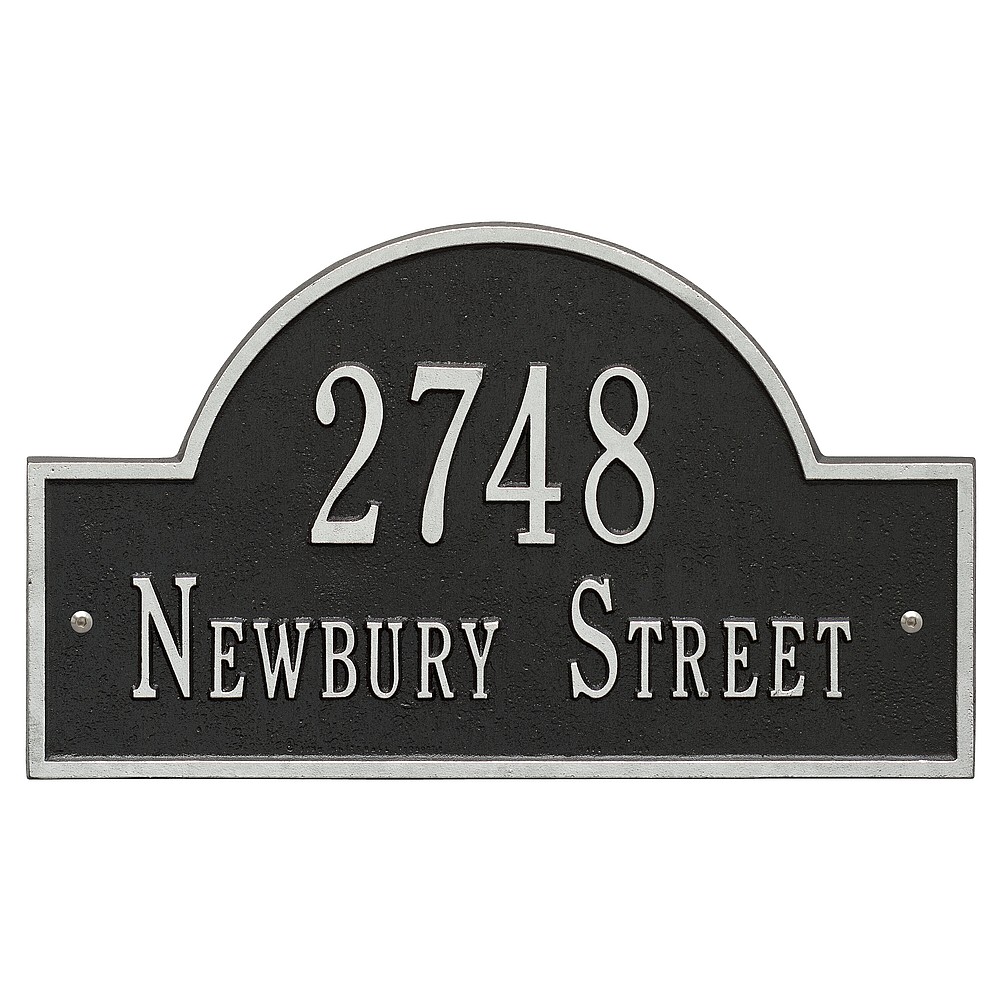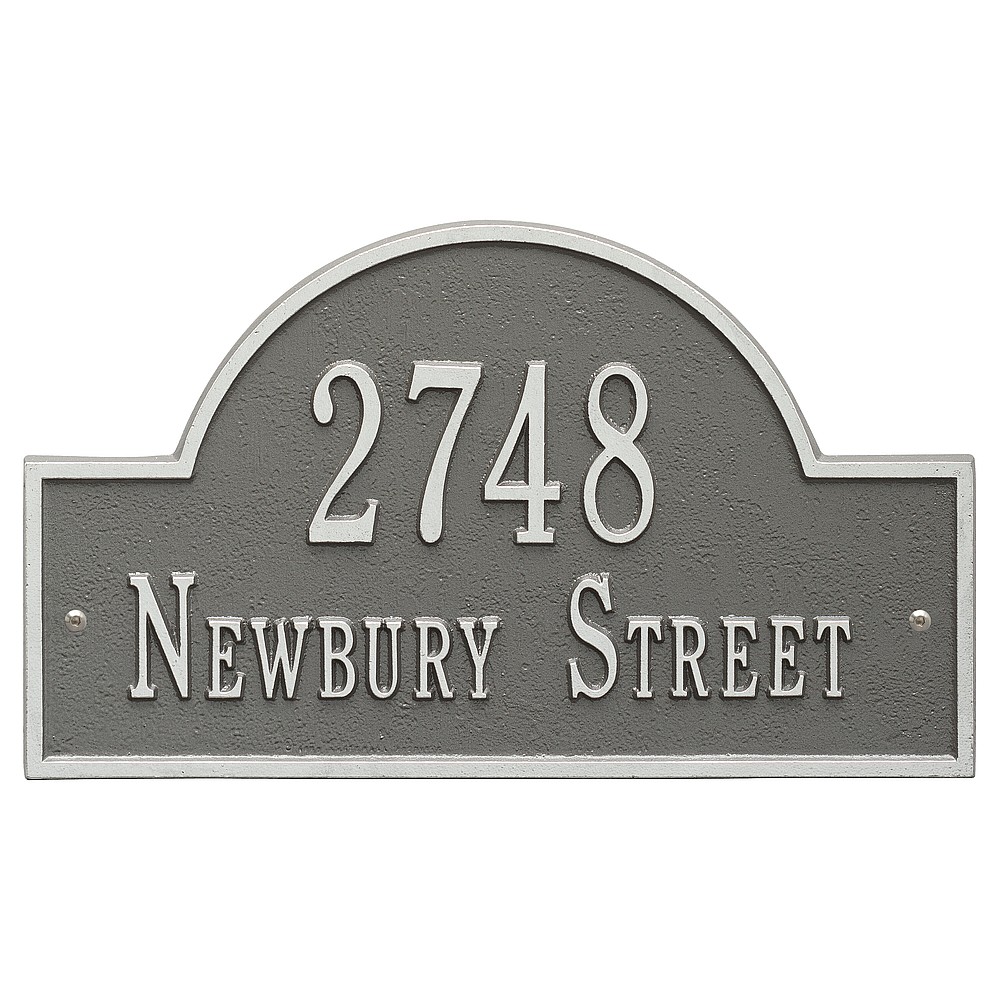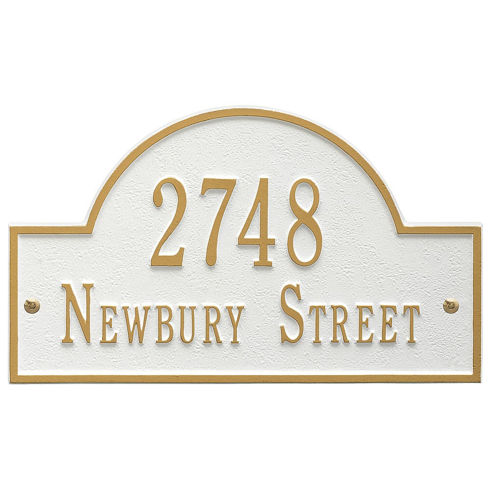 Line 1: 5 – 3″ characters Line 2: 17 – 1.25″ characters The Whitehall Products Arch Marker Address Plaque will accentuate your home’s exterior with elegance. The address plaque is made from rust-free cast aluminum providing excellent quality. The plaque has a stylish arch shape Made in the USA Cast from recycled aluminum – will not rust. Alumi-Shield™ All Weather Coatings: A Whitehall Exclusive Enhances curb appeal while adding value to your home Personalization is permanently cast into the sign