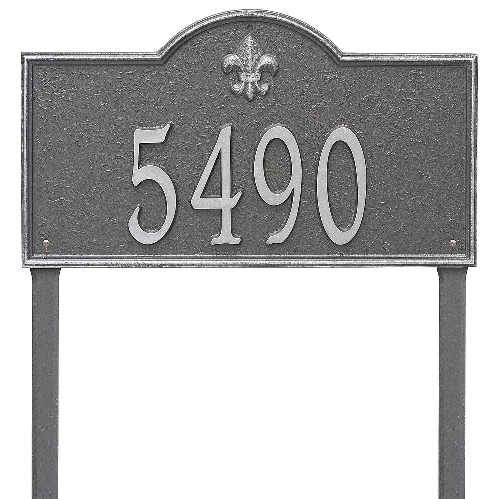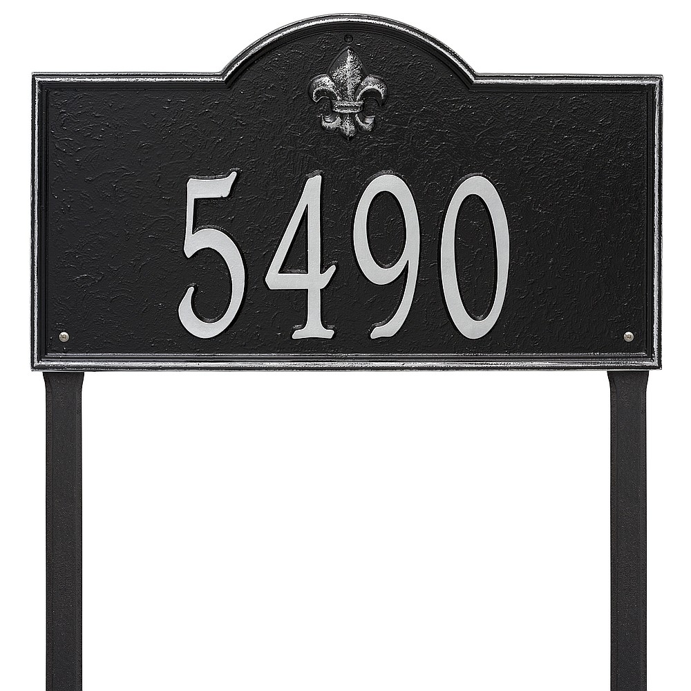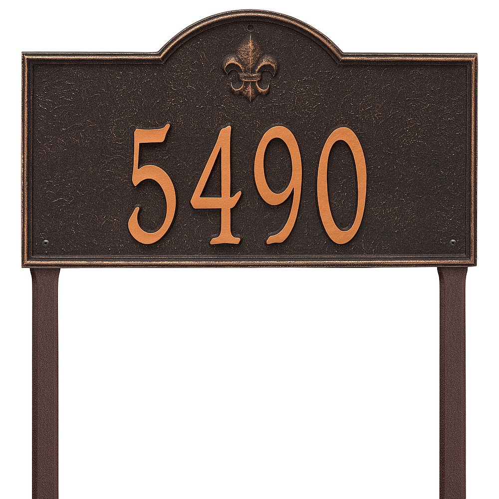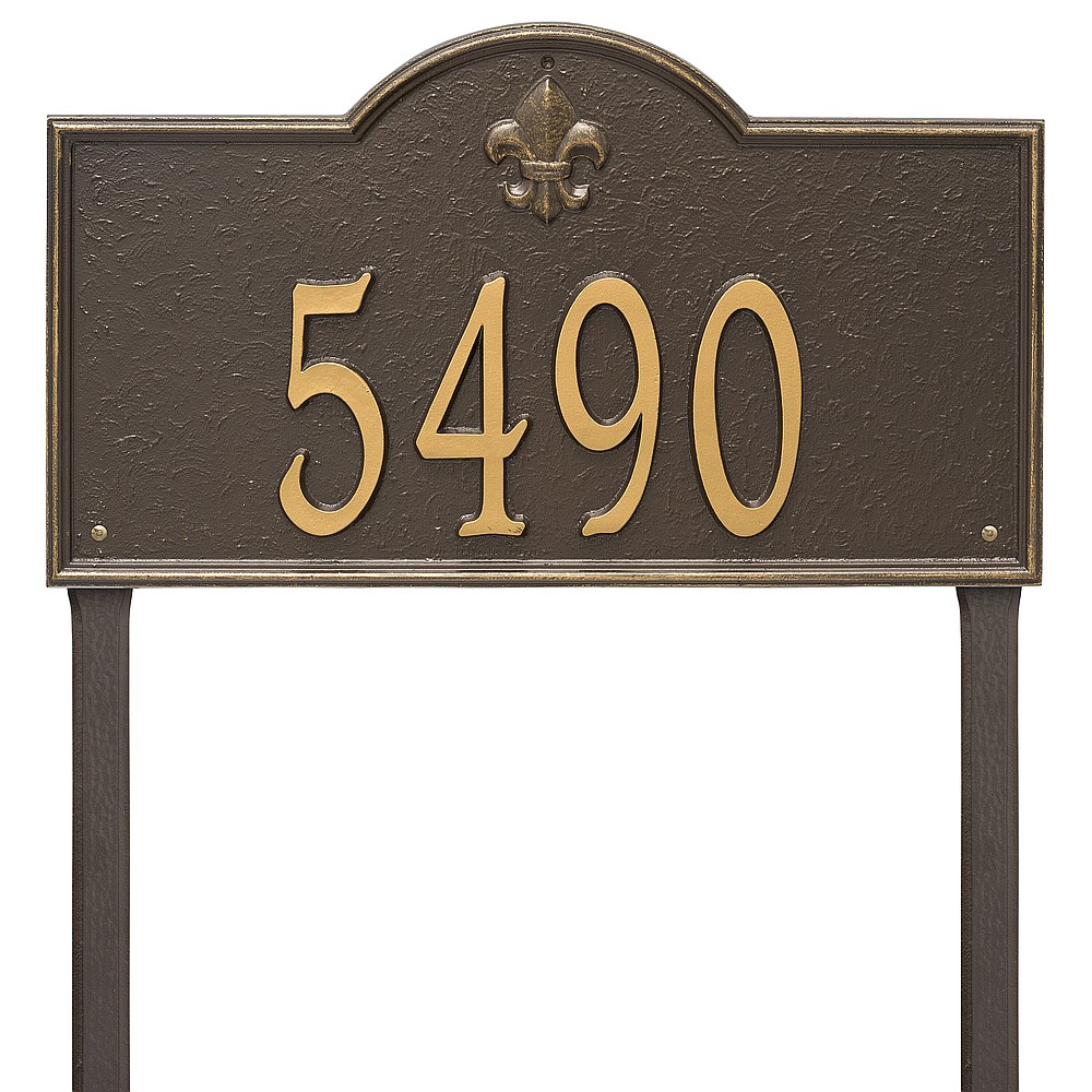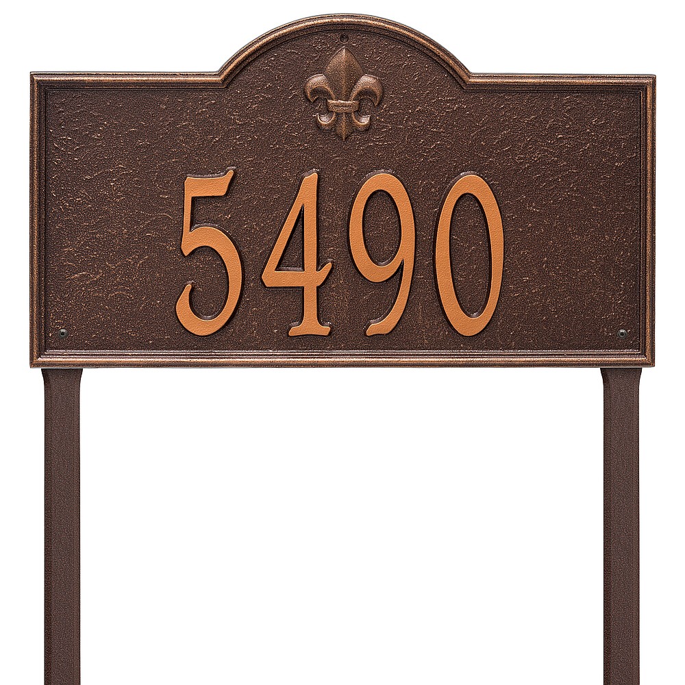 6 – 5.5″ numbers The fleur-de-lis emblem on this personalized address sign creates a distinctive style reminiscent of French Country and New Orleans. The Bayou Vista house numbers plaque will provide a boost to the curb appeal of your home. Home address plaques also make great gifts for any special occasion. Made in the USA Cast from recycled aluminum – will not rust. Alumi-Shield™ All Weather Coatings: A Whitehall Exclusive Enhances curb appeal while adding value to your home Personalization is permanently cast into the sign