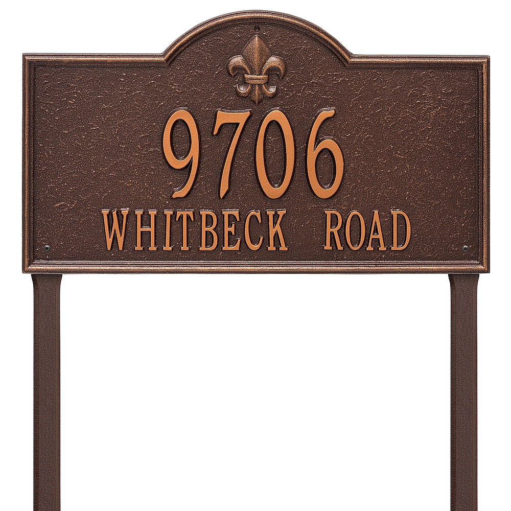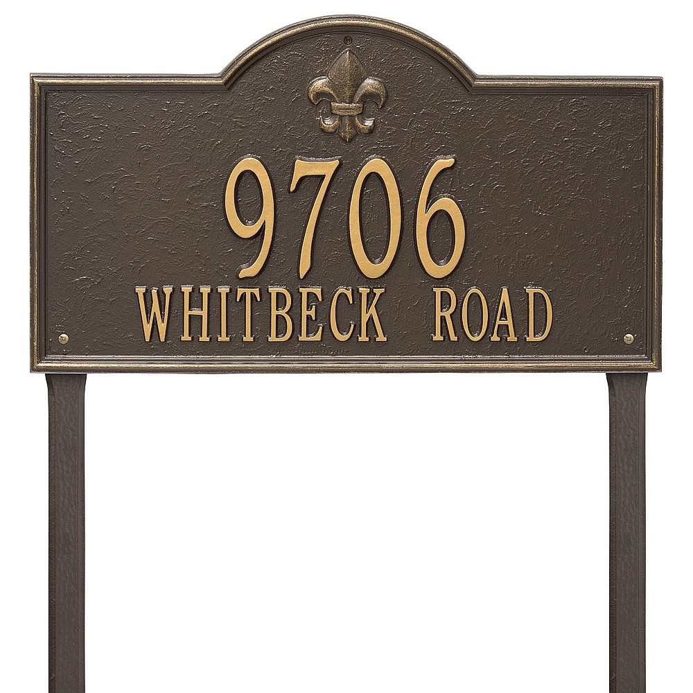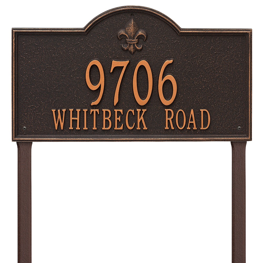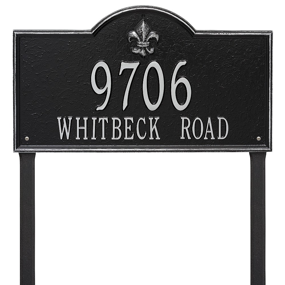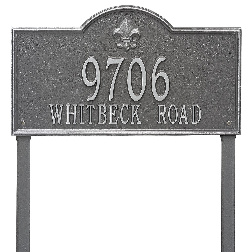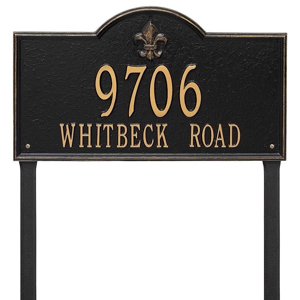Line 1: 6 – 4″ numbers Line 2: 16 – 1.75″ characters The fleur-de-lis emblem on this personalized address sign creates a distinctive style reminiscent of French Country and New Orleans. The Bayou Vista house numbers plaque will provide a boost to the curb appeal of your home. Home address plaques also make great gifts for any special occasion. Made in the USA Cast from recycled aluminum – will not rust. Alumi-Shield™ All Weather Coatings: A Whitehall Exclusive Enhances curb appeal while adding value to your home Personalization is permanently cast into the sign