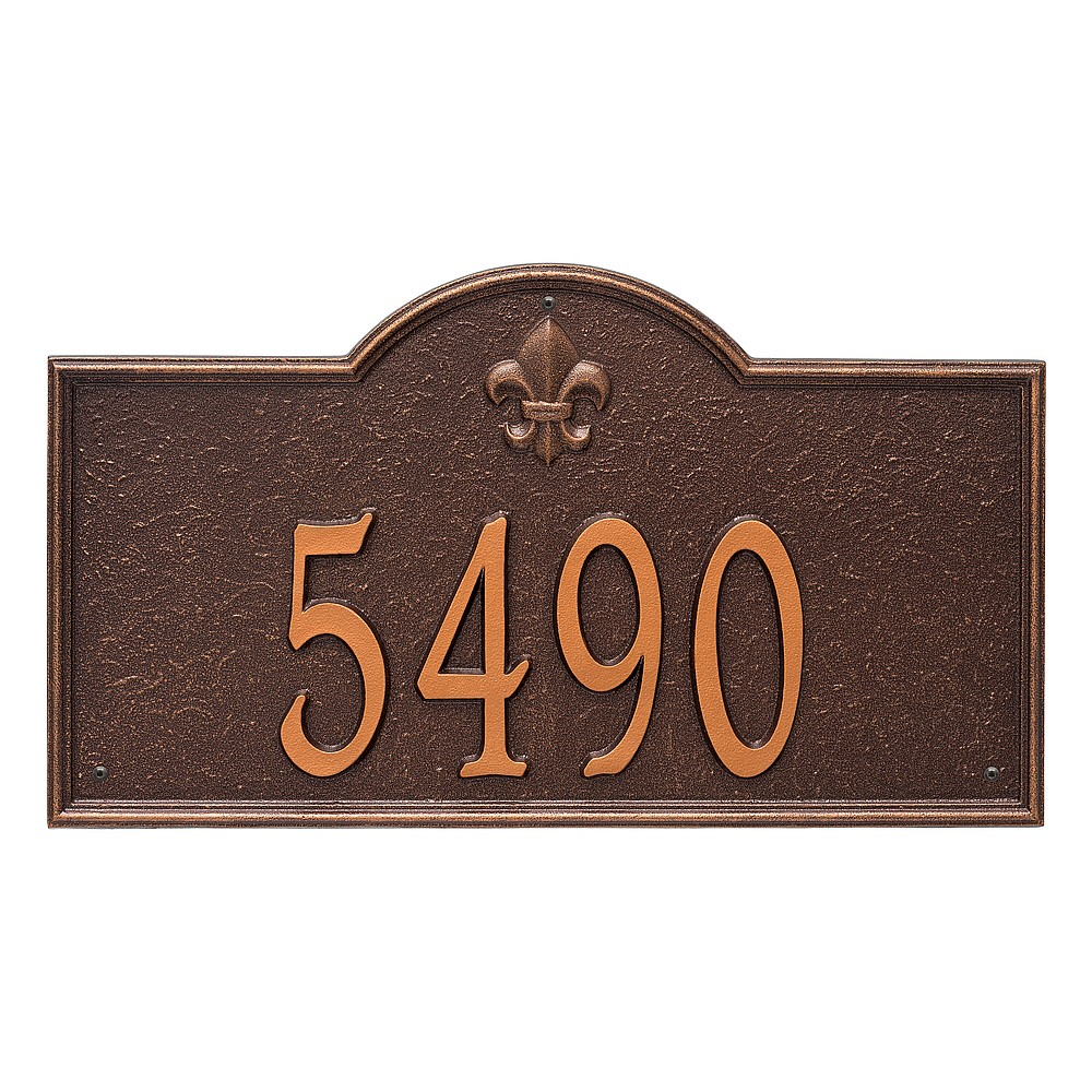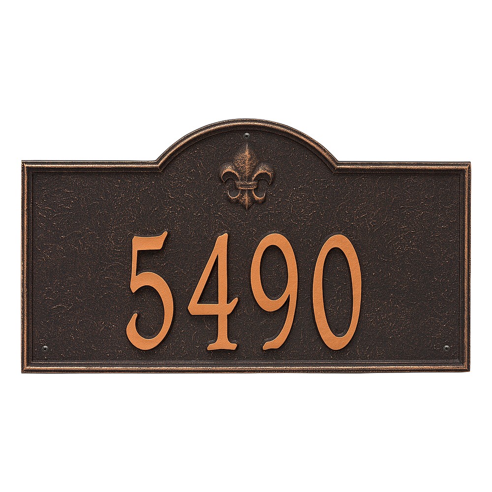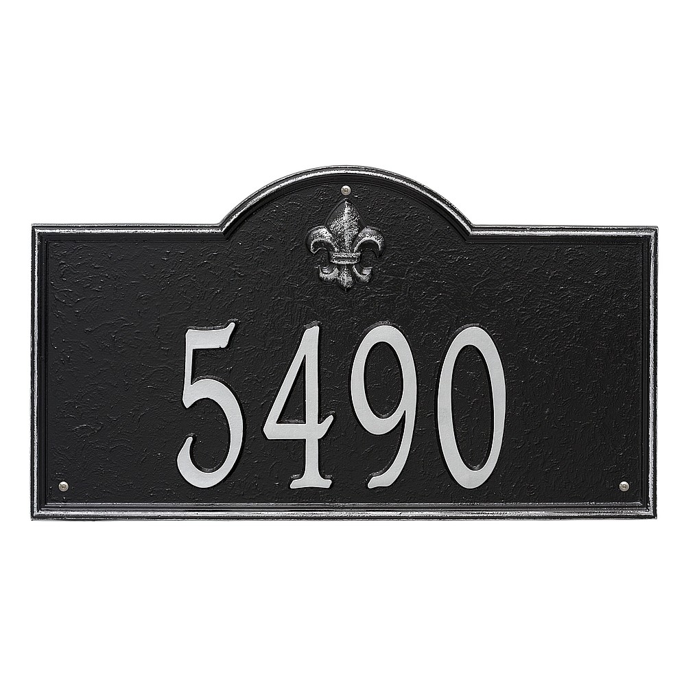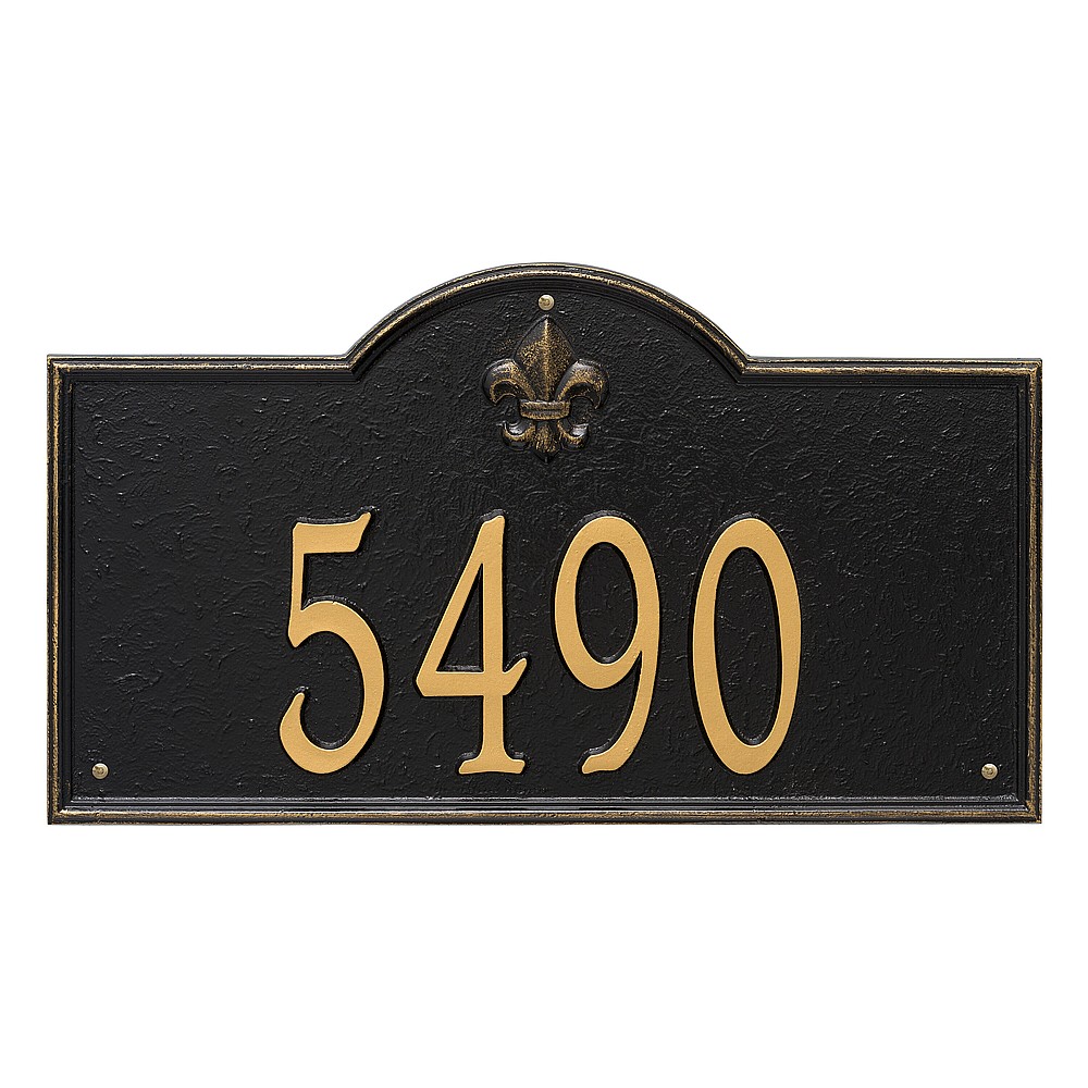 6 – 5.5″ numbers The fleur-de-lis emblem on this personalized address sign creates a distinctive style reminiscent of French Country and New Orleans. The Bayou Vista house numbers plaque will provide a boost to the curb appeal of your home. Home address plaques also make great gifts for any special occasion. Made in the USA Cast from recycled aluminum – will not rust. Alumi-Shield™ All Weather Coatings: A Whitehall Exclusive Enhances curb appeal while adding value to your home Personalization is permanently cast into the sign