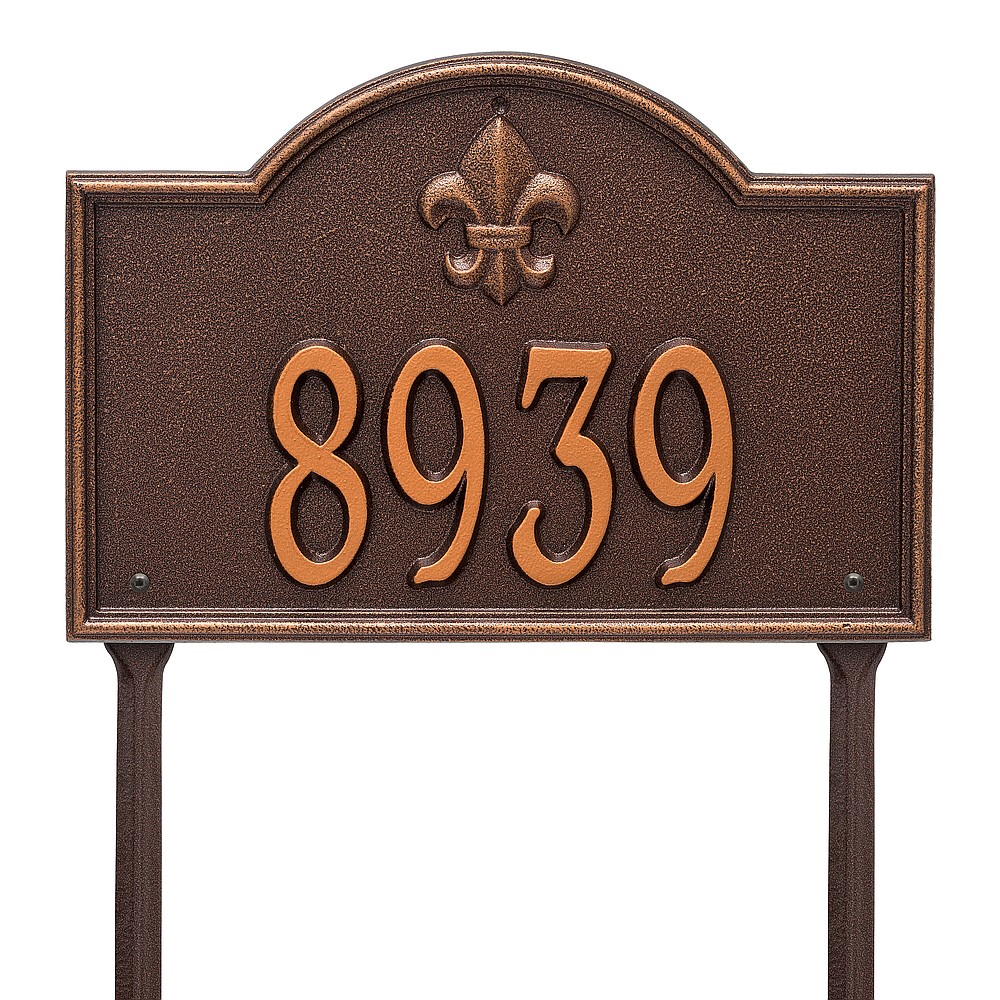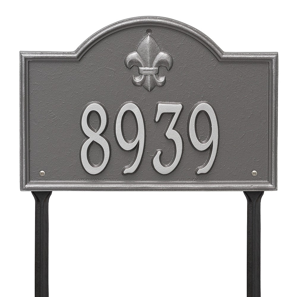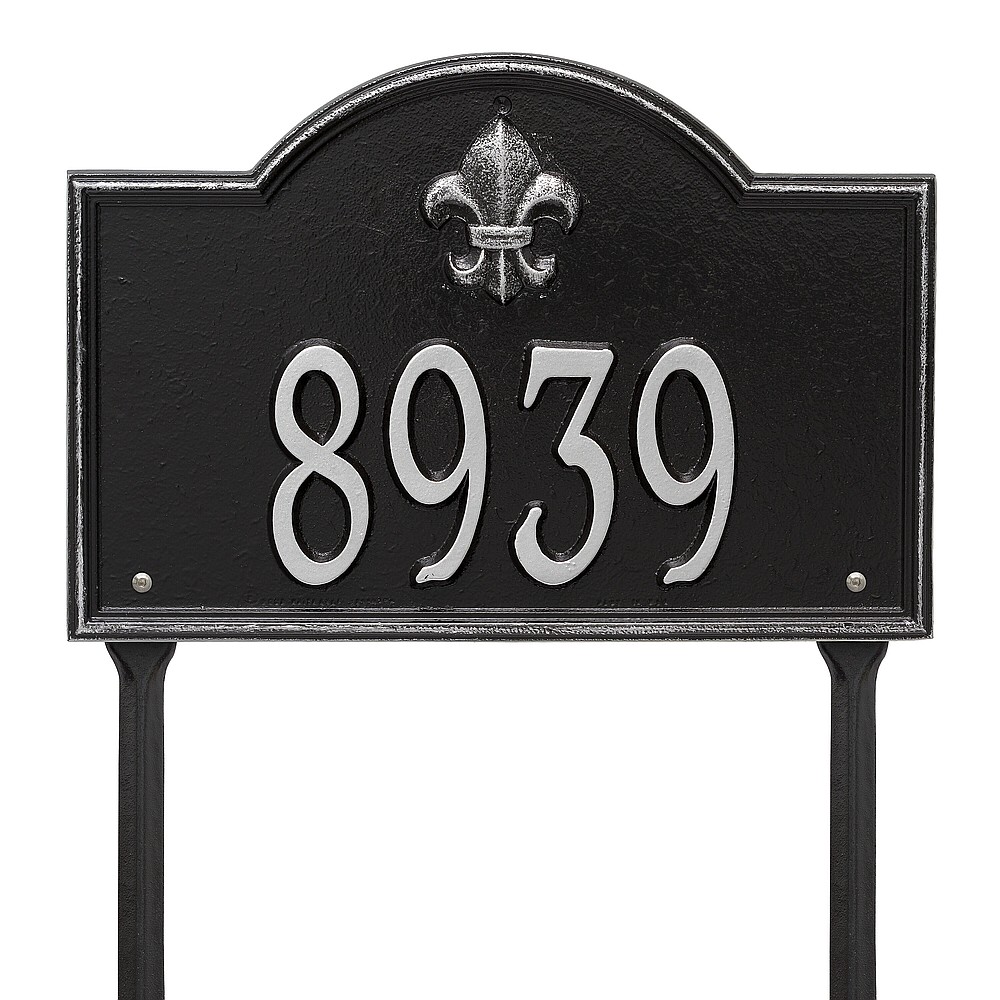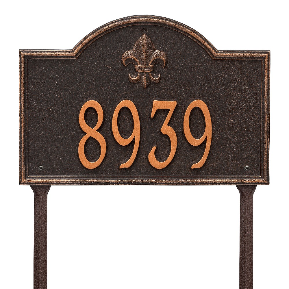 6 – 4″ numbers The fleur-de-lis emblem on this personalized address sign creates a distinctive style reminiscent of French Country and New Orleans. The Bayou Vista house numbers plaque will provide a boost to the curb appeal of your home. Home address plaques also make great gifts for any special occasion. Made in the USA Cast from recycled aluminum – will not rust. Alumi-Shield™ All Weather Coatings: A Whitehall Exclusive Enhances curb appeal while adding value to your home Personalization is permanently cast into the sign