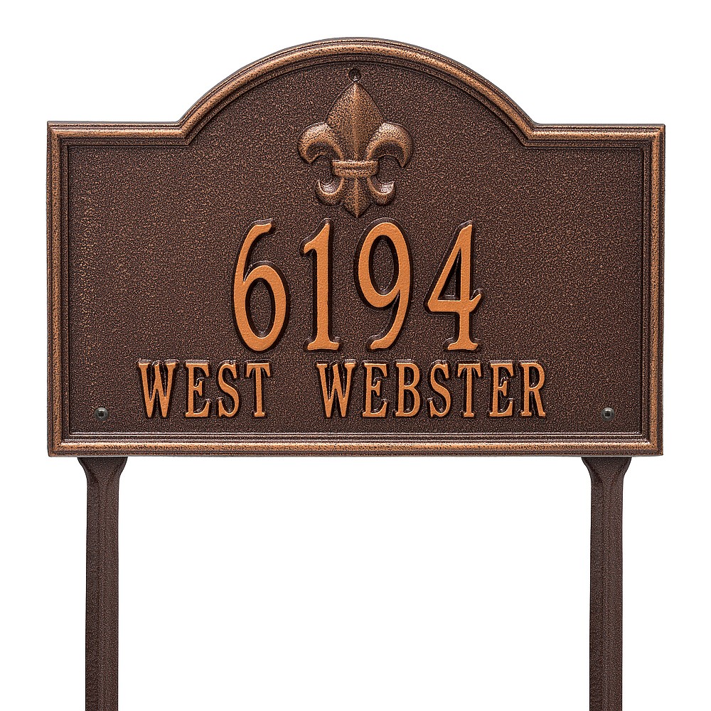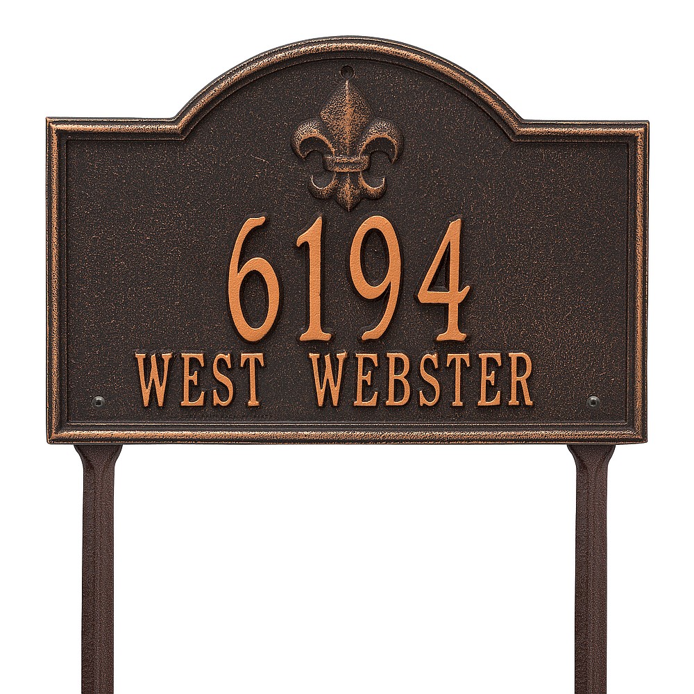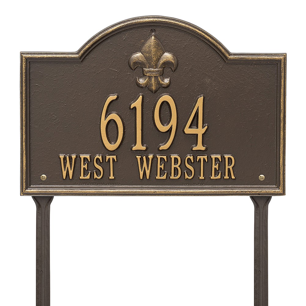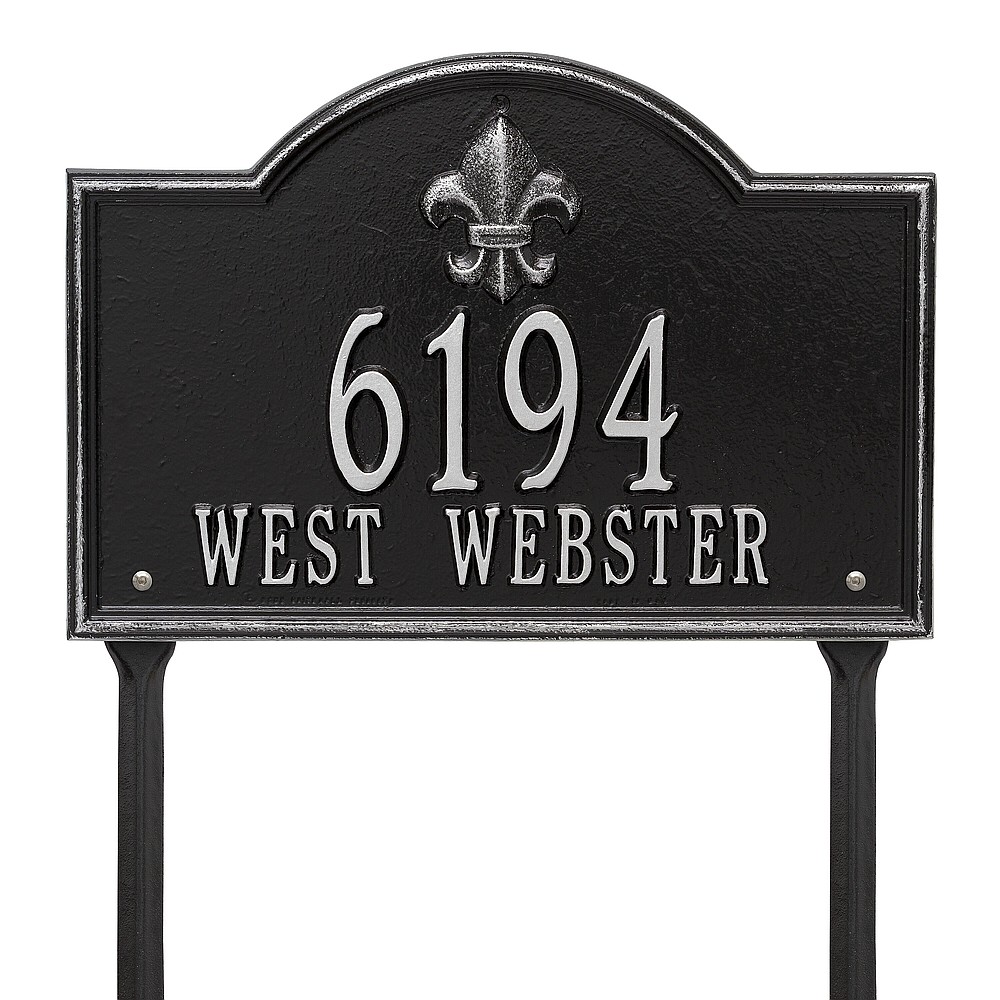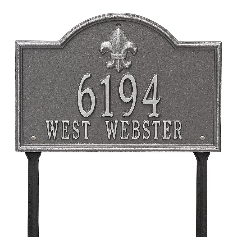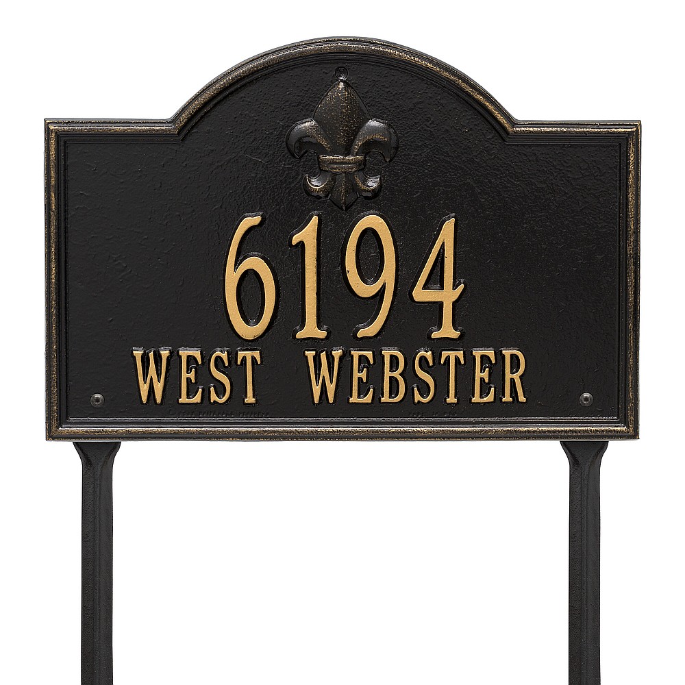 Line 1: 6 – 3″ numbers Line 2: 16 – 1.25″ characters The fleur-de-lis emblem on this personalized address sign creates a distinctive style reminiscent of French Country and New Orleans. The Bayou Vista house numbers plaque will provide a boost to the curb appeal of your home. Home address plaques also make great gifts for any special occasion. Made in the USA Cast from recycled aluminum – will not rust. Alumi-Shield™ All Weather Coatings: A Whitehall Exclusive Enhances curb appeal while adding value to your home Personalization is permanently cast into the sign
