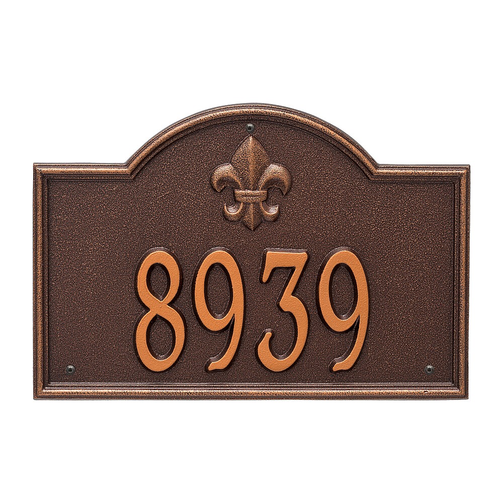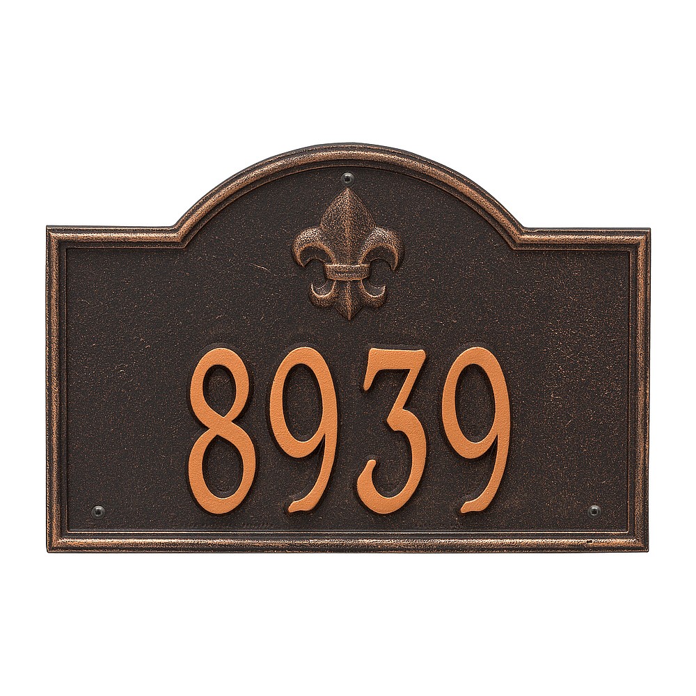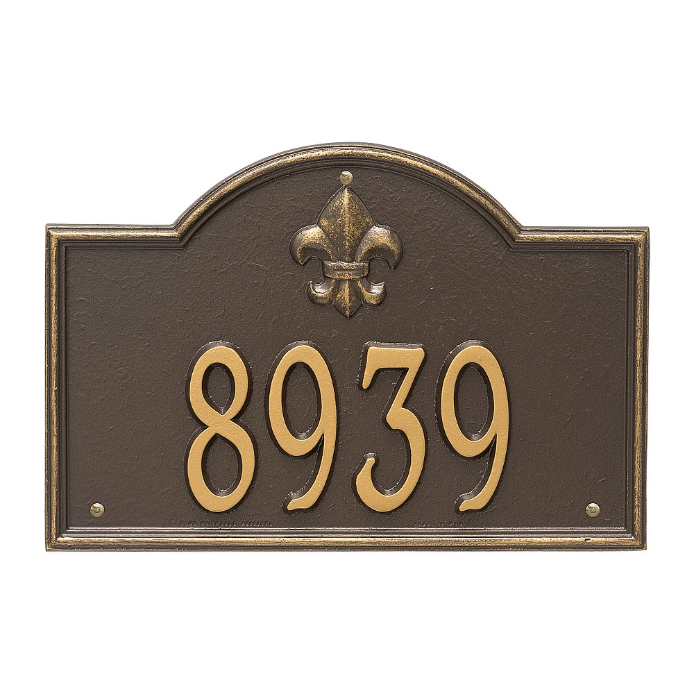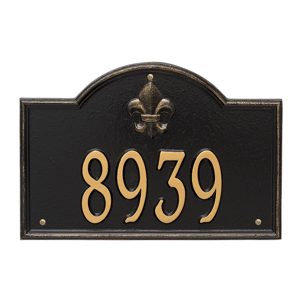 6 – 4″ numbers The fleur-de-lis emblem on this personalized address sign creates a distinctive style reminiscent of French Country and New Orleans. The Bayou Vista house numbers plaque will provide a boost to the curb appeal of your home. Home address plaques also make great gifts for any special occasion. Made in the USA Cast from recycled aluminum – will not rust. Alumi-Shield™ All Weather Coatings: A Whitehall Exclusive Enhances curb appeal while adding value to your home Personalization is permanently cast into the sign