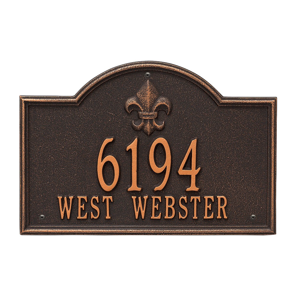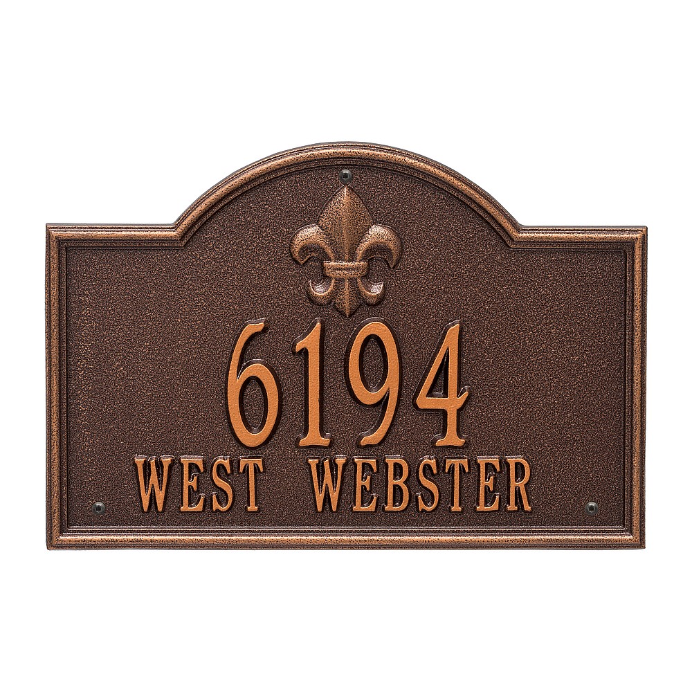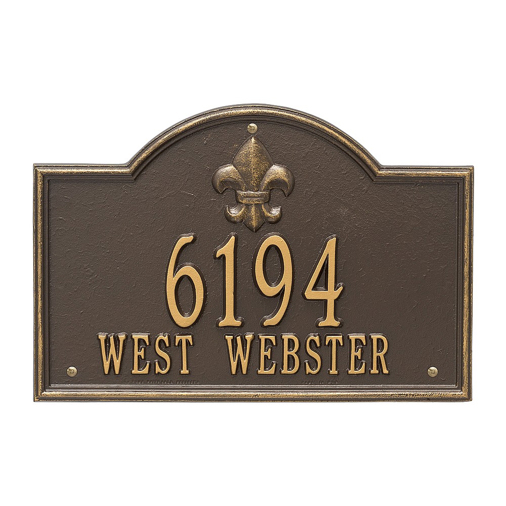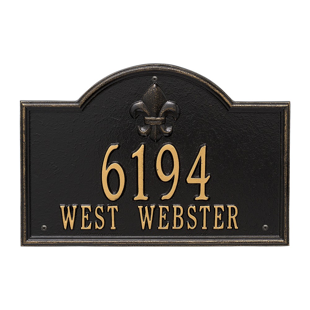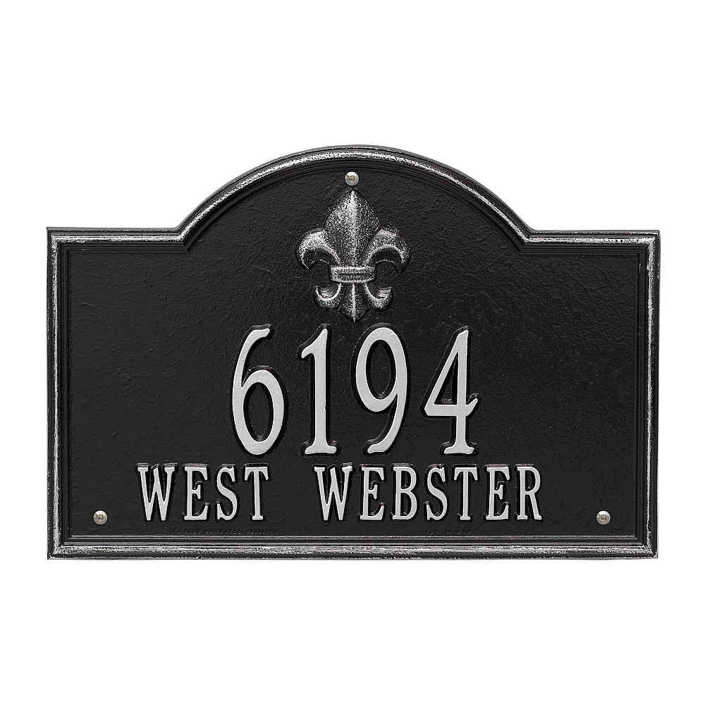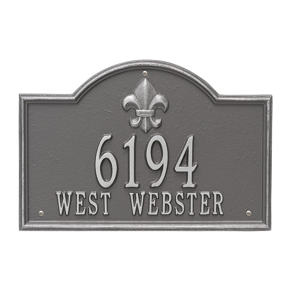 Line 1: 6 – 3″ numbers Line 2: 16 – 1.25″ characters The fleur-de-lis emblem on this personalized address sign creates a distinctive style reminiscent of French Country and New Orleans. The Bayou Vista house numbers plaque will provide a boost to the curb appeal of your home. Home address plaques also make great gifts for any special occasion. Made in the USA Cast from recycled aluminum – will not rust. Alumi-Shield™ All Weather Coatings: A Whitehall Exclusive Enhances curb appeal while adding value to your home Personalization is permanently cast into the sign