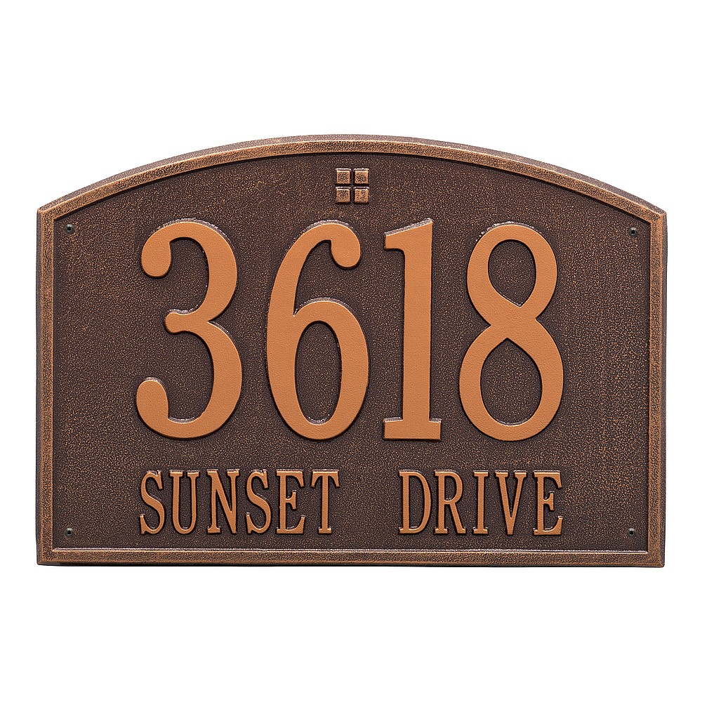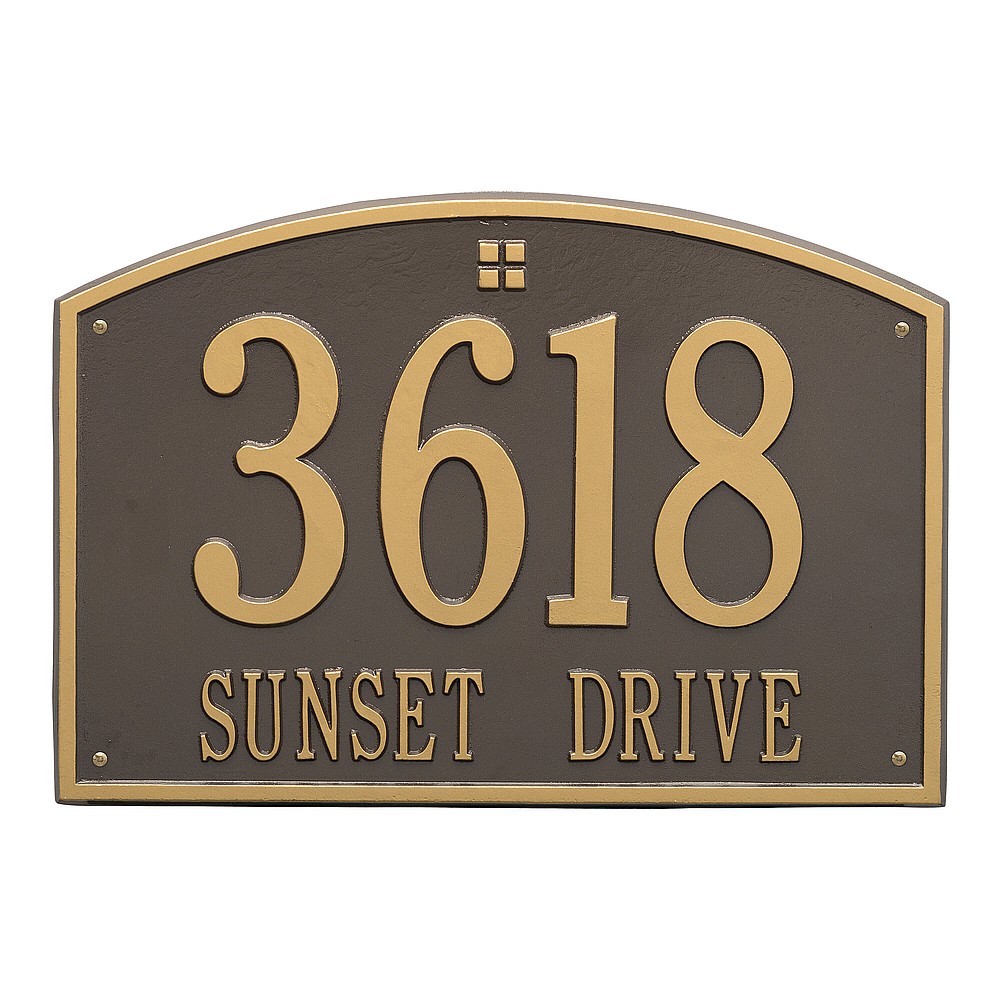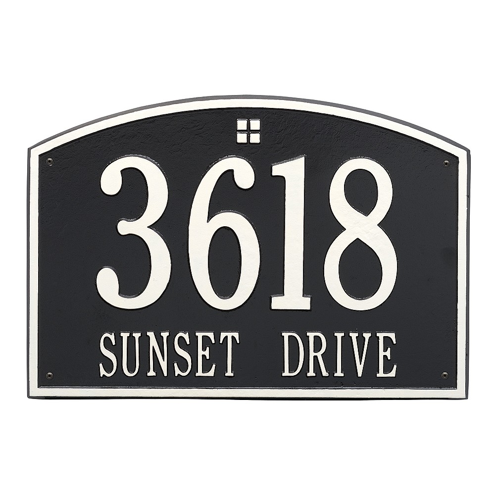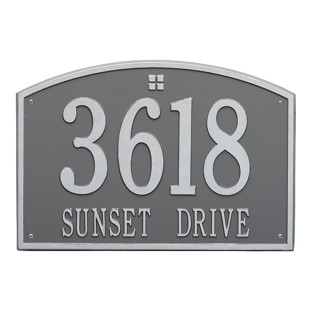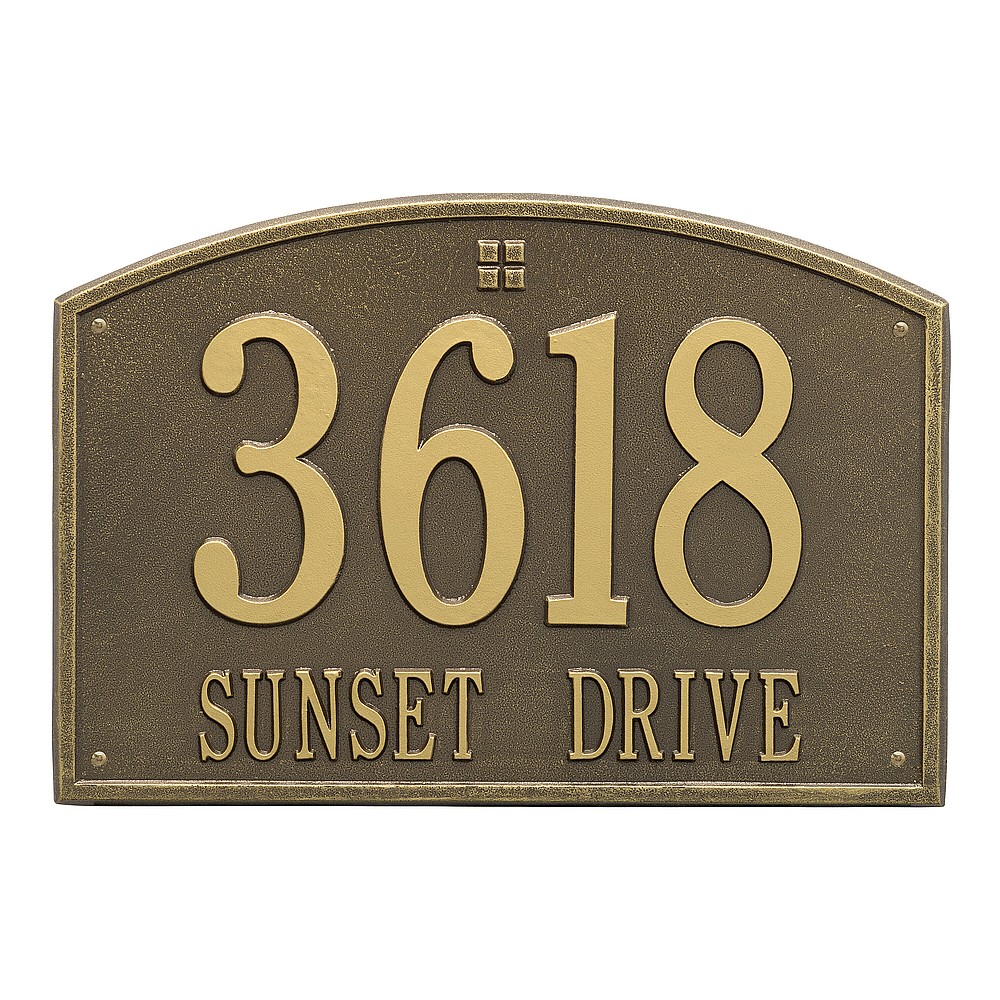 Line 1: 5 – 7″ numbers Line 2: 17 – 2″ characters The Whitehall Products Cape Charles Address Plaque displays your address in style. The address plaque is made from rust free cast aluminum providing excellent quality. A classy emblem adds distinction and charm to the top of this house number sign. Made in the USA Cast from recycled aluminum – will not rust. Alumi-Shield™ All Weather Coatings: A Whitehall Exclusive Enhances curb appeal while adding value to your home Personalization is permanently cast into the sign