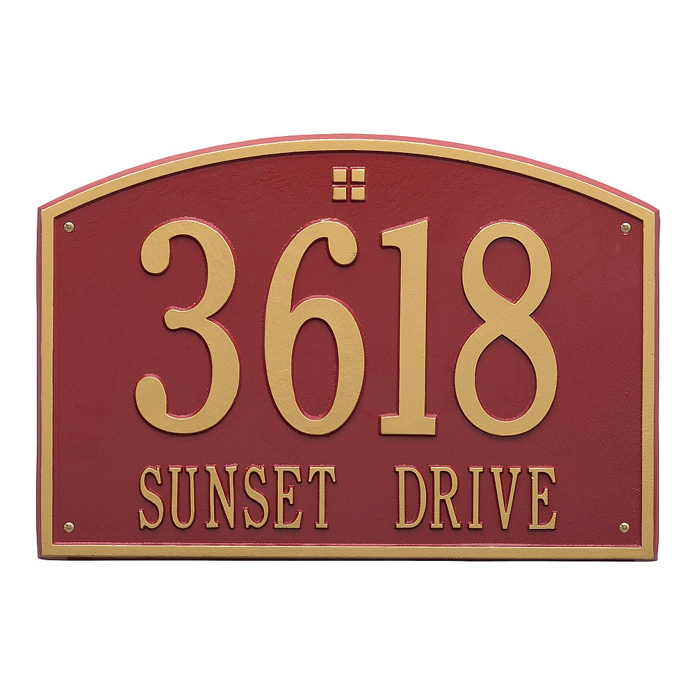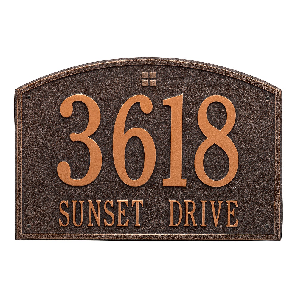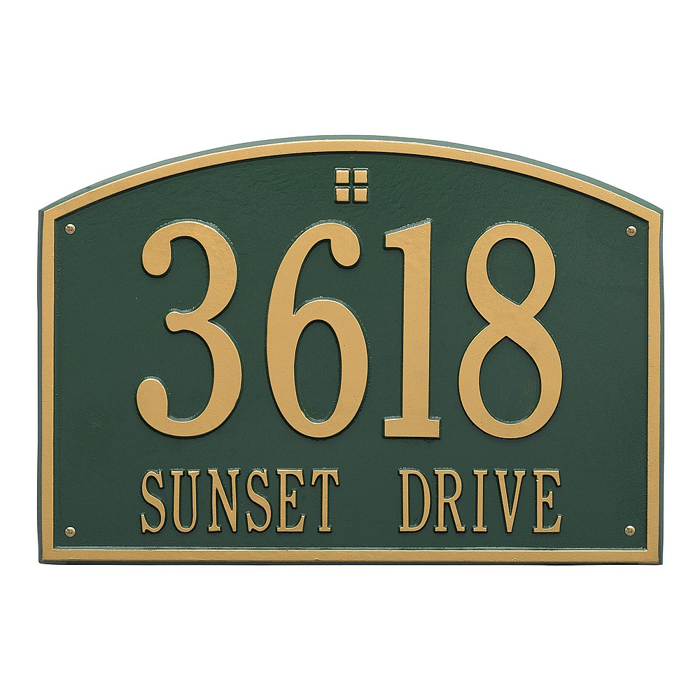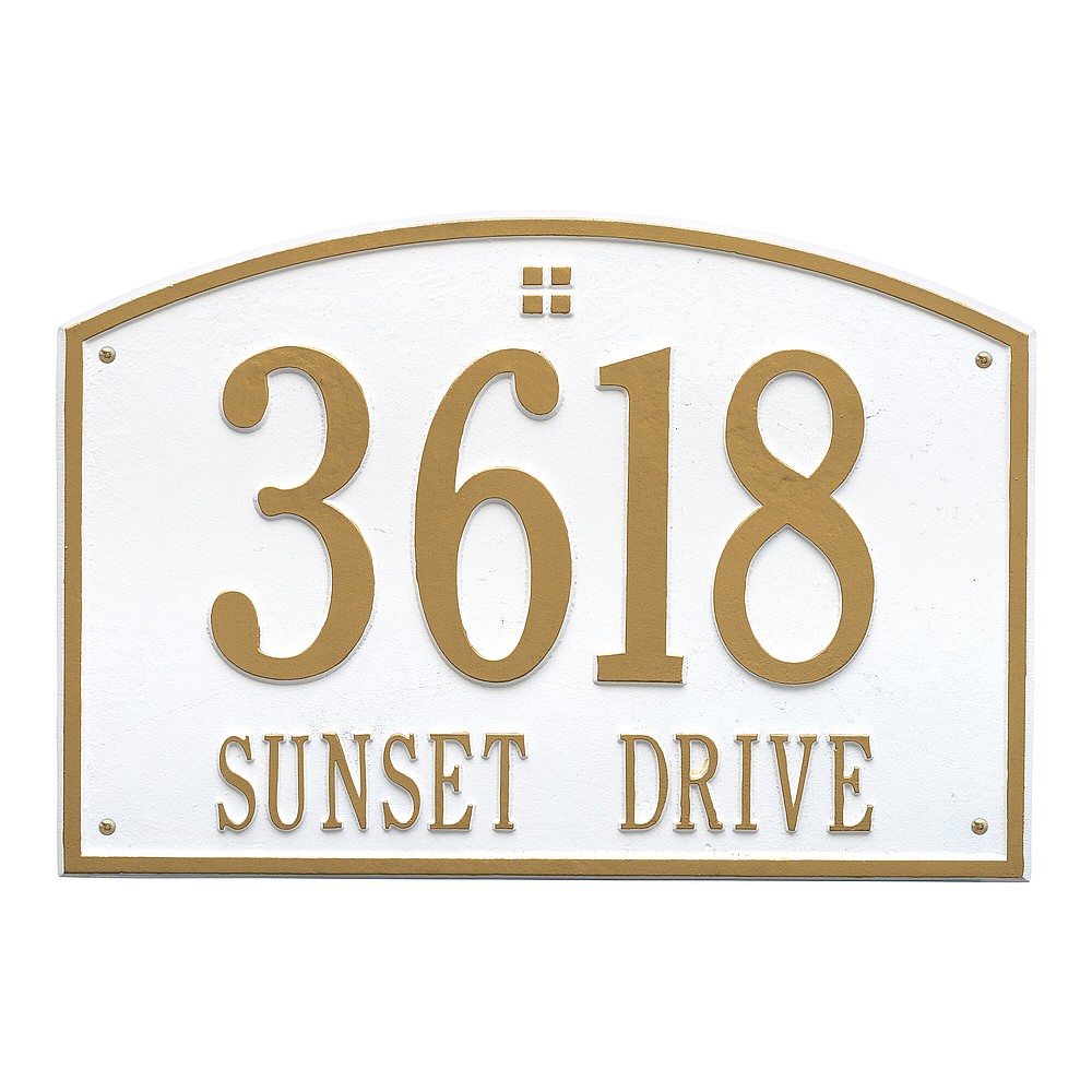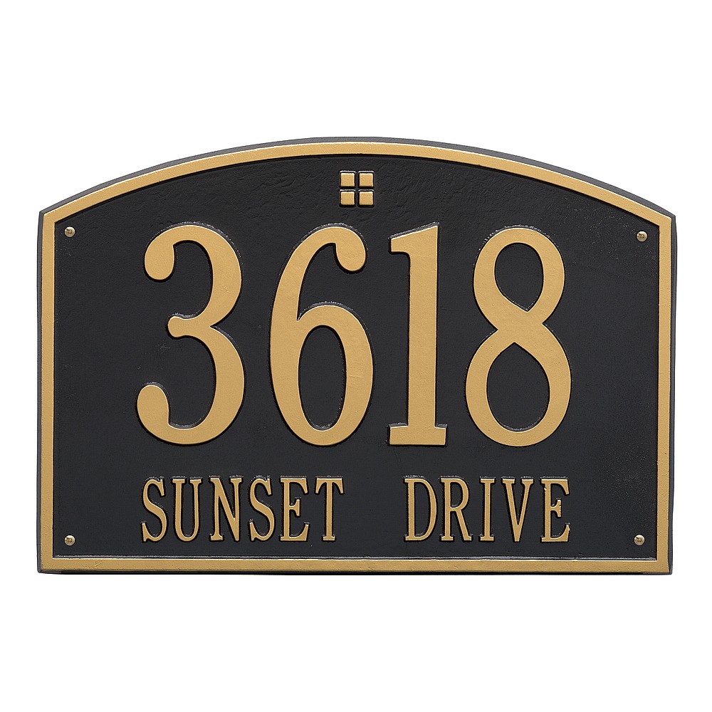 Line 1: 5 – 7″ numbers Line 2: 17 – 2″ characters The Whitehall Products Cape Charles Address Plaque displays your address in style. The address plaque is made from rust free cast aluminum providing excellent quality. A classy emblem adds distinction and charm to the top of this house number sign. Made in the USA Cast from recycled aluminum – will not rust. Alumi-Shield™ All Weather Coatings: A Whitehall Exclusive Enhances curb appeal while adding value to your home Personalization is permanently cast into the sign