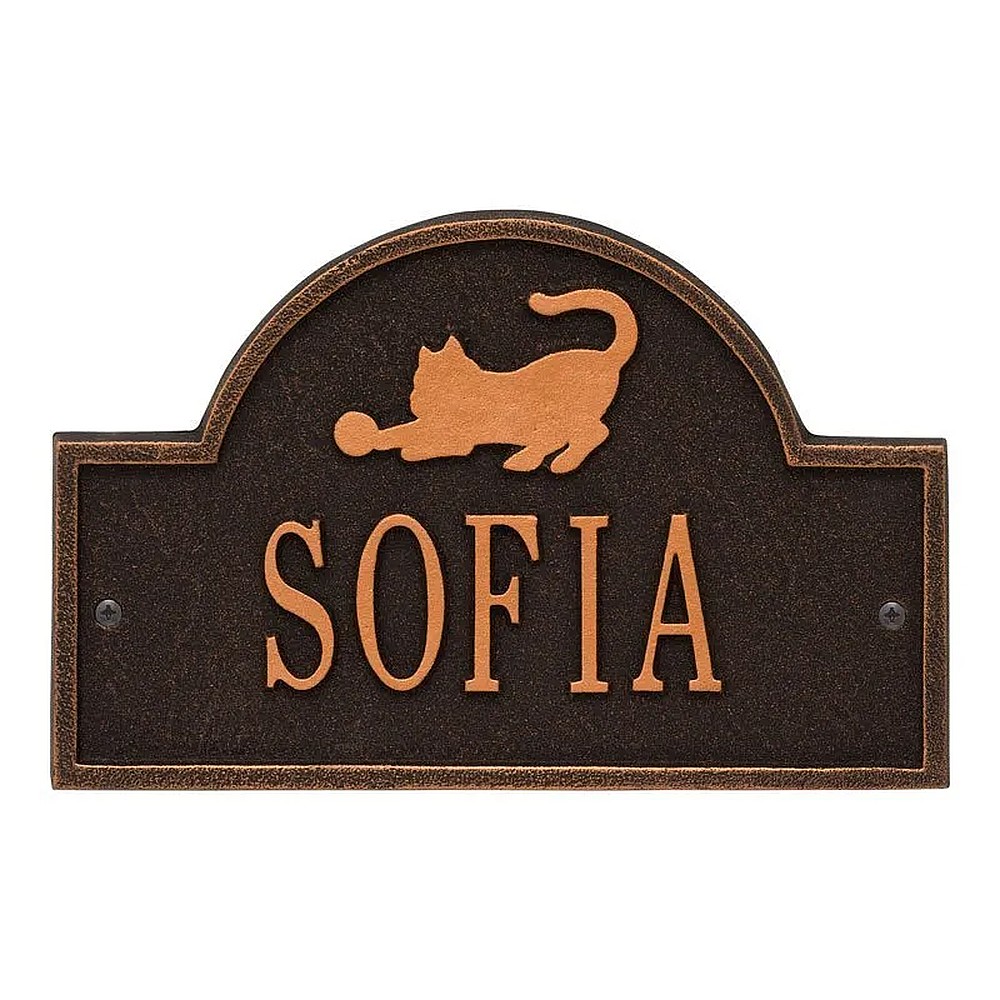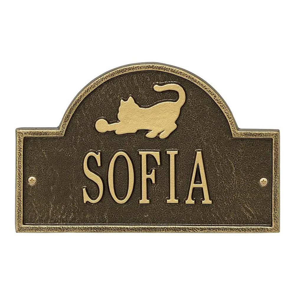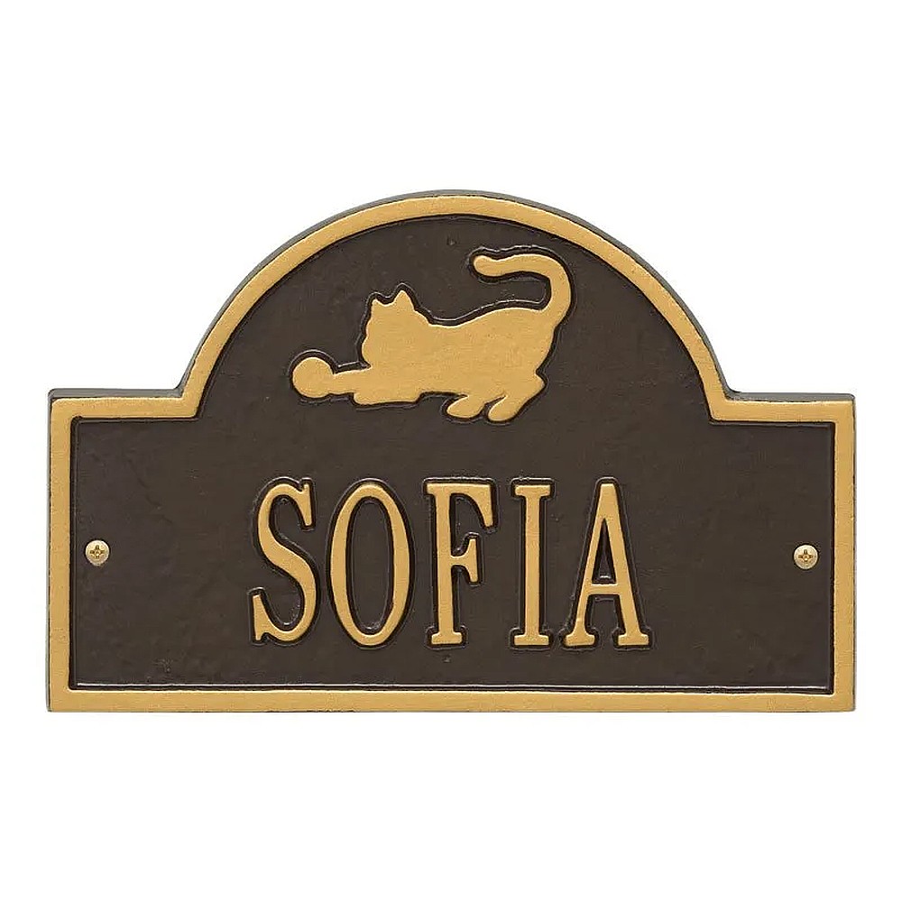 Assembled Dimensions Include Stakes (LxWxH): 10.125″ x 7″ x 0.375″ Personalize your pet’s eating, sleeping, or lounging area with the Cat Arch Mini personalized wall plaque. Featuring a playful cat with a ball of yarn, its an adorable decor addition for any cat lover. Easy to install with just two screws (provided)! Proudly made in the USA. Manufactured from recycled aluminum. Holds up to eleven 1.25″ characters. Personalization is permanently cast into the plaque. Easy installation. Two wall screws included. Alumi-Shieldâ„¢ – All Weather Coating protects against the harshest weather and environmental elements. Extends the product life and maintains the look and function.