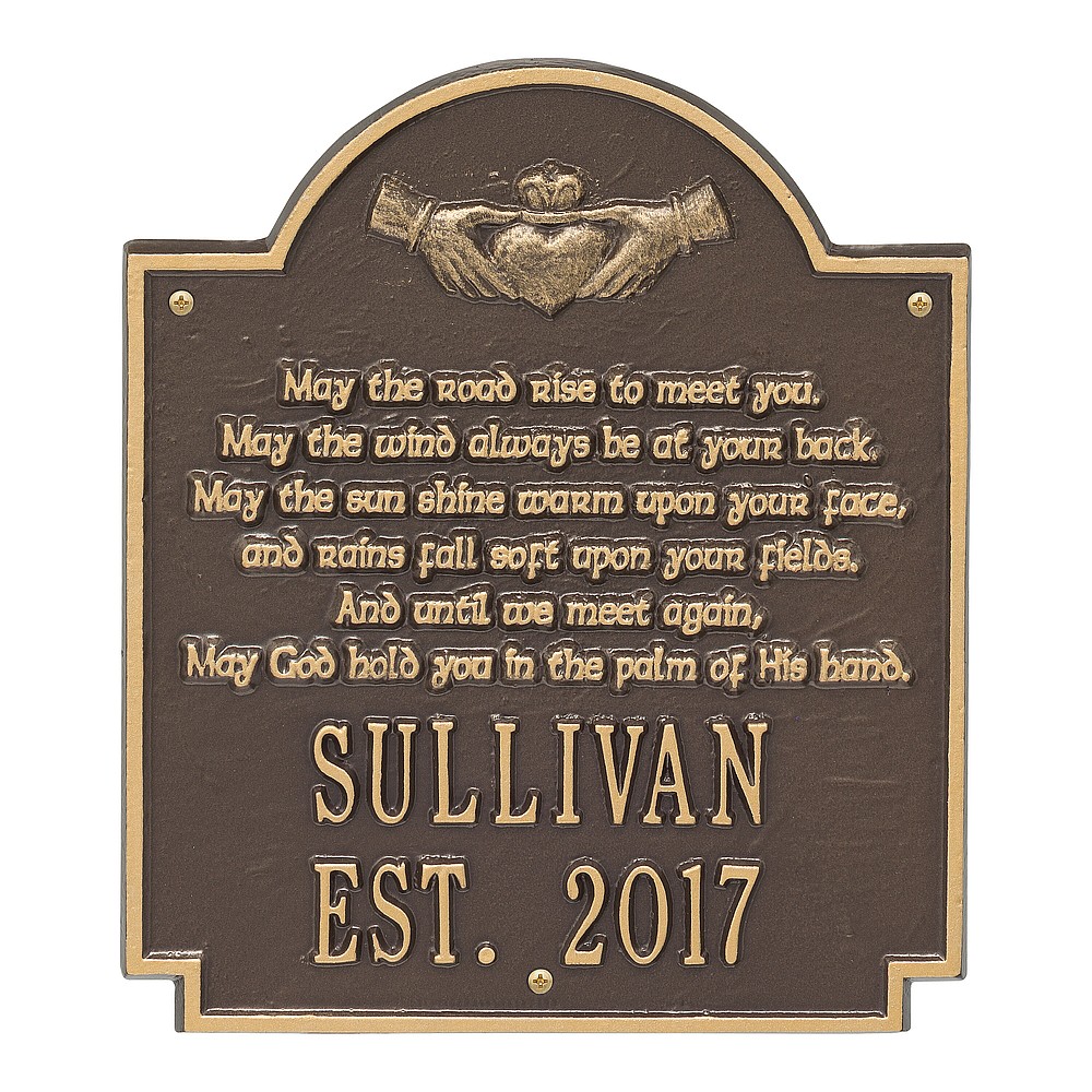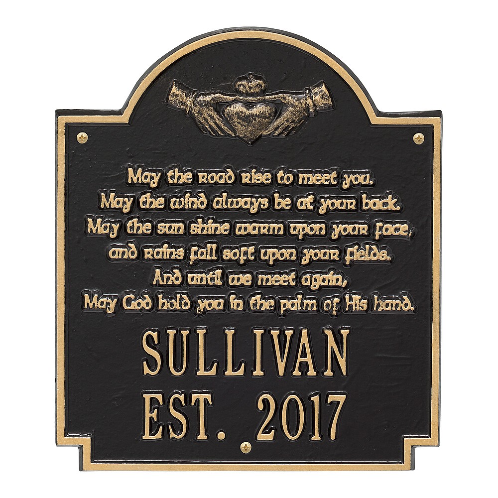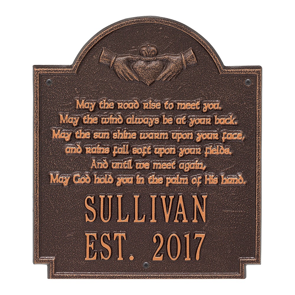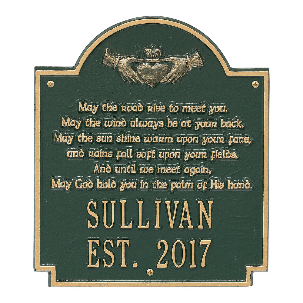 Dimensions (LxWxH): 10.75 x 12.25 The Claddagh Poem Plaque features the notable Irish Claddagh symbol of love, friendship, and loyalty, alongside the Irish Blessing, “May the road rise to meet you. May the wind always be at your back. May the sun shine warm upon your face, and rains fall soft upon your fields. And until we meet again, May God hold you in the palm of His hand.” Features a handmade, premium grade aluminum casting that showcases an intricate, detailed Irish design. Manufactured from cast, high-density aluminum alloy and protected by our exclusive Alumi-Shieldâ„¢ all weather coatings. Alumi-Shieldâ„¢ All Weather Coating: A Whitehall Exclusive Alumi-Shieldâ„¢ – Protects against the harshest weather and environmental elements. Extends the product life and maintains the look and function. Made in the USA.