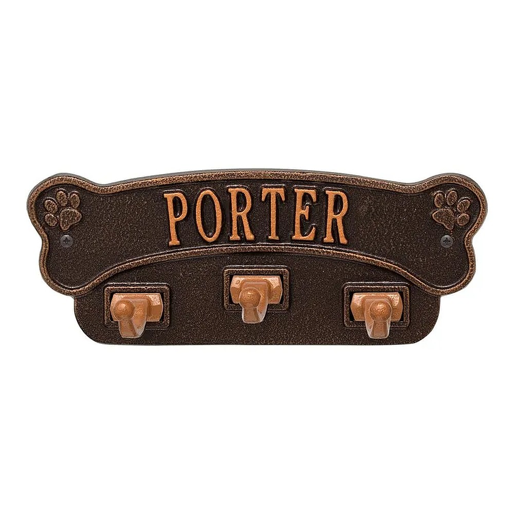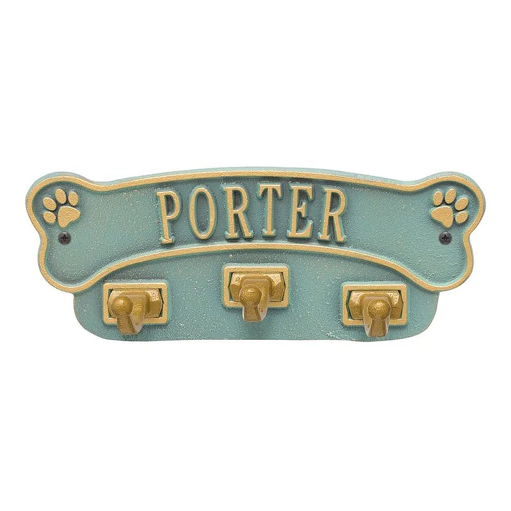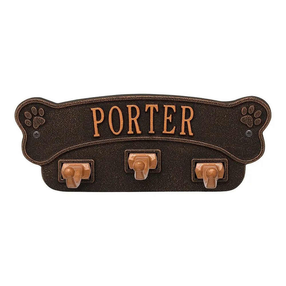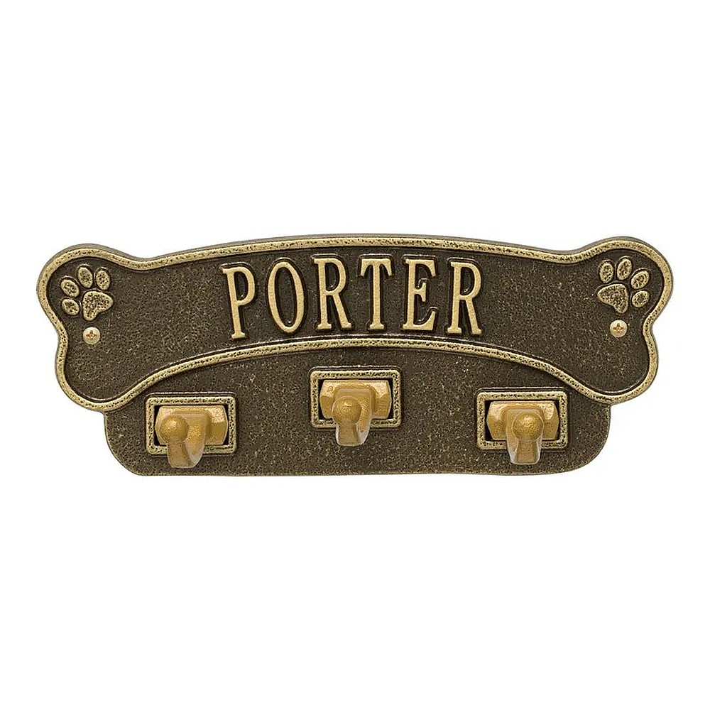 Assembled Dimensions Include Stakes (LxWxH): 11.375″ x 4.375″ x 3″ End the search for the missing leashes or other dog items! Keep them within reach with our personalized Dog Bone Wall Plaque with Hooks. The solid cast aluminum sign has a place to personalize it with your pet’s name or a short phrase. There are also 3 hooks to hang leashes or other hard to keep track of items. This wall plaque is a beautiful and whimsical place to store your pet items. Proudly made in the USA. Manufactured from recycled aluminum. Holds up to ten 1.25″ characters. Personalization is permanently cast into the plaque. Easy installation. Wall screws and hook hardware included. Alumi-Shieldâ„¢ – All Weather Coating protects against the harshest weather and environmental elements. Extends the product life and maintains the look and function.