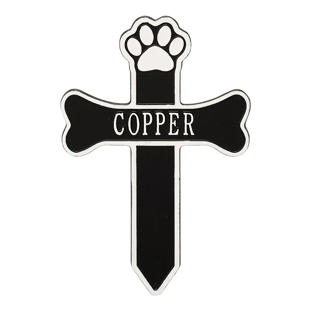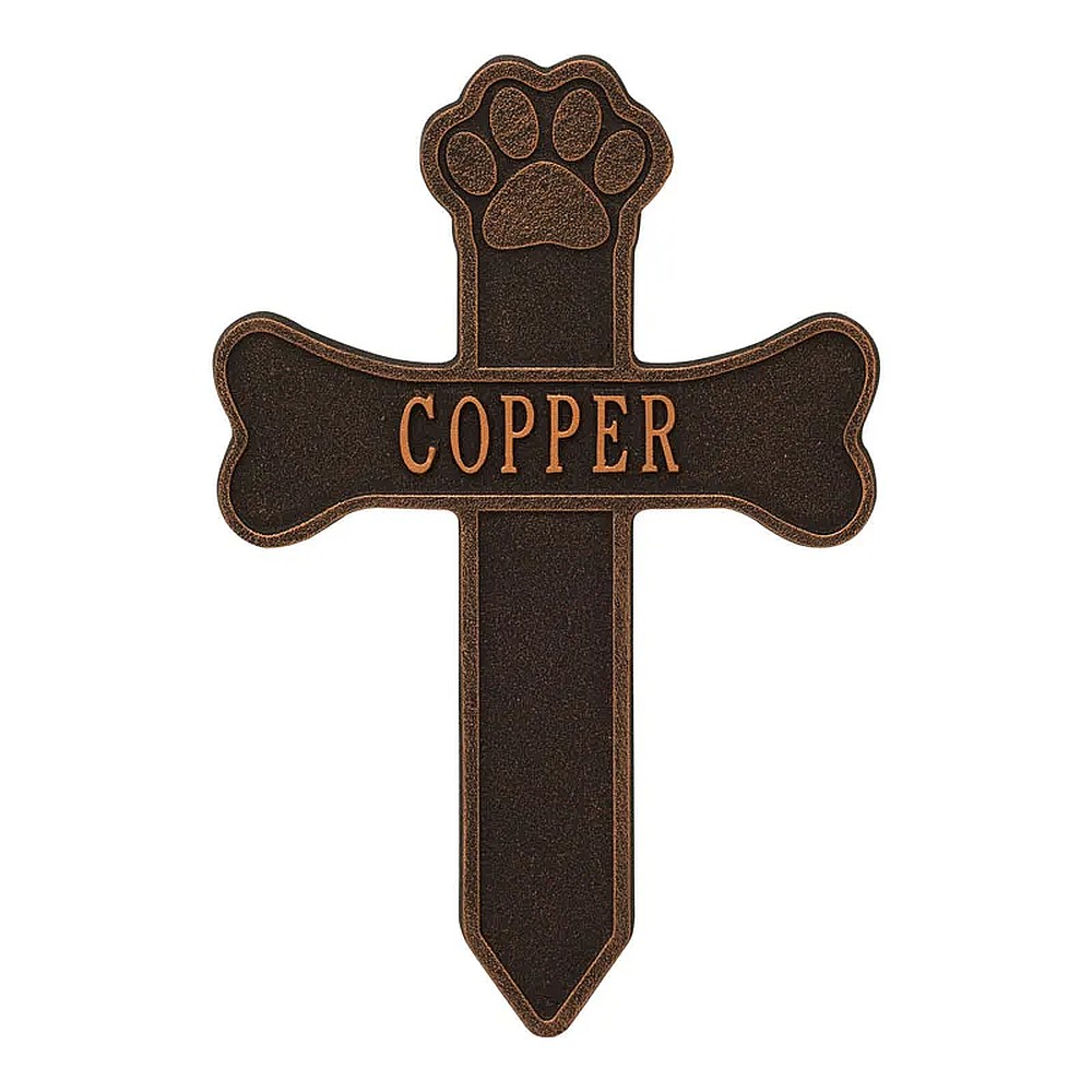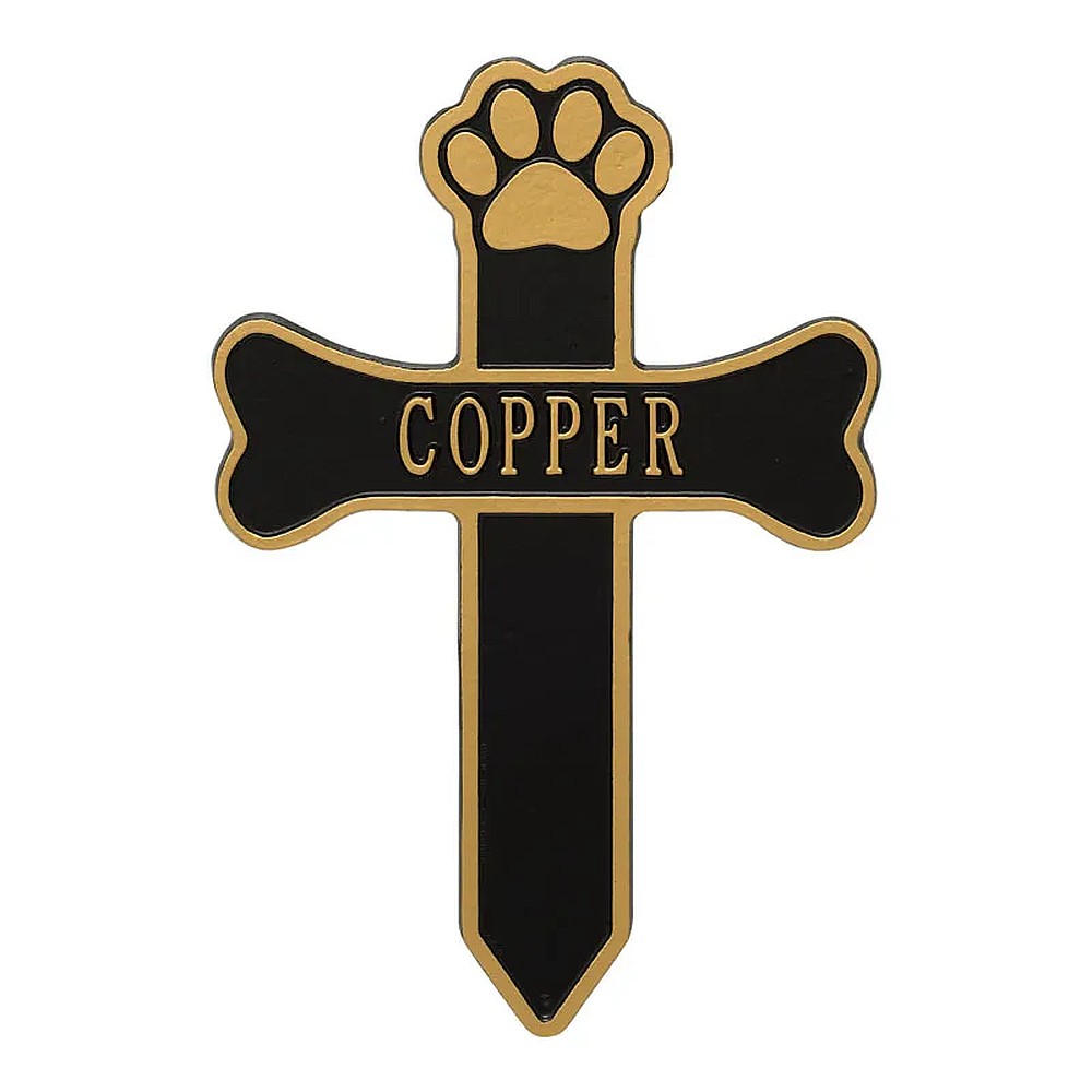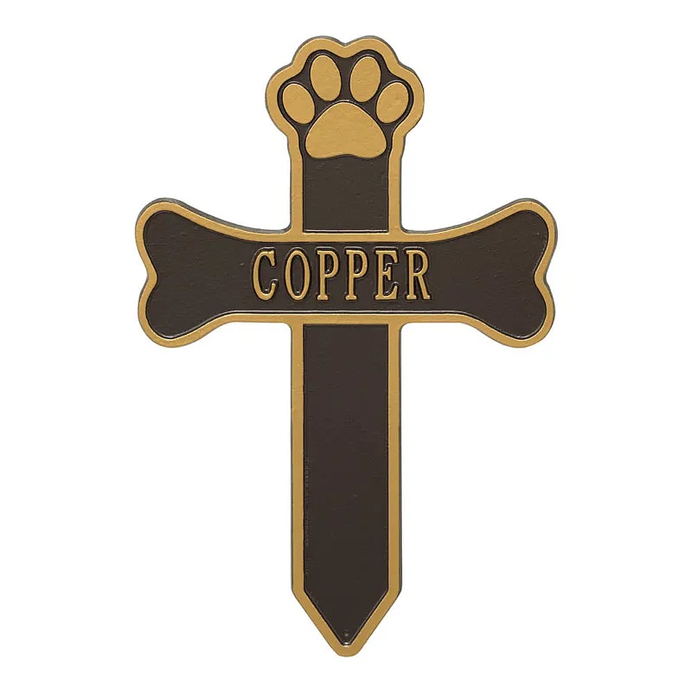 Assembled Dimensions Include Stakes (LxWxH): 10.875″ x 16″ x .325″ Keep your canine companion’s memory alive with this personalized Dog Paw and Bone Memorial Cross marker. Celebrate and honor the memory of your pet and create a lasting memorial with this solid cast aluminum garden marker. This unique lawn stake can be used to designate a favorite area in your yard, a play area, or the pet’s burial site. Features an easy-to-install design for staking the plaque to the ground. Proudly made in the USA. Manufactured from recycled aluminum. Holds up to twelve 1.25″ characters. Personalization is permanently cast into the plaque. Lawn piercing stake design makes for easy installation. Alumi-Shieldâ„¢ – All Weather Coating protects against the harshest weather and environmental elements. Extends the product life and maintains the look and function.