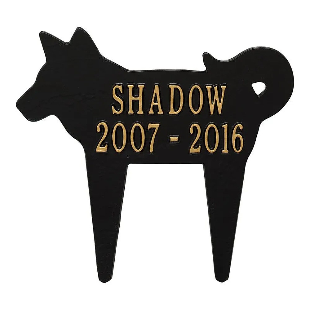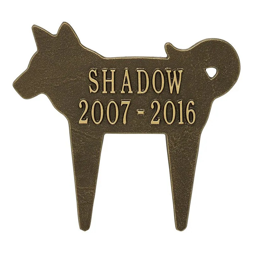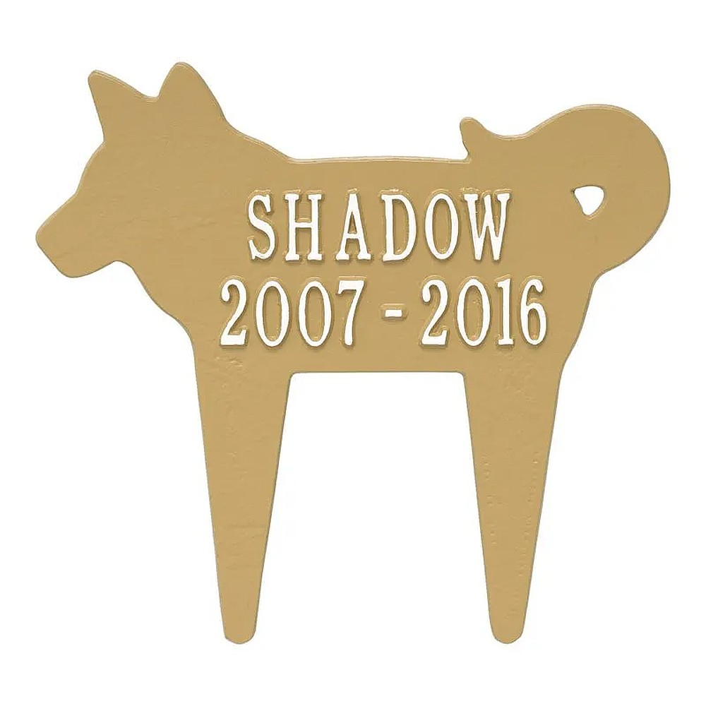 Assembled Dimensions Include Stakes (LxWxH): 12.25″ x 11.25″ x 0.375 Keep your canine companion’s memory alive with this Dog Silhouette personalized pet memorial marker. Celebrate and honor the memory of your pet and create a lasting memorial with this solid cast aluminum garden marker. This unique lawn stake can be used to designate a favorite area in your yard, a play area, or the pet’s burial site. Features an easy-to-install design for staking the plaque to the ground. Proudly made in the USA. Manufactured from recycled aluminum. Line 1 holds up to ten 1.25″ characters. Line 2 holds up to ten 1.25″characters. Personalization is permanently cast into the plaque. Lawn piercing stake design makes for easy installation. Alumi-Shieldâ„¢ – All Weather Coating protects against the harshest weather and environmental elements. Extends the product life and maintains the look and function.