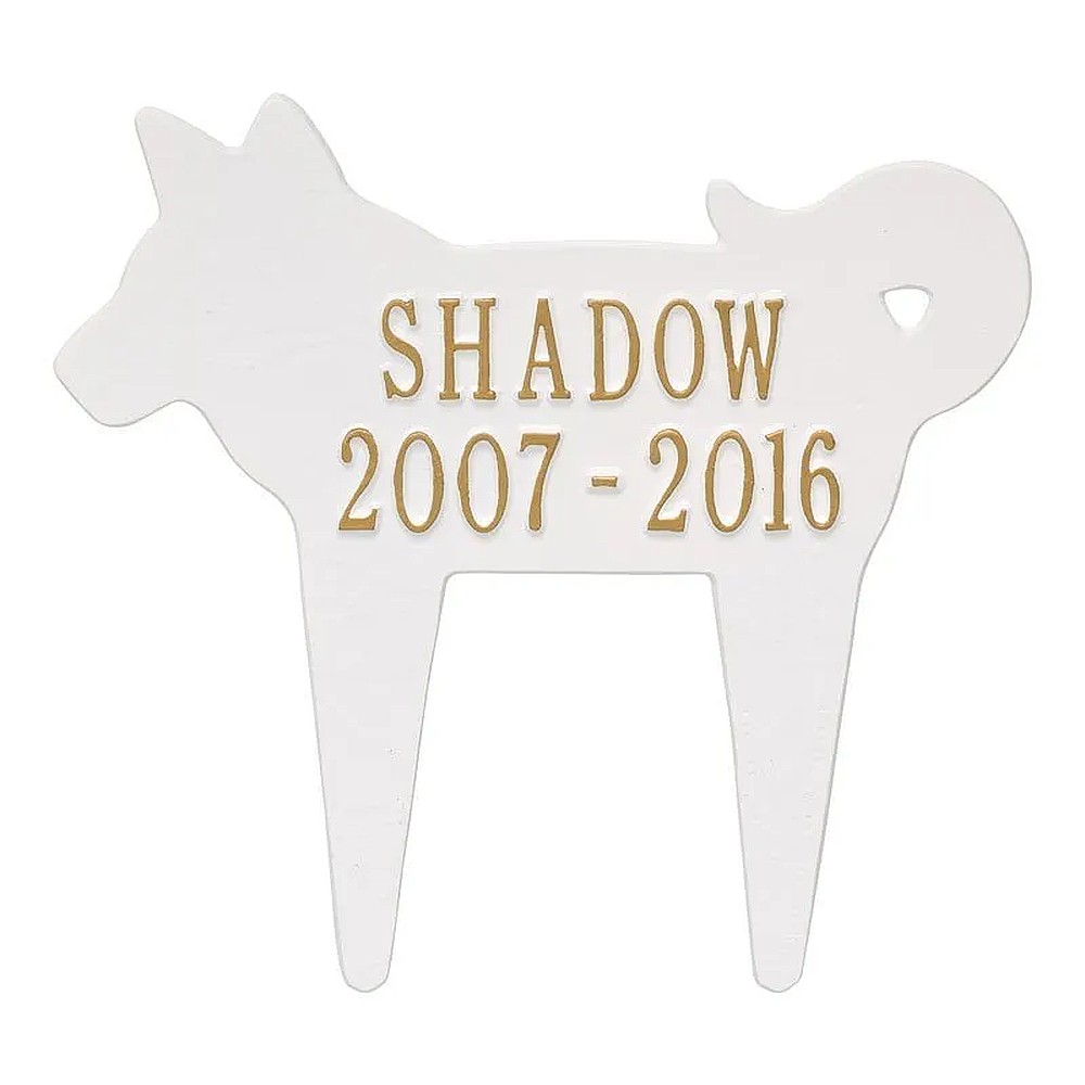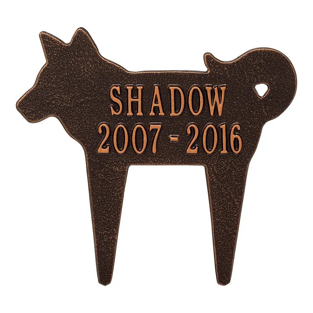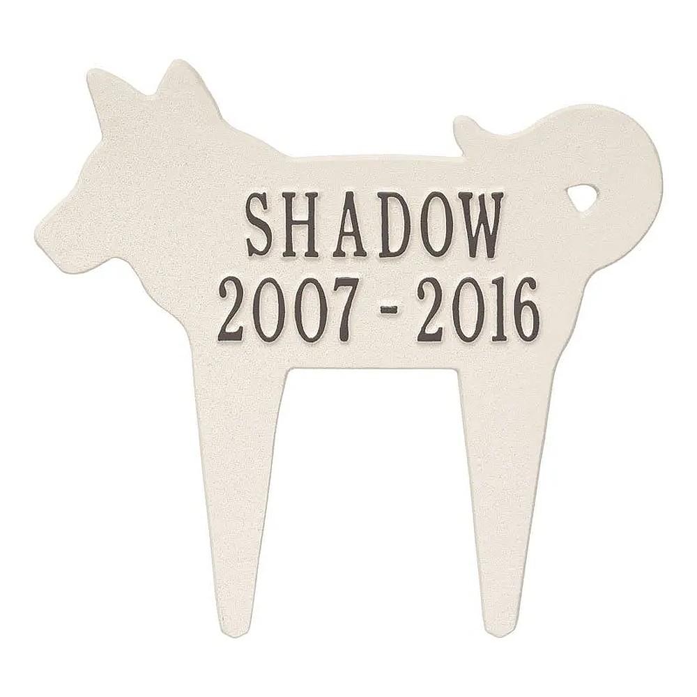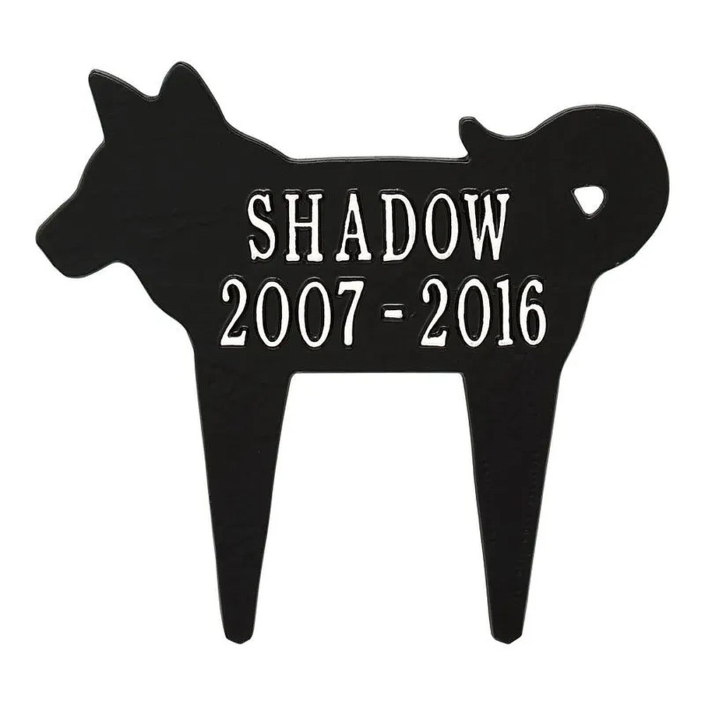 Assembled Dimensions Include Stakes (LxWxH): 12.25″ x 11.25″ x 0.375 Keep your canine companion’s memory alive with this Dog Silhouette personalized pet memorial marker. Celebrate and honor the memory of your pet and create a lasting memorial with this solid cast aluminum garden marker. This unique lawn stake can be used to designate a favorite area in your yard, a play area, or the pet’s burial site. Features an easy-to-install design for staking the plaque to the ground. Proudly made in the USA. Manufactured from recycled aluminum. Line 1 holds up to ten 1.25″ characters. Line 2 holds up to ten 1.25″characters. Personalization is permanently cast into the plaque. Lawn piercing stake design makes for easy installation. Alumi-Shieldâ„¢ – All Weather Coating protects against the harshest weather and environmental elements. Extends the product life and maintains the look and function.