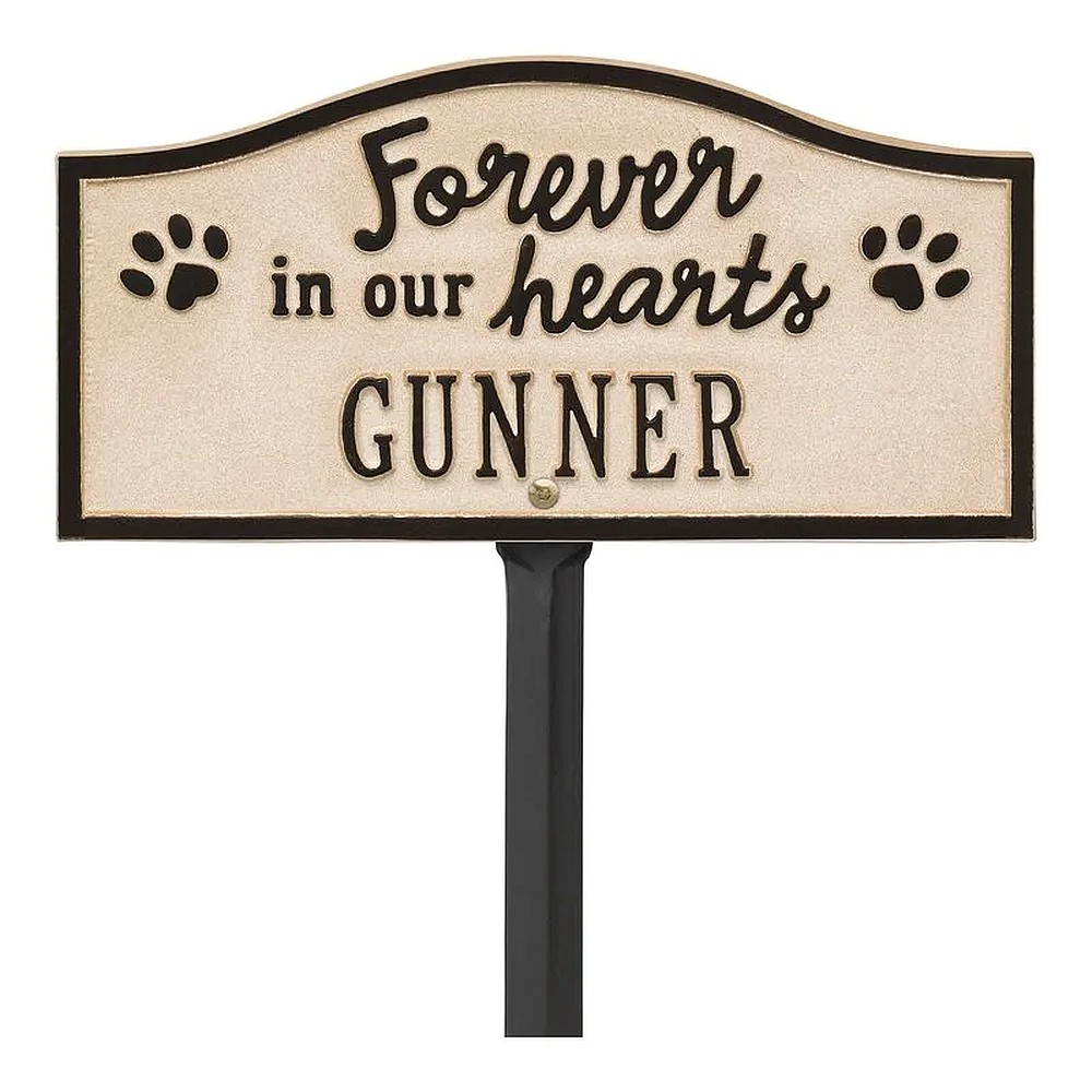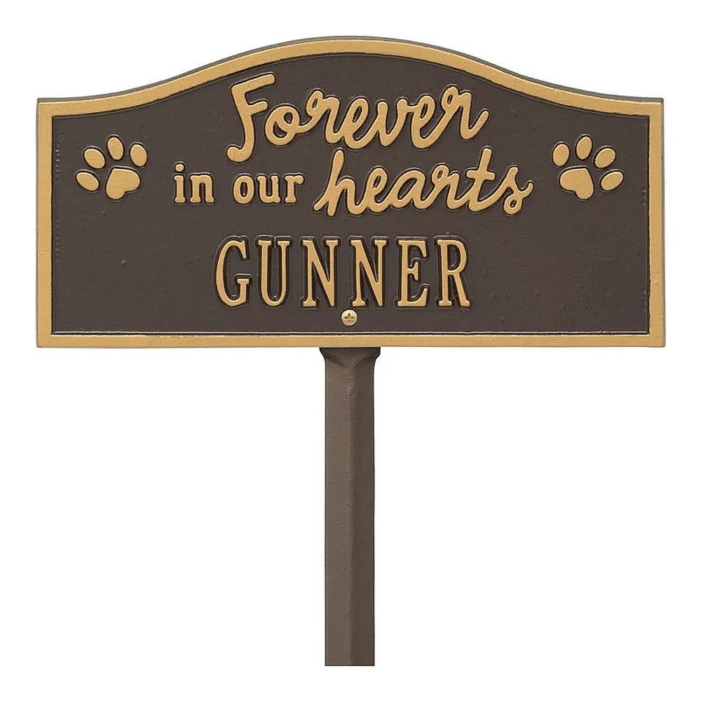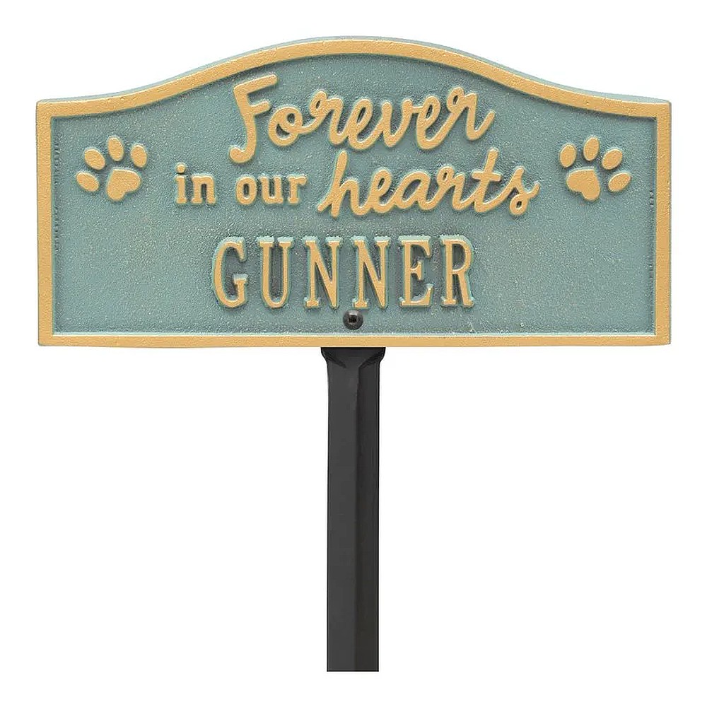 Assembled Dimensions Include Stakes (LxWxH): 12″ x 24″ x 0.25″ Celebrate and honor the beloved pet who has crossed the rainbow bridge with this solid cast aluminum memorial marker. The personalized Forever in Our Hearts plaque can be used to mark a favorite area in your yard, a play area, or the pet’s burial site. Features an easy-to-install lawn stake assembly. Proudly made in the USA. Manufactured from recycled aluminum. Holds up to ten 1.25″ characters. Personalization is permanently cast into the plaque. Easy installation. Lawn stake and hardware included. Alumi-Shieldâ„¢ – All Weather Coating protects against the harshest weather and environmental elements. Extends the product life and maintains the look and function.