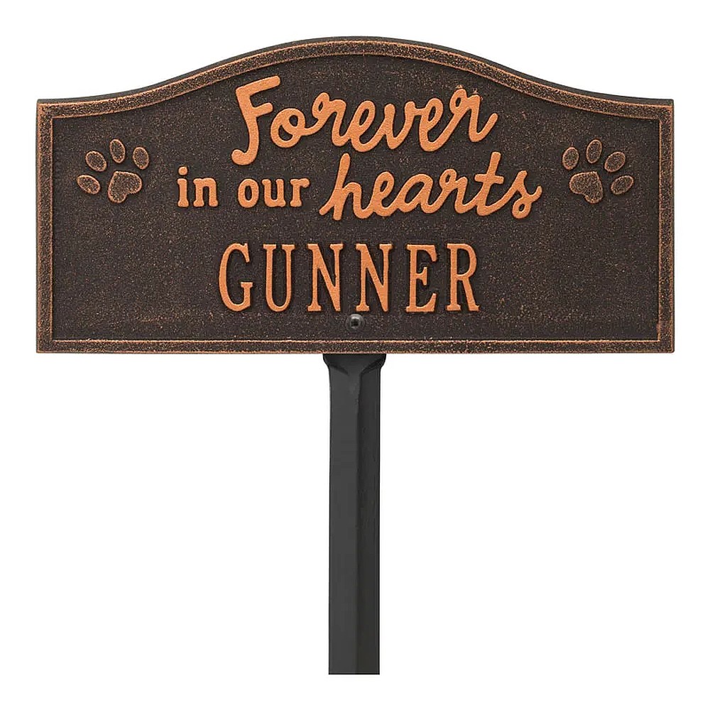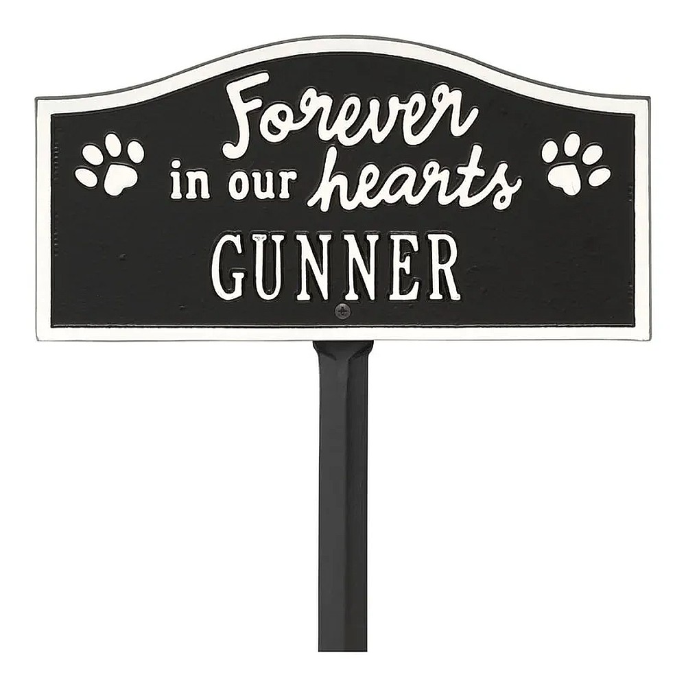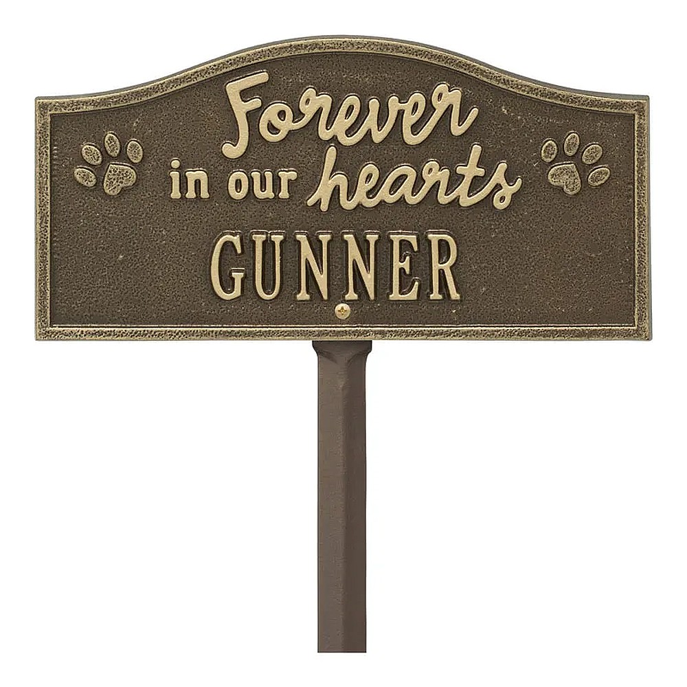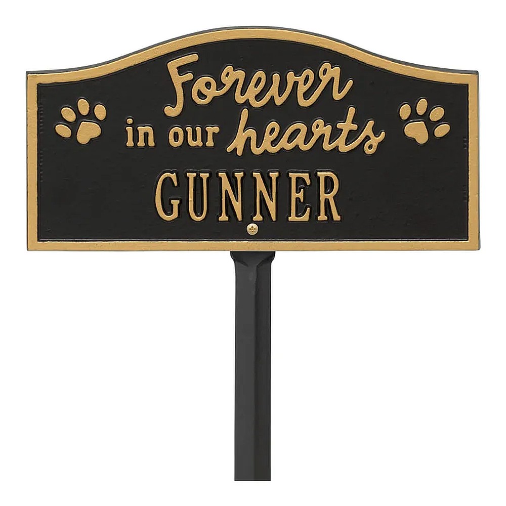 Assembled Dimensions Include Stakes (LxWxH): 12″ x 24″ x 0.25″ Celebrate and honor the beloved pet who has crossed the rainbow bridge with this solid cast aluminum memorial marker. The personalized Forever in Our Hearts plaque can be used to mark a favorite area in your yard, a play area, or the pet’s burial site. Features an easy-to-install lawn stake assembly. Proudly made in the USA. Manufactured from recycled aluminum. Holds up to ten 1.25″ characters. Personalization is permanently cast into the plaque. Easy installation. Lawn stake and hardware included. Alumi-Shieldâ„¢ – All Weather Coating protects against the harshest weather and environmental elements. Extends the product life and maintains the look and function.