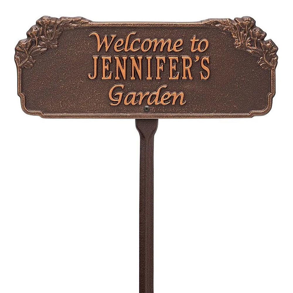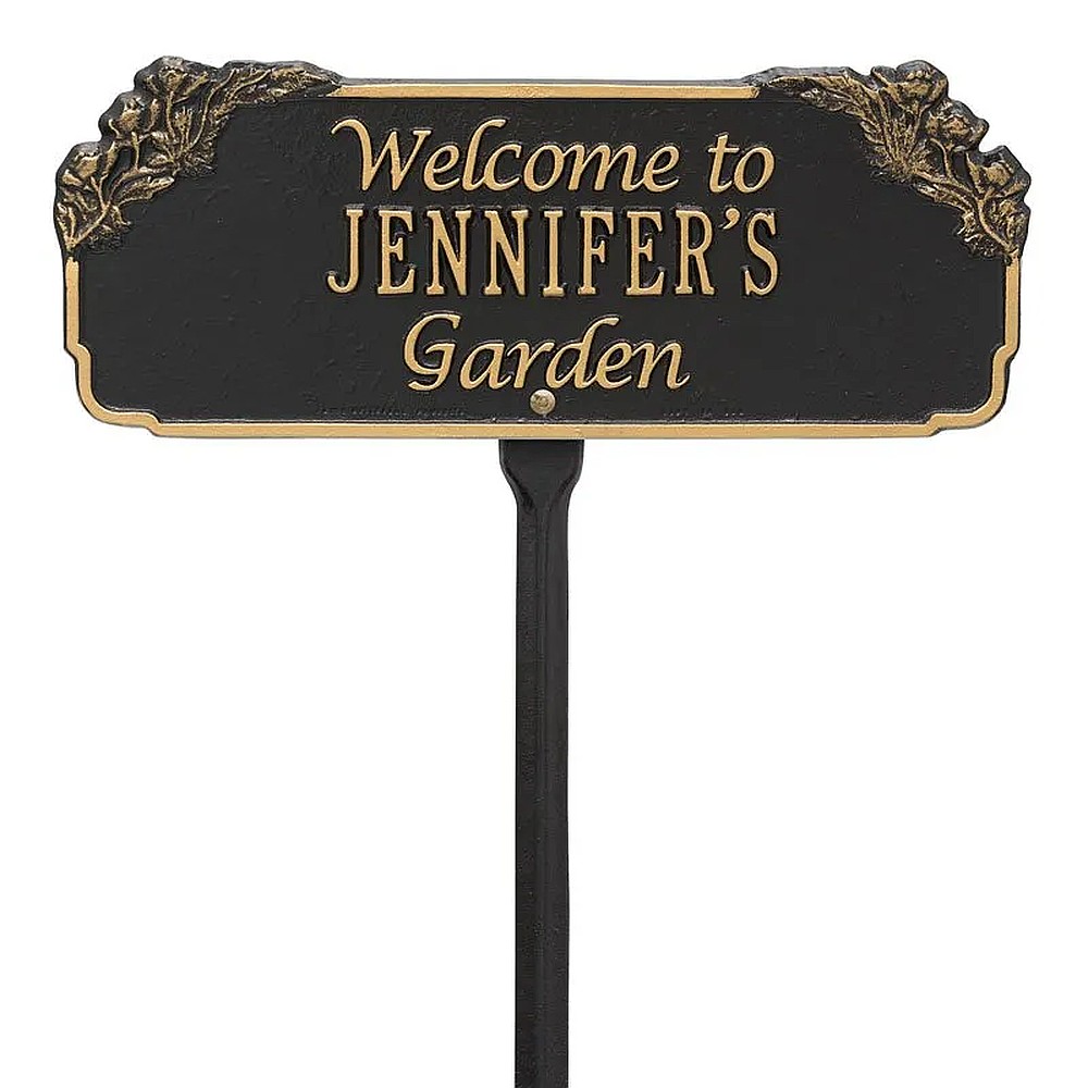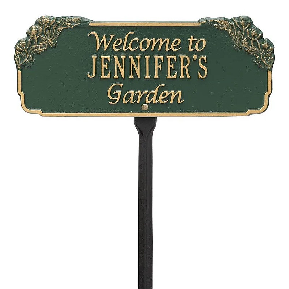 Assembled Dimensions Includes Stake (LxWxH): 14.75″ x 23.625″ x 0.375″ This elegant garden plaque features a delicately carved floral border alongside a message of welcome. The Garden Welcome Personalized Lawn Plaque is the perfect ornament to beautify any garden. Personalization is cast directly onto the plaque. Features carved ornamental border. “Welcome to” and “Garden” are cast directly onto the plaque. Proudly made in the USA. Includes one 18″ lawn stake. Manufactured from recycled aluminum. Alumi-Shieldâ„¢ – Protects against the harshest weather and environmental elements. Extends the product life and maintains the look and function.