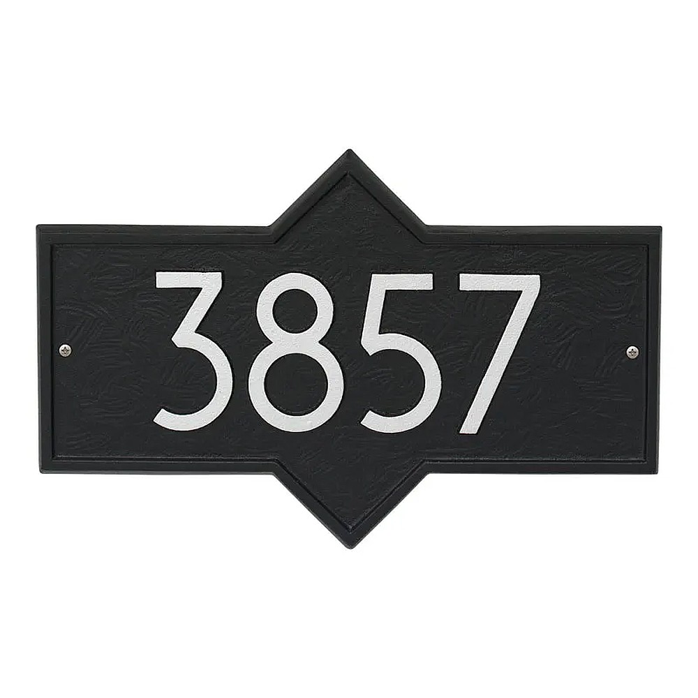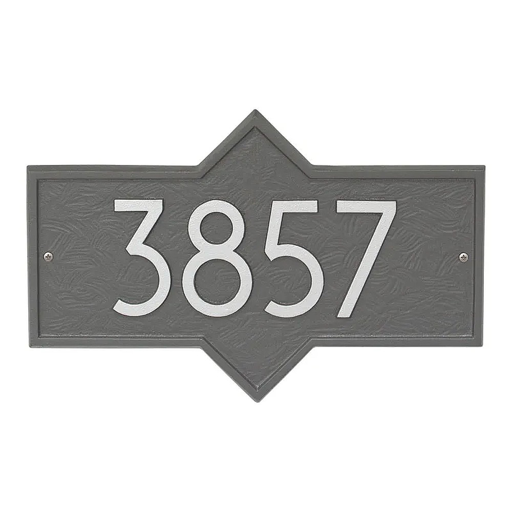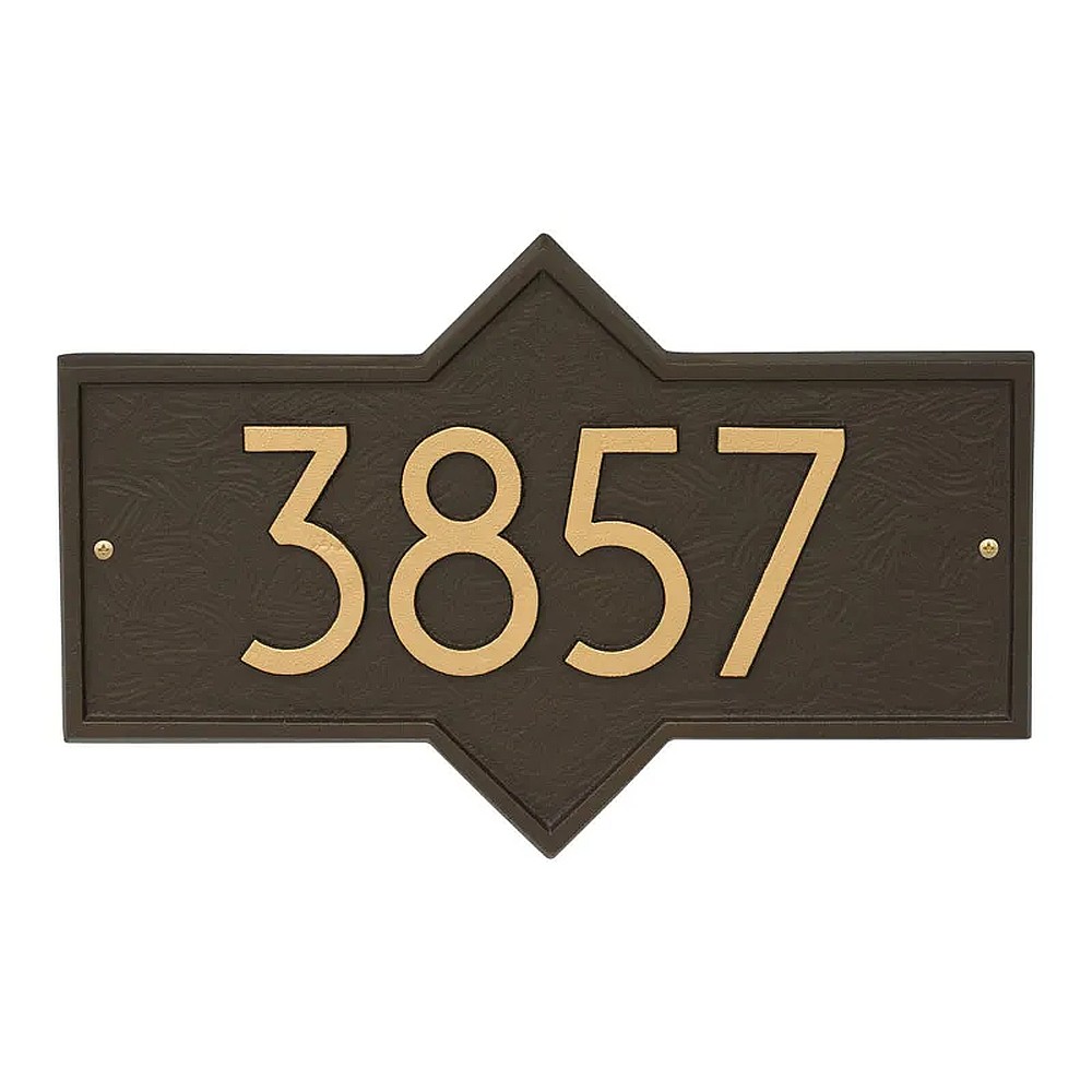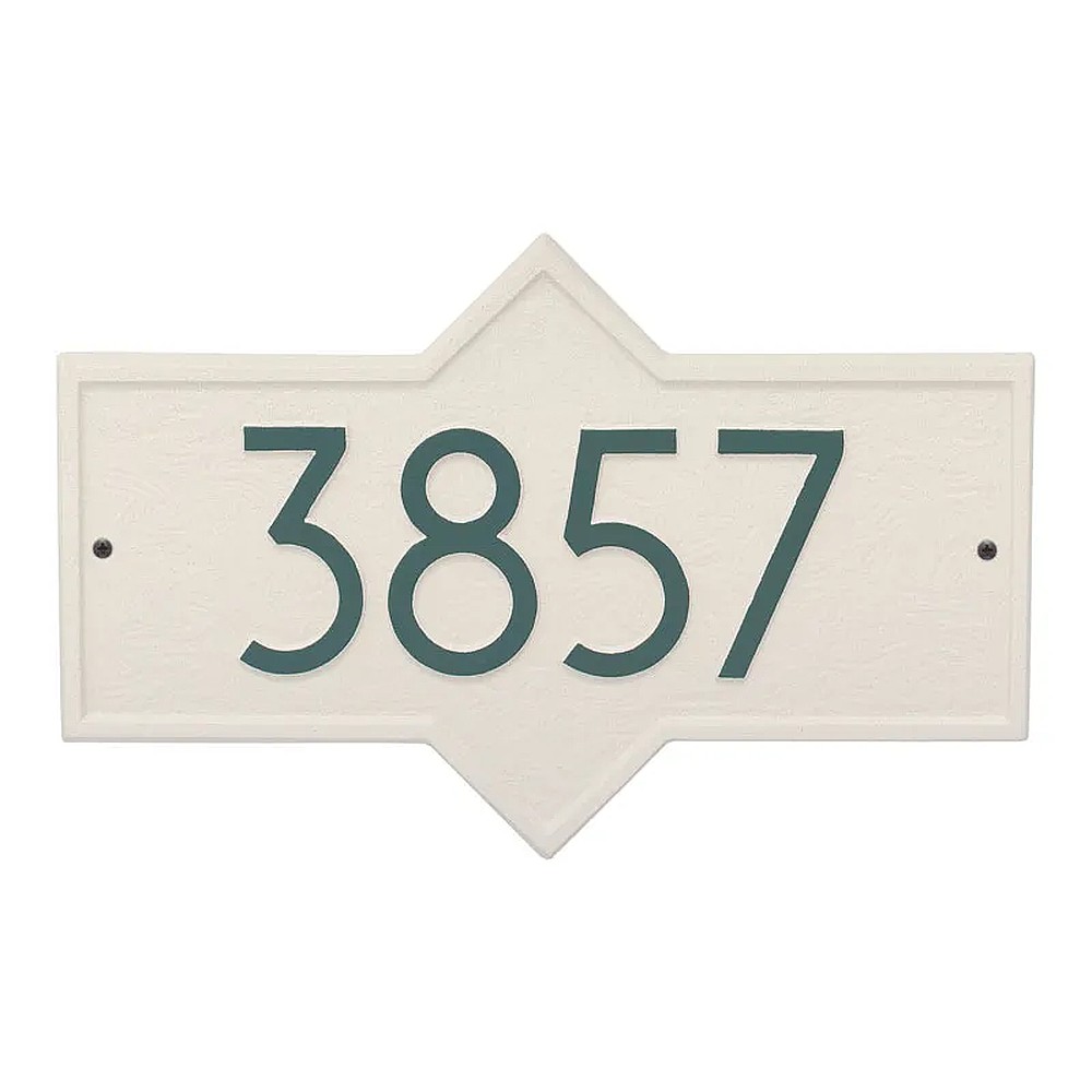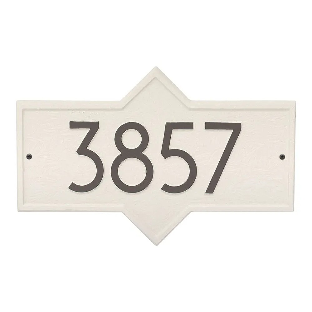 Dimensions (LxWxH): 15.75 x 10.25 x .325 Ramp up your curb appeal with the Hampton Modern address plaque. The combination of a contemporary font and subtle border give this plaque its modern look. Whitehall address plaques are proudly handcrafted in the USA using American materials and labor. Whitehall address plaques are suitable for all exterior applications. Made in the USA Cast from recycled aluminum – will not rust. Alumi-Shieldâ„¢ All Weather Coatings: A Whitehall Exclusive Enhances curb appeal while adding value to your home