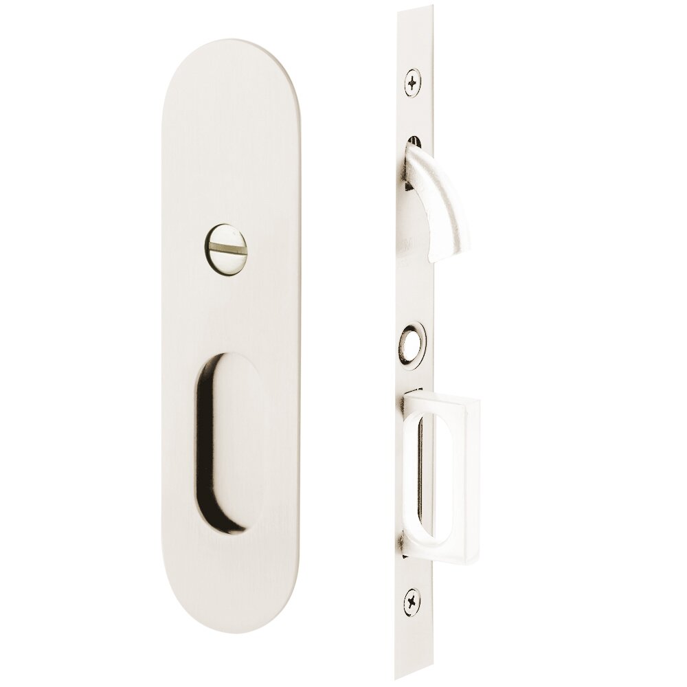 The Narrow Oval Pocket Door Mortise Lock offers a clean, contemporary trim style and high-quality lock for your sliding interior doors. This item is a well-crafted mortise lock with an integrated push button activated edge pull, and is offered in keyed, privacy, passage or dummy applications.