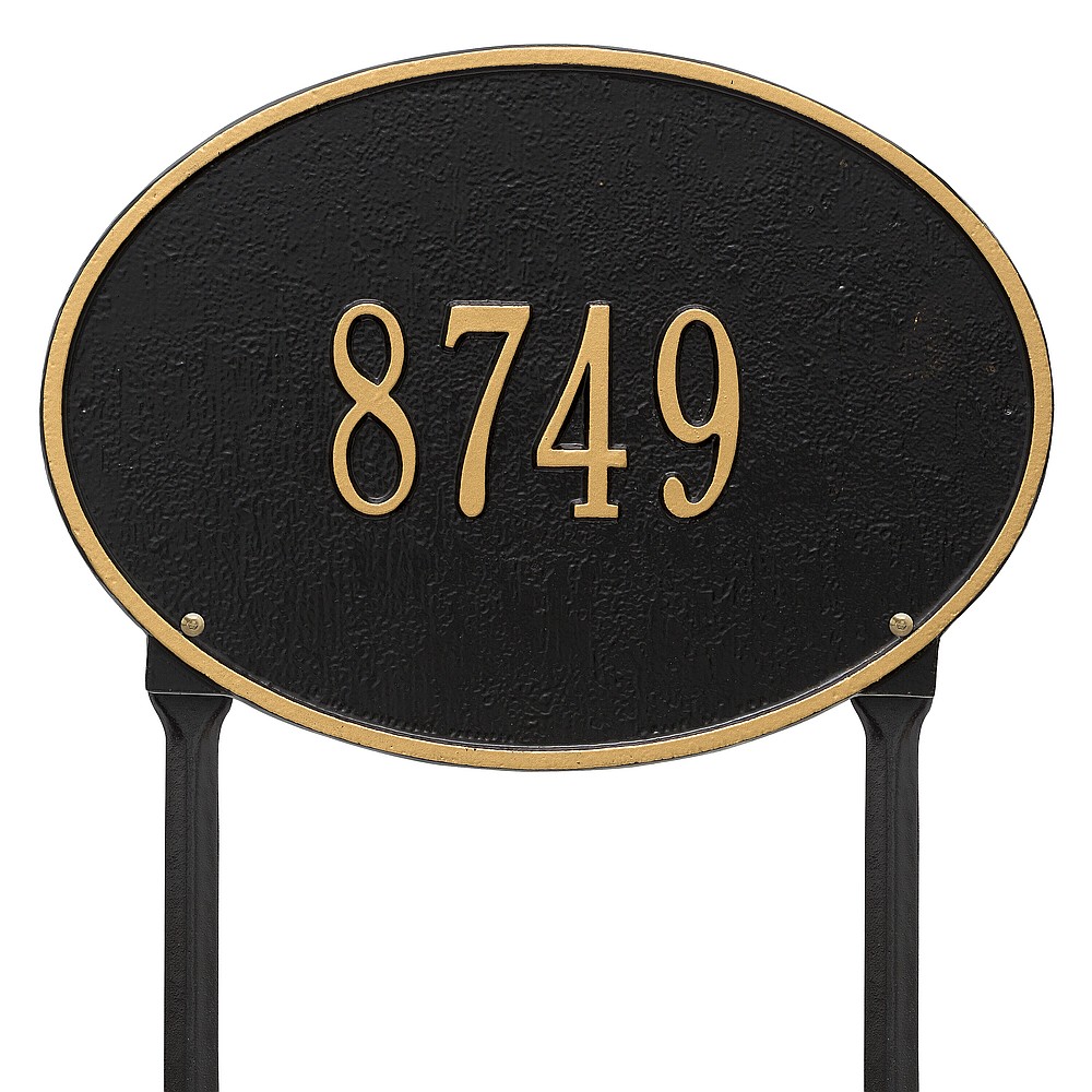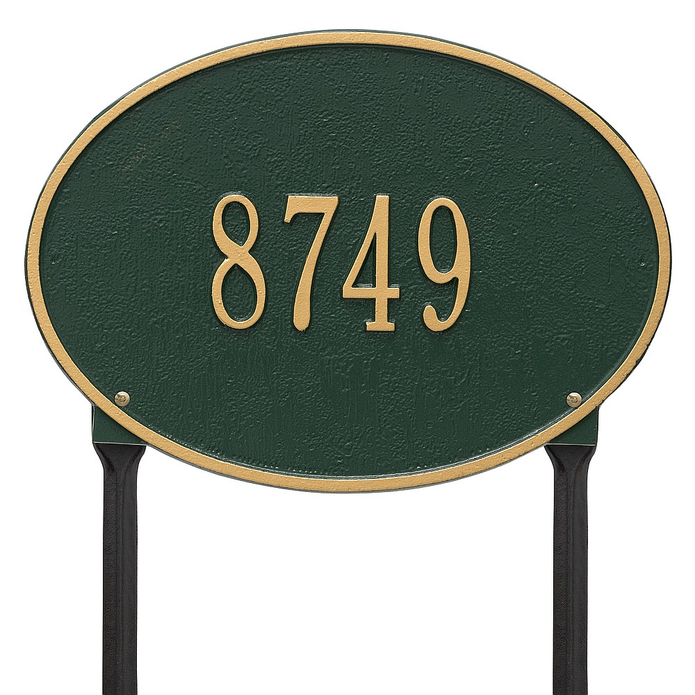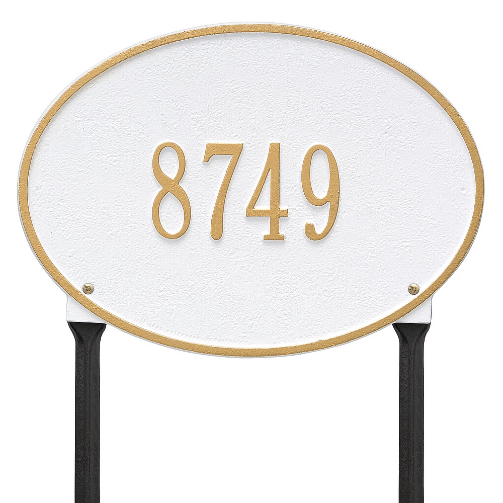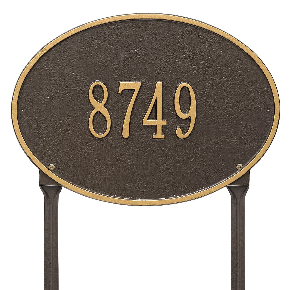 5 – 3″ characters The classic oval design of our Hawthorne Address Plaques makes it ideal for most any home’s exterior. Available in a variety of finish colors to accommodate your outdoor color scheme. Made in the USA Cast from recycled aluminum – will not rust. Alumi-Shield™ All Weather Coatings: A Whitehall Exclusive Enhances curb appeal while adding value to your home Personalization is permanently cast into the sign