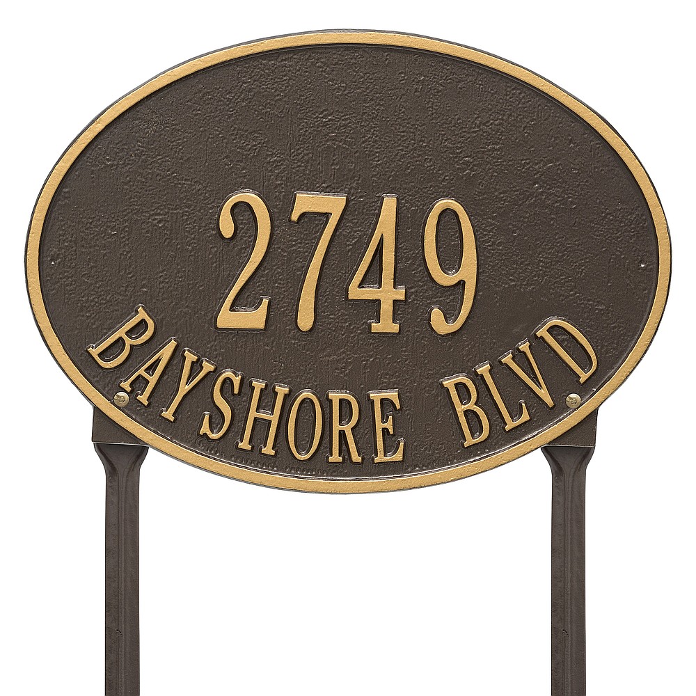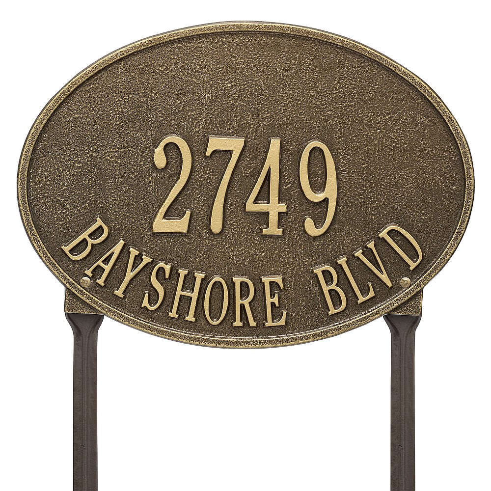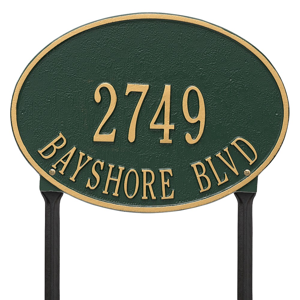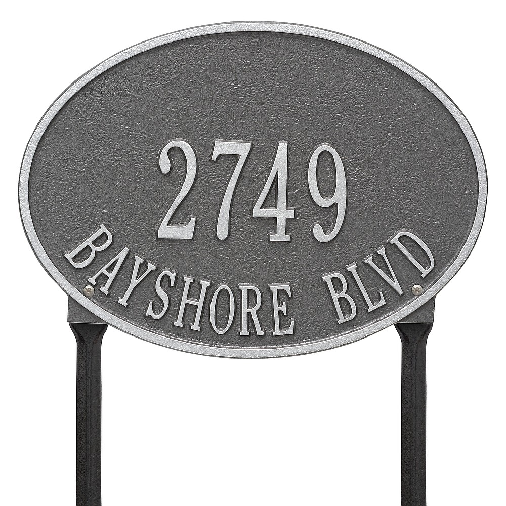 Line 1: 5 – 3″ characters Line 2: 14 – 1.5″ characters The classic oval design of our Hawthorne Address Plaques makes it ideal for most any home’s exterior. Available in a variety of finish colors to accommodate your outdoor color scheme. Made in the USA Cast from recycled aluminum – will not rust. Alumi-Shield™ All Weather Coatings: A Whitehall Exclusive Enhances curb appeal while adding value to your home Personalization is permanently cast into the sign
