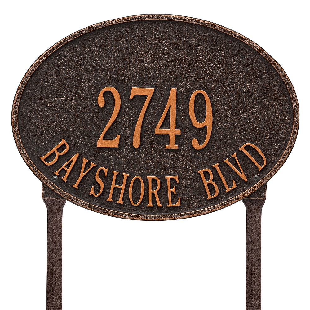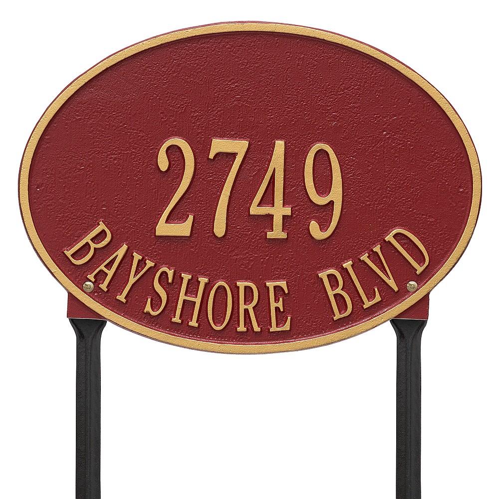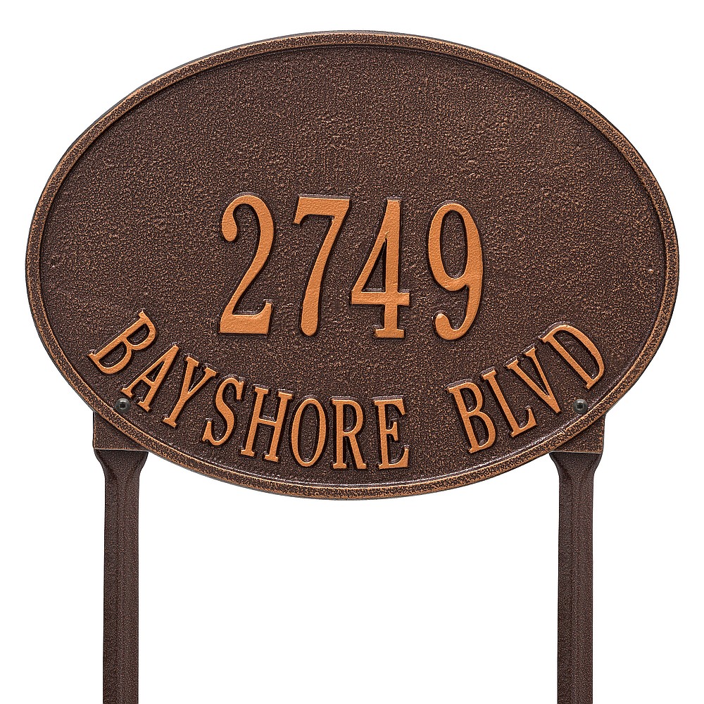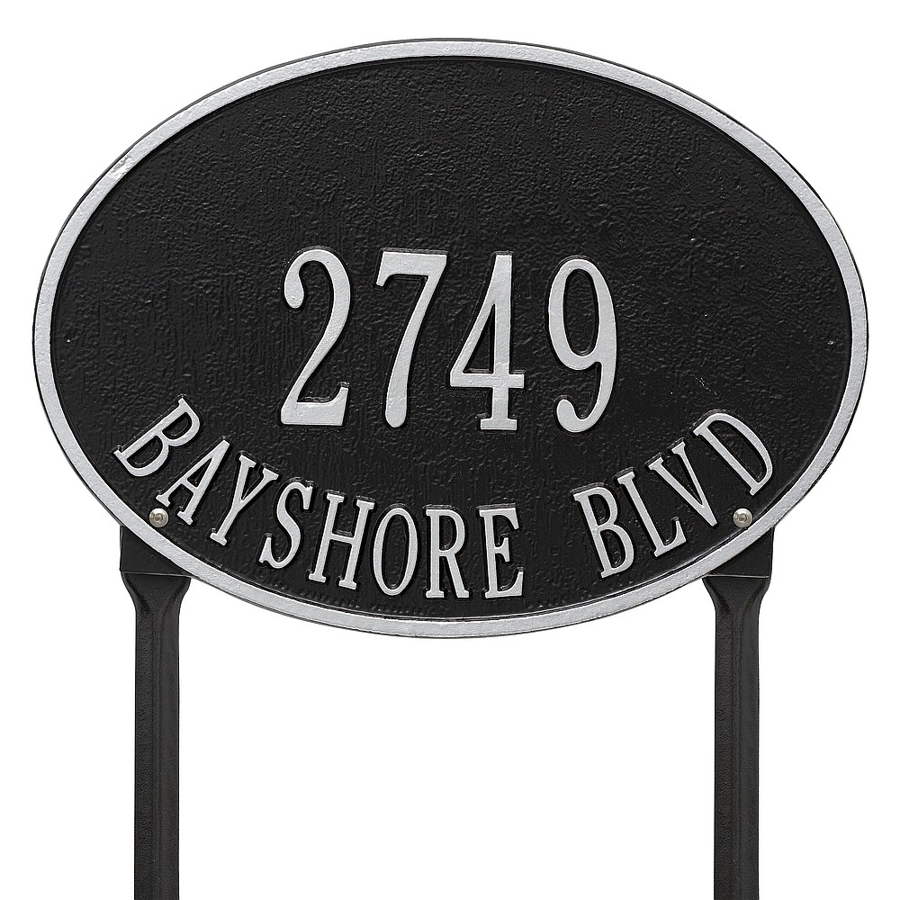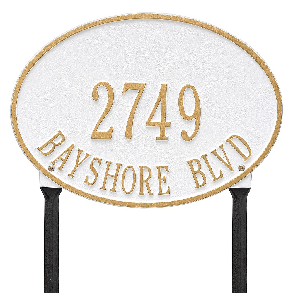 Line 1: 5 – 3″ characters Line 2: 14 – 1.5″ characters The classic oval design of our Hawthorne Address Plaques makes it ideal for most any home’s exterior. Available in a variety of finish colors to accommodate your outdoor color scheme. Made in the USA Cast from recycled aluminum – will not rust. Alumi-Shield™ All Weather Coatings: A Whitehall Exclusive Enhances curb appeal while adding value to your home Personalization is permanently cast into the sign