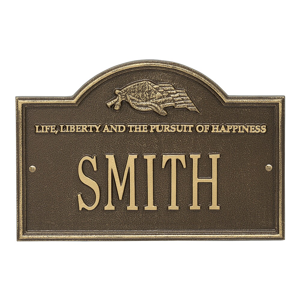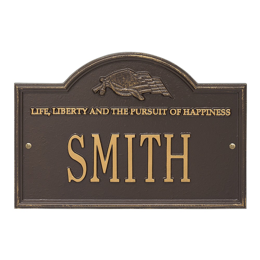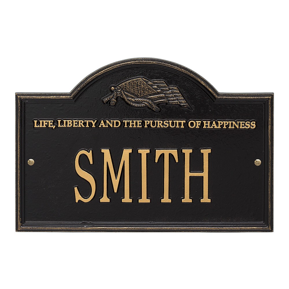Dimensions (LxWxH): 14.5″ x 9.75″ x .25″ Dimensions (LxWxH): 14.5″ x 9.75″ x .25″ Celebrate American patriotism and display these self evident truths; Life Liberty and the Pursuit of Happiness with this personalized plaque. A Personalized plaque is a perfect gift to commemorate all of life’s celebrations. Makes a great personalized wedding, anniversary, or house warming gift. Handcrafted aluminum plaque for indoor or outdoor use. The quote “life, liberty and the pursuit of happiness” is a permanent part of the design. Alumi-Shieldâ„¢ – Protects against the harshest weather and environmental elements. Extends the product life and maintains the look and function. Made in the USA. A Personalized plaque is a perfect gift to commemorate all of life’s celebrations. Makes a great personalized wedding, anniversary, or house warming gift. Handcrafted aluminum plaque for indoor or outdoor use. The quote “life, liberty and the pursuit of happiness” is a permanent part of the design. Alumi-Shieldâ„¢ – Protects against the harshest weather and environmental elements. Extends the product life and maintains the look and function. Made in the USA.