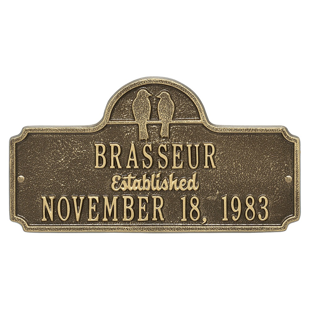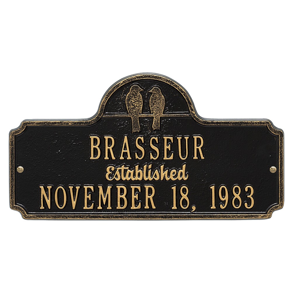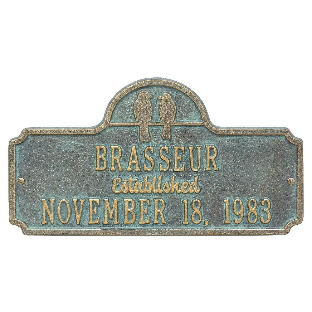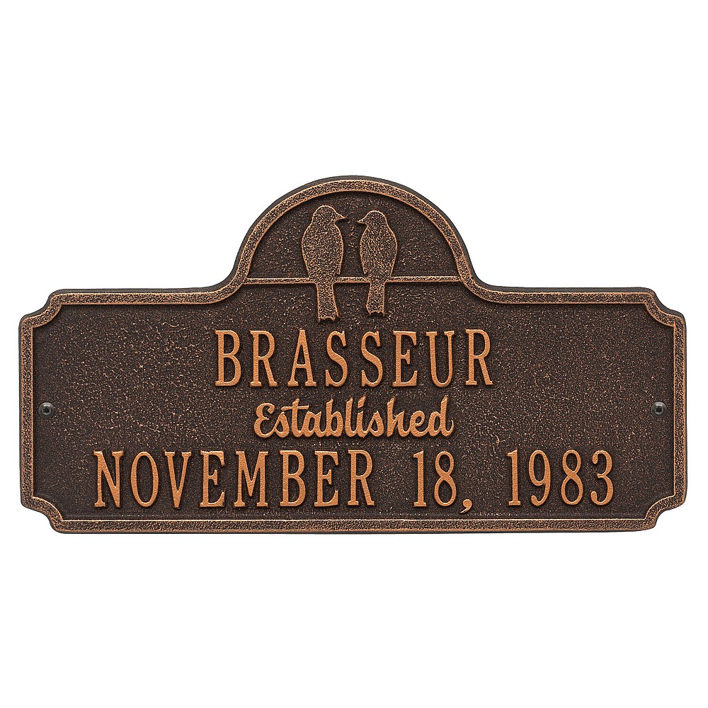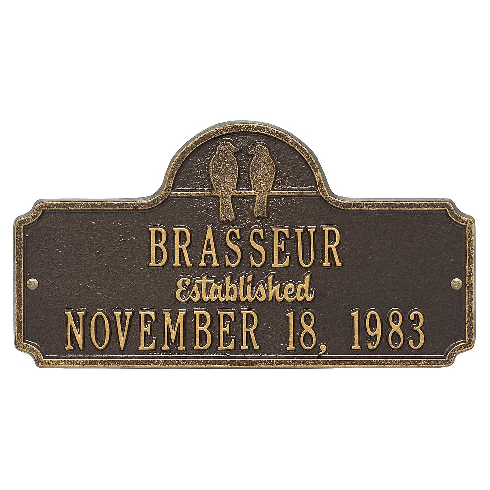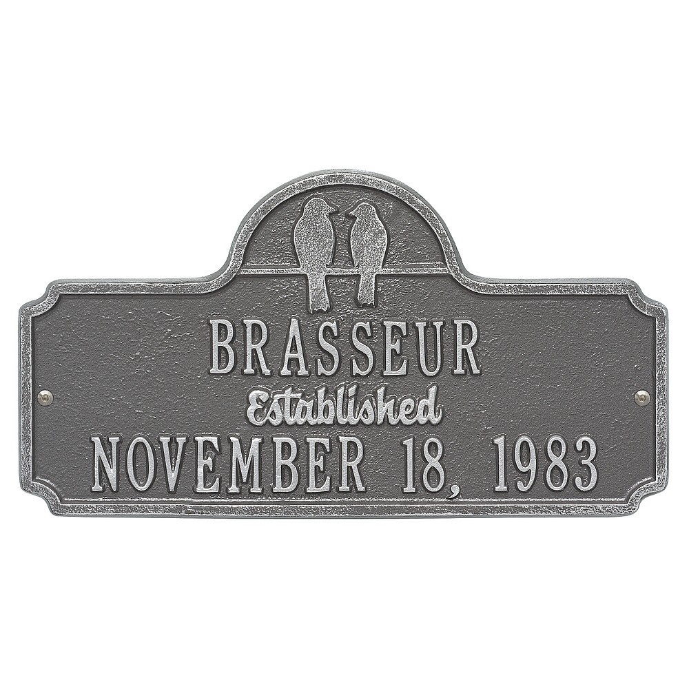 Dimensions (LxWxH): 15.0″ x 8.0″ x .32″ Dimensions (LxWxH): 15.0″ x 8.0″ x .32″ Two birds together on a wire until the sun sets is a perfect analogy for two people spending their lives together. The simplicity of outer shape and silhouetted bird design give this anniversary plaque its understated elegance. A Personalized plaque is a perfect gift to commemorate all of life’s celebrations. Makes a great personalized wedding, anniversary, or house warming gift. Handcrafted aluminum plaque for indoor or outdoor use. The word “established” is a permanent part of the design. Alumi-Shieldâ„¢ – Protects against the harshest weather and environmental elements. Extends the product life and maintains the look and function. Made in the USA. A Personalized plaque is a perfect gift to commemorate all of life’s celebrations. Makes a great personalized wedding, anniversary, or house warming gift. Handcrafted aluminum plaque for indoor or outdoor use. The word “established” is a permanent part of the design. Alumi-Shieldâ„¢ – Protects against the harshest weather and environmental elements. Extends the product life and maintains the look and function. Made in the USA.