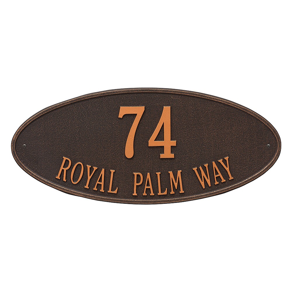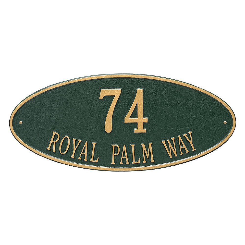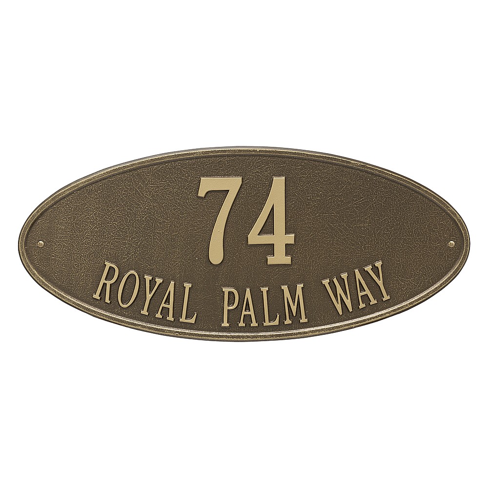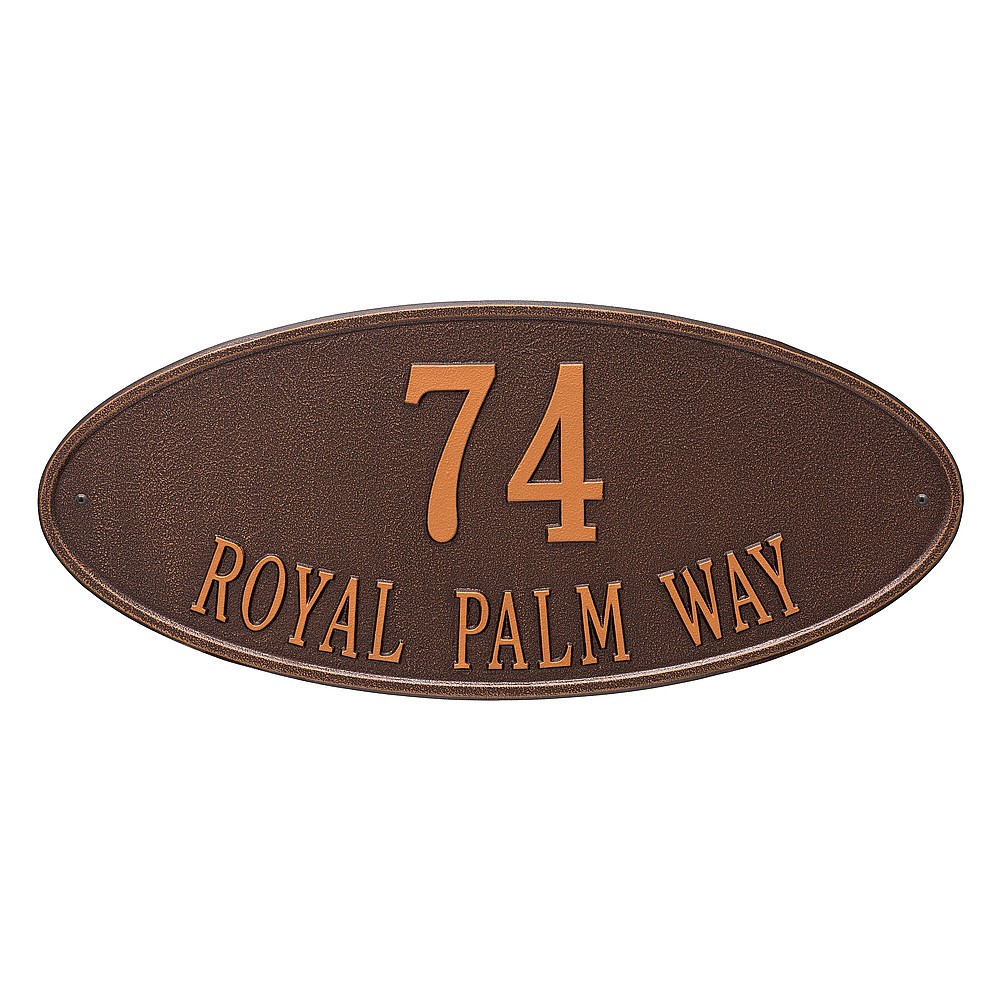 Line 1: 5 – 4.5″ numbers Line 2: 17 – 2″ characters The classic oval design of our Madison Address Plaques makes it ideal for most any home’s exterior. Available in a variety of finish colors to accommodate your outdoor color scheme. Made in the USA Cast from recycled aluminum – will not rust. Alumi-Shield™ All Weather Coatings: A Whitehall Exclusive Enhances curb appeal while adding value to your home Personalization is permanently cast into the sign