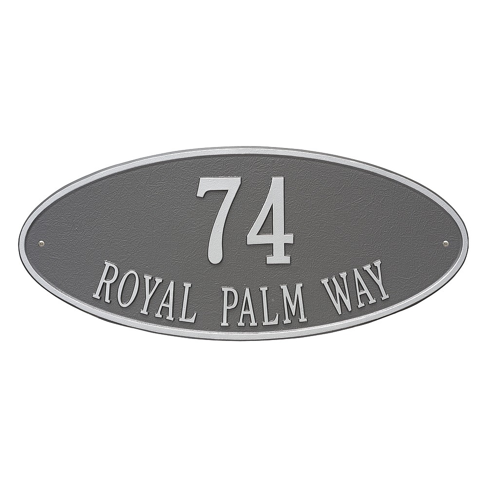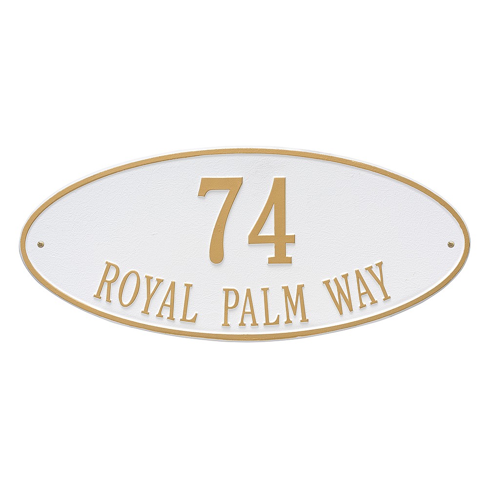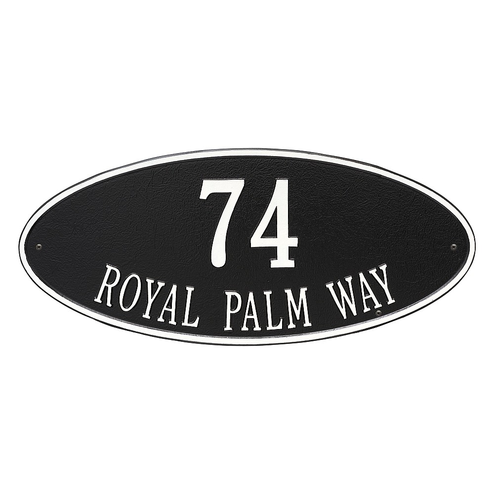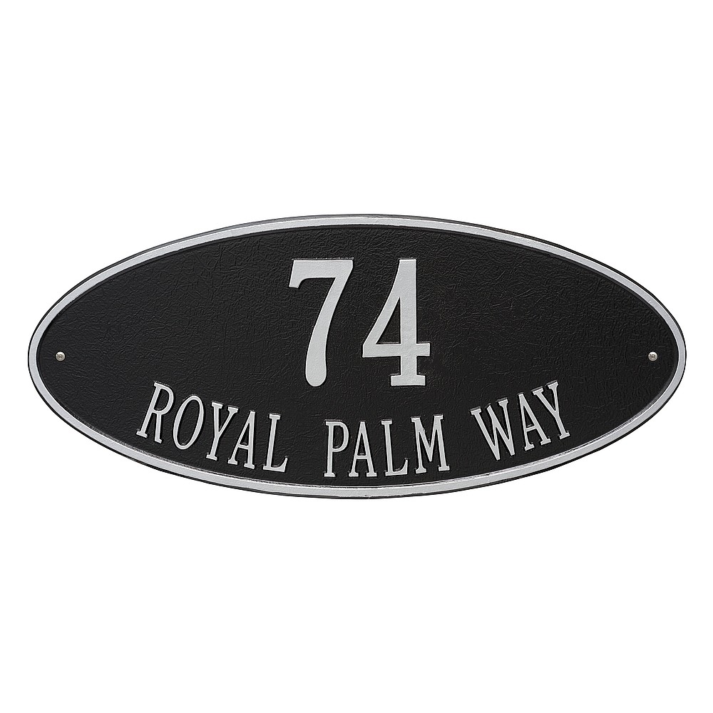 Line 1: 5 – 4.5″ numbers Line 2: 17 – 2″ characters The classic oval design of our Madison Address Plaques makes it ideal for most any home’s exterior. Available in a variety of finish colors to accommodate your outdoor color scheme. Made in the USA Cast from recycled aluminum – will not rust. Alumi-Shield™ All Weather Coatings: A Whitehall Exclusive Enhances curb appeal while adding value to your home Personalization is permanently cast into the sign