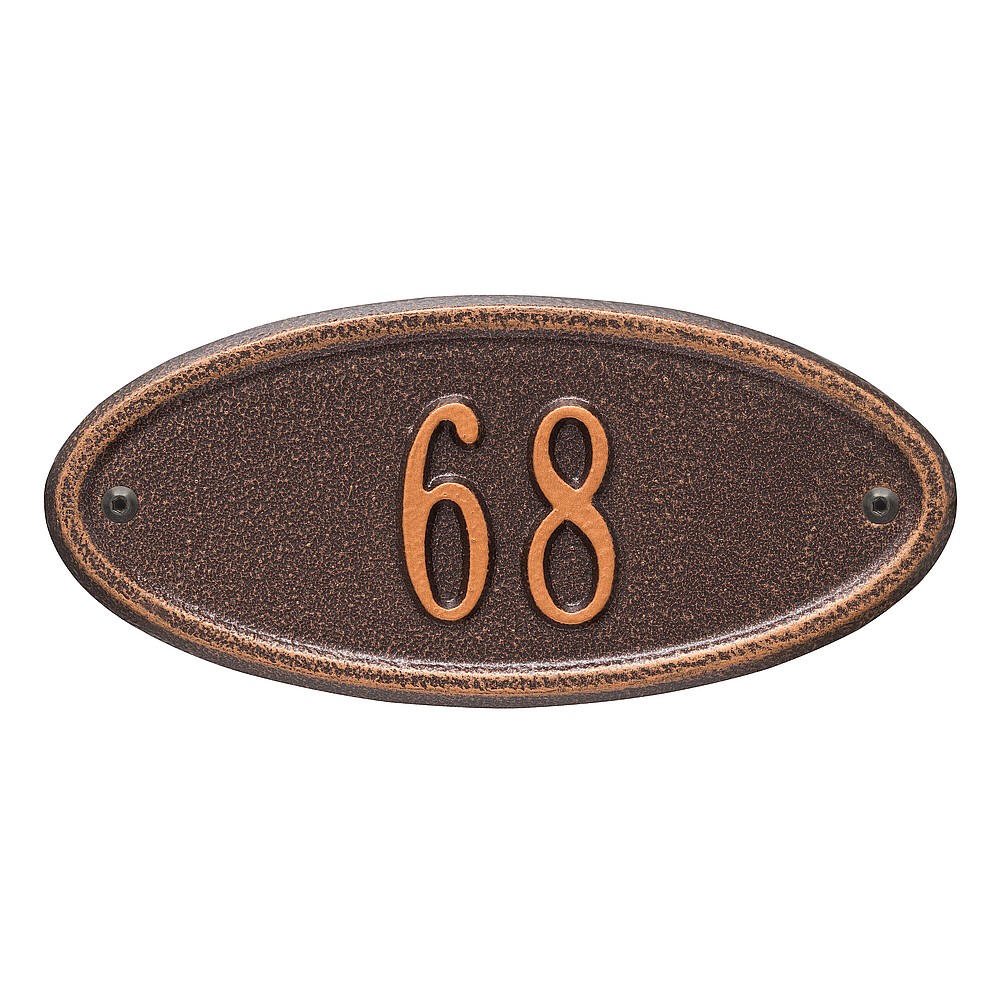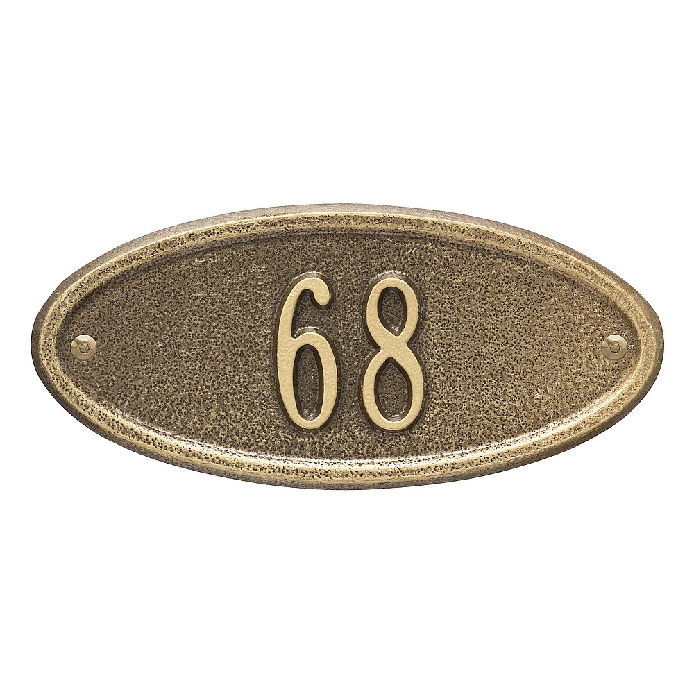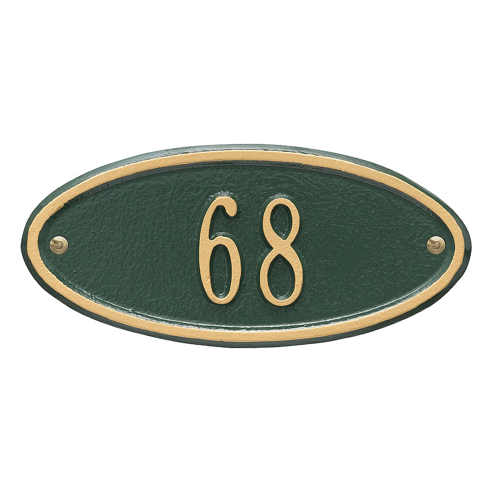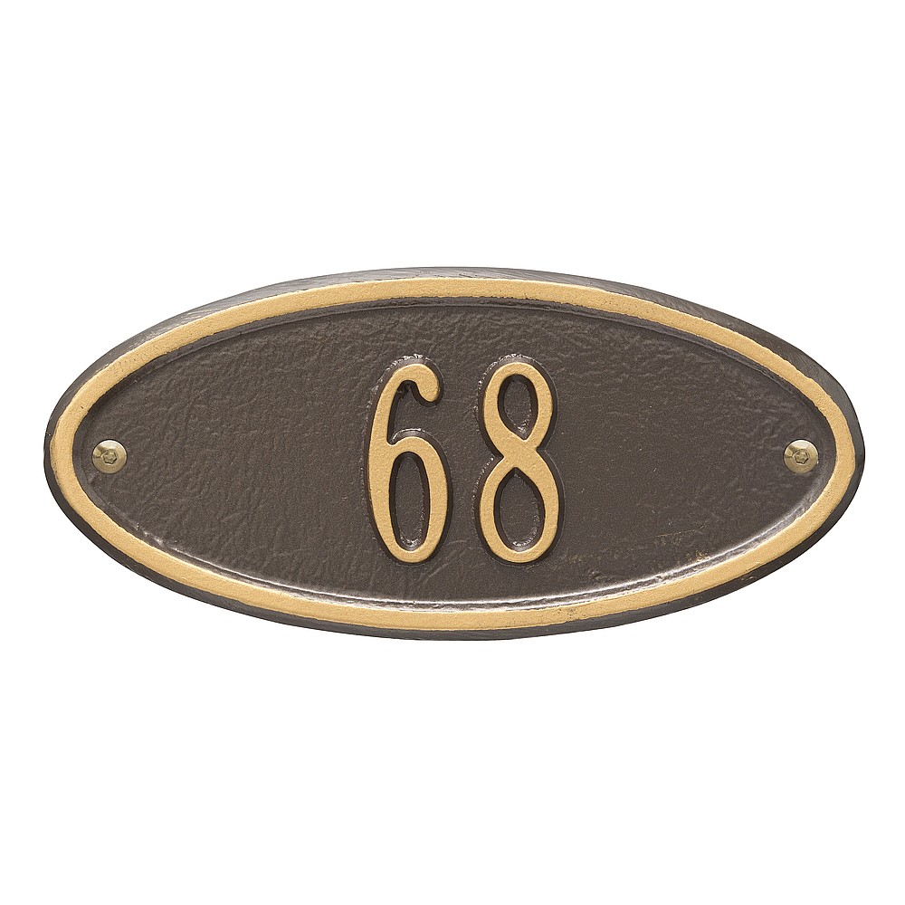 5 – 2″ characters The classic oval design of our Madison Address Plaques makes it ideal for most any home’s exterior. Available in a variety of finish colors to accommodate your outdoor color scheme. Made in the USA Cast from recycled aluminum – will not rust. Alumi-Shield™ All Weather Coatings: A Whitehall Exclusive Enhances curb appeal while adding value to your home Personalization is permanently cast into the sign