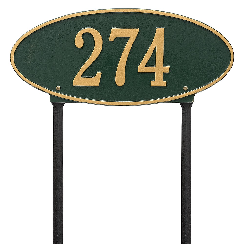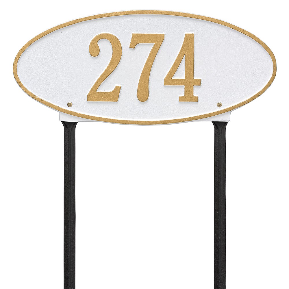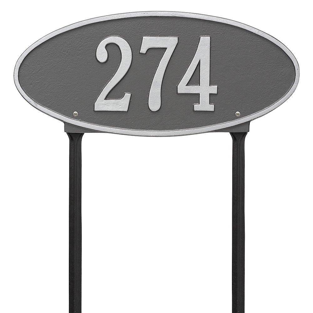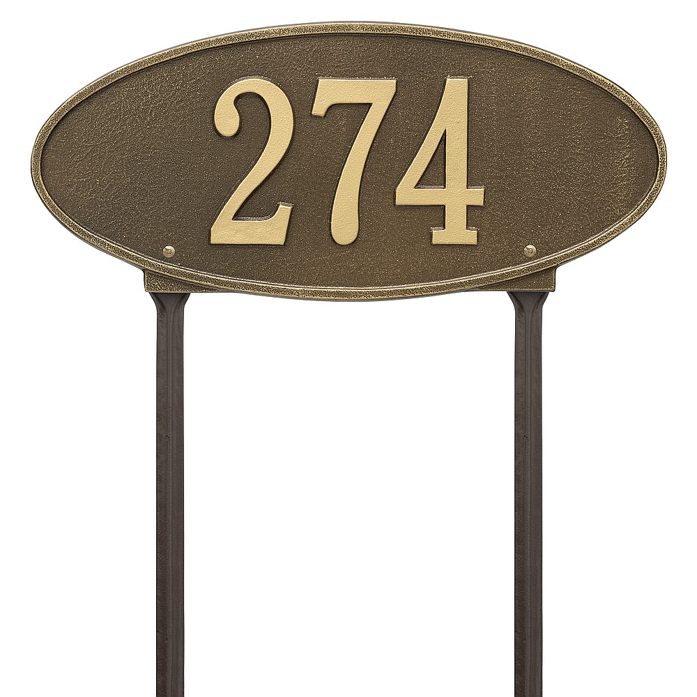 5 – 4.5″ numbers or 17 – 1.25″ characters The classic oval design of our Madison Address Plaques makes it ideal for most any home’s exterior. Available in a variety of finish colors to accommodate your outdoor color scheme. Made in the USA Cast from recycled aluminum – will not rust. Alumi-Shield™ All Weather Coatings: A Whitehall Exclusive Enhances curb appeal while adding value to your home Personalization is permanently cast into the sign