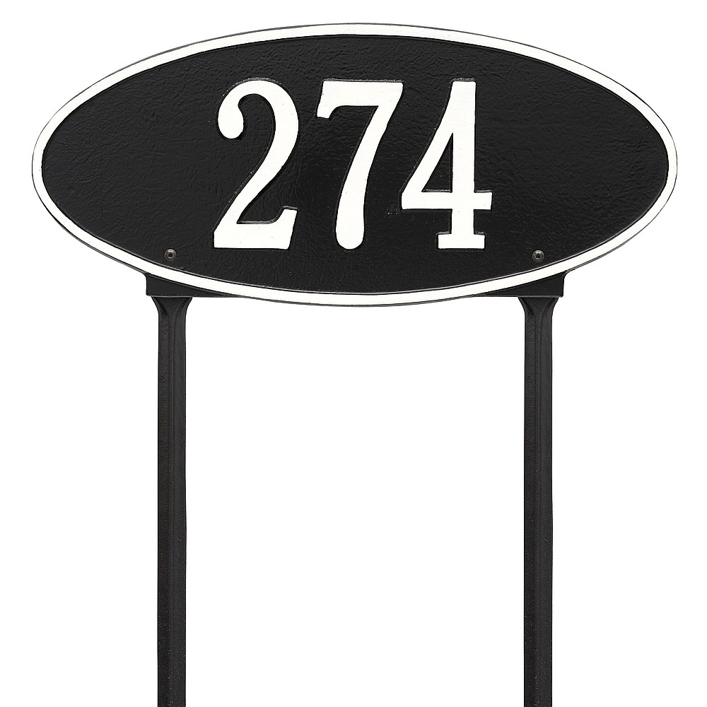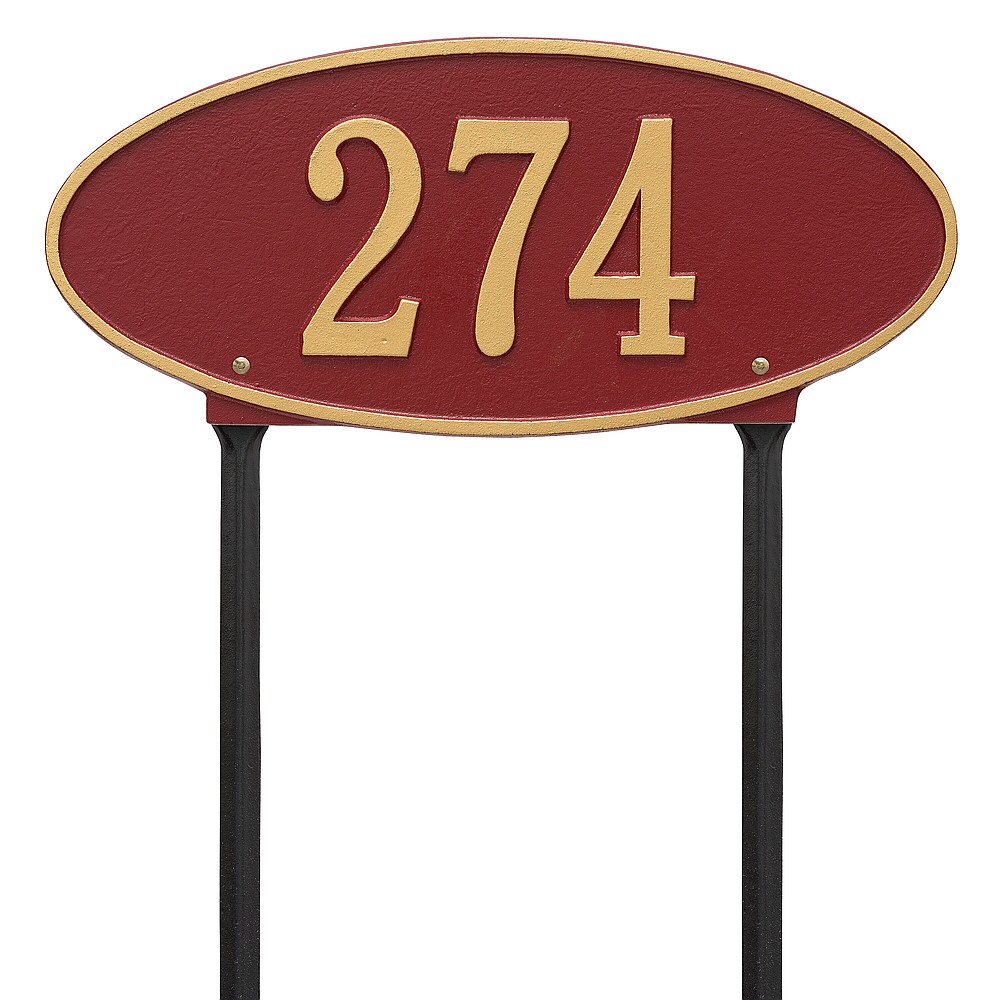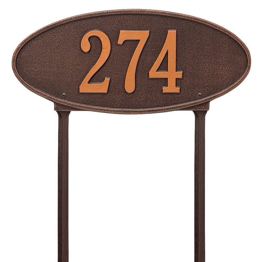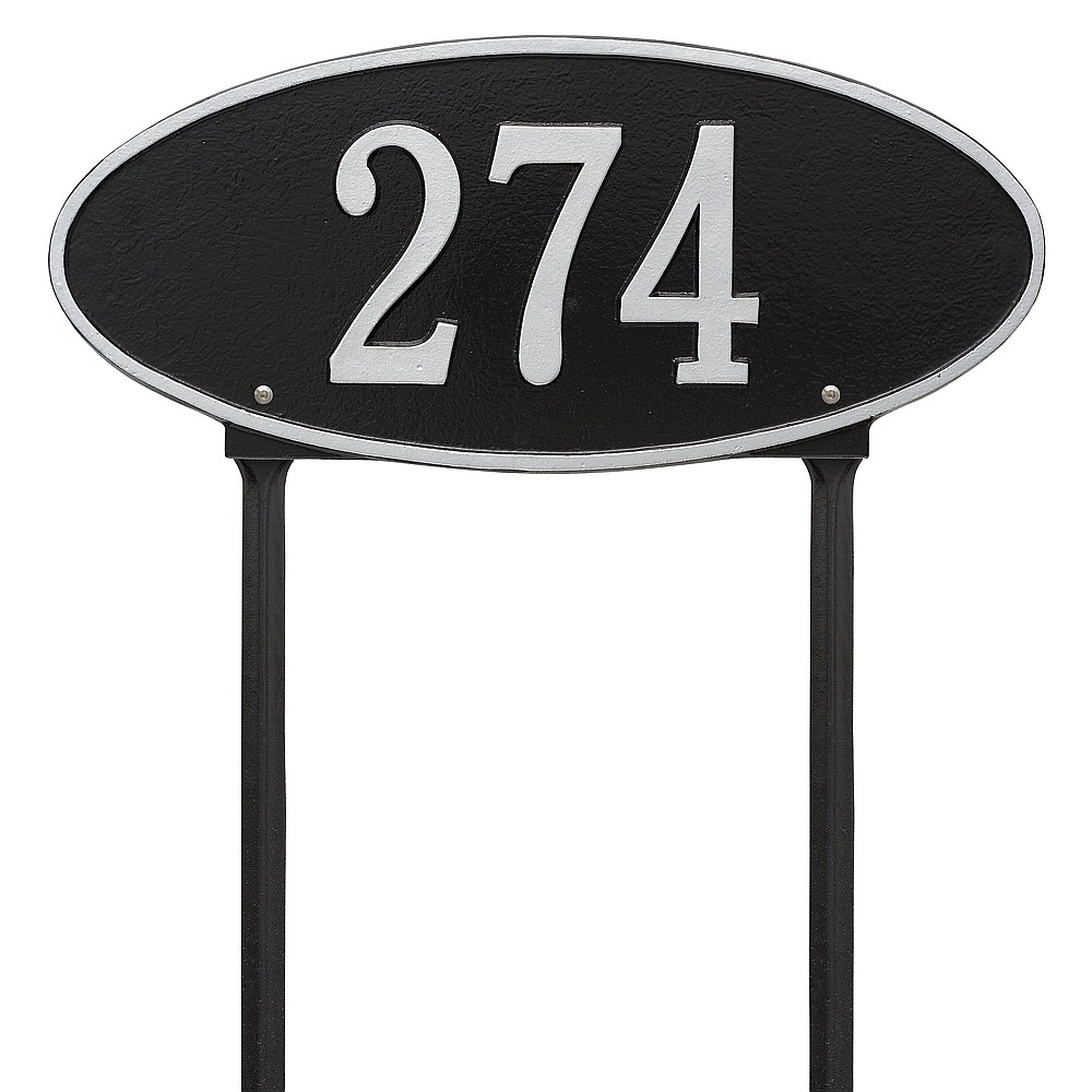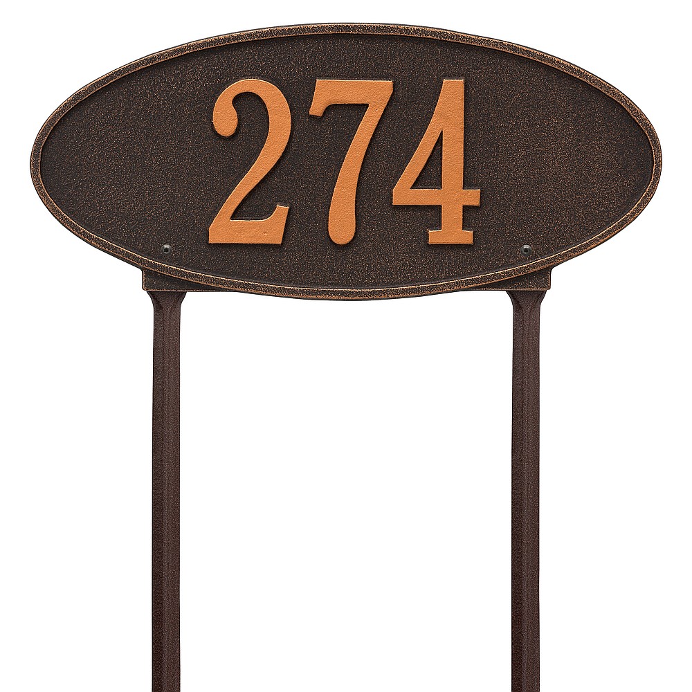 5 – 4.5″ numbers or 17 – 1.25″ characters The classic oval design of our Madison Address Plaques makes it ideal for most any home’s exterior. Available in a variety of finish colors to accommodate your outdoor color scheme. Made in the USA Cast from recycled aluminum – will not rust. Alumi-Shield™ All Weather Coatings: A Whitehall Exclusive Enhances curb appeal while adding value to your home Personalization is permanently cast into the sign