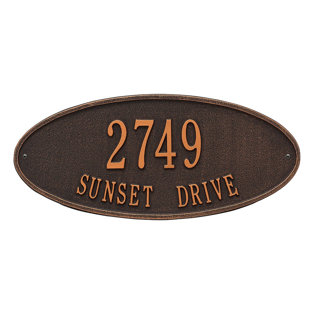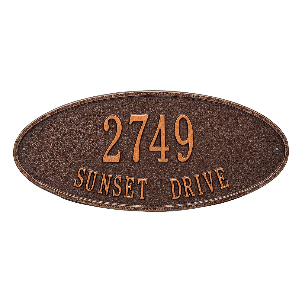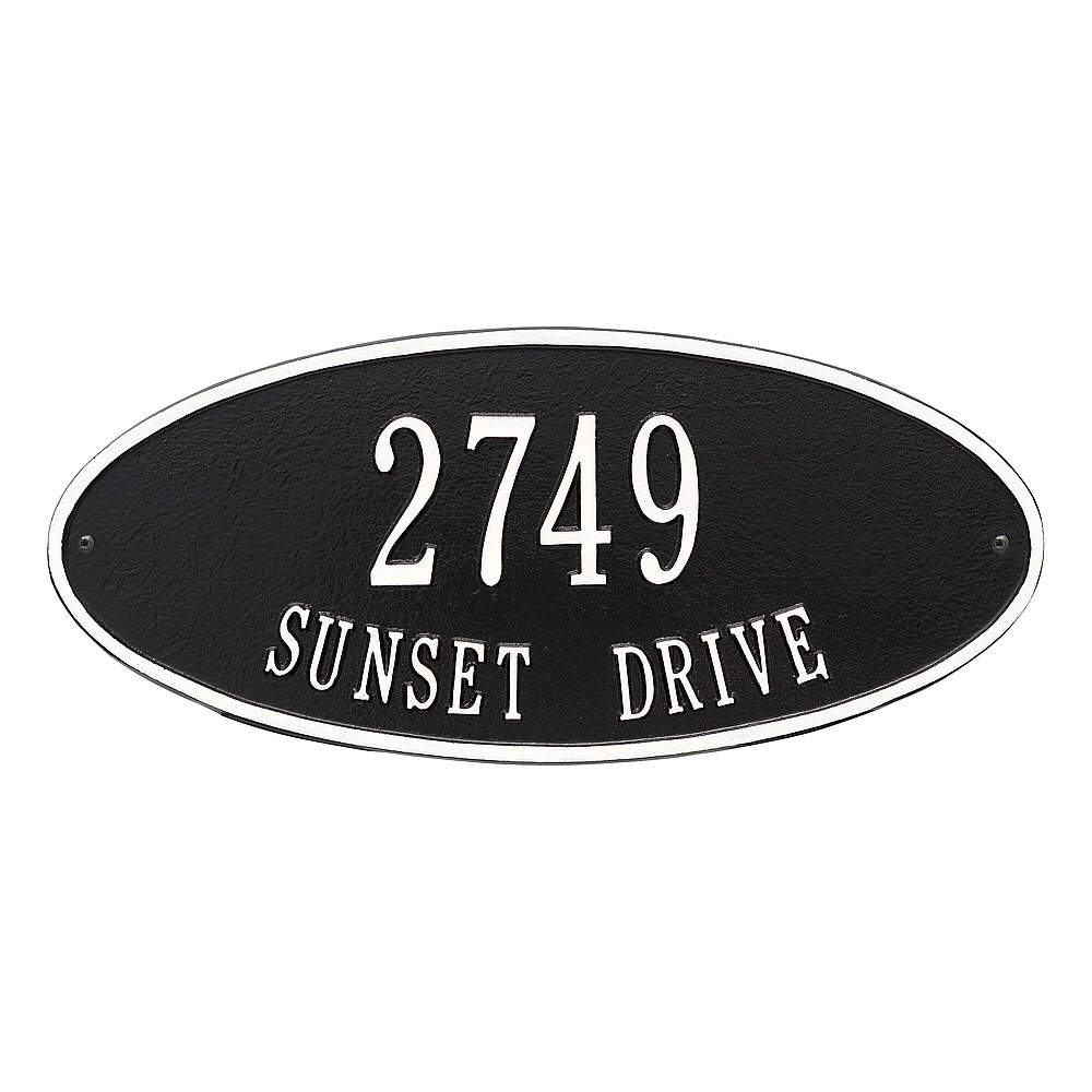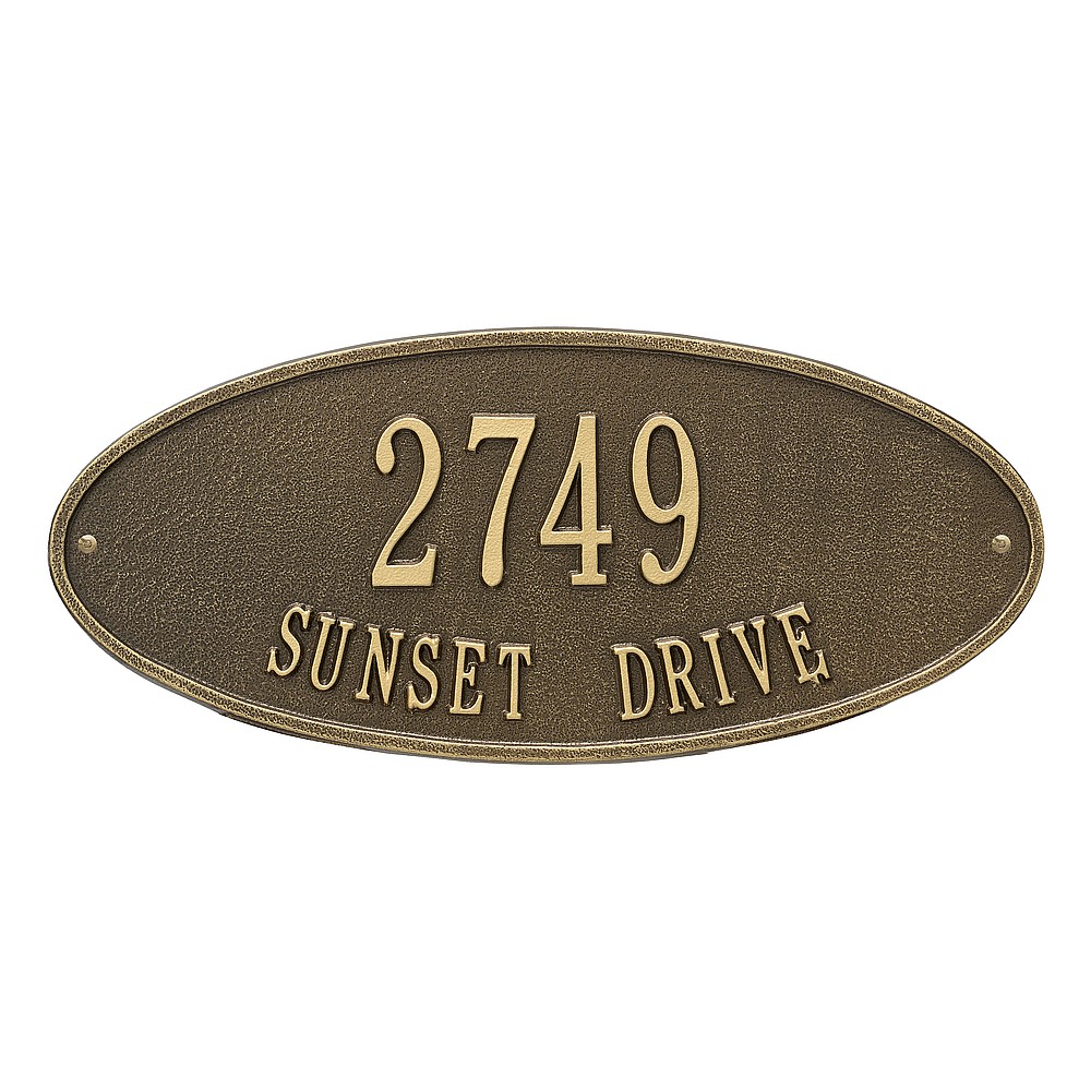 Line 1: 5 – 3″ characters Line 2: 17 – 1.25″ characters The classic oval design of our Madison Address Plaques makes it ideal for most any home’s exterior. Available in a variety of finish colors to accommodate your outdoor color scheme. Made in the USA Cast from recycled aluminum – will not rust. Alumi-Shield™ All Weather Coatings: A Whitehall Exclusive Enhances curb appeal while adding value to your home Personalization is permanently cast into the sign