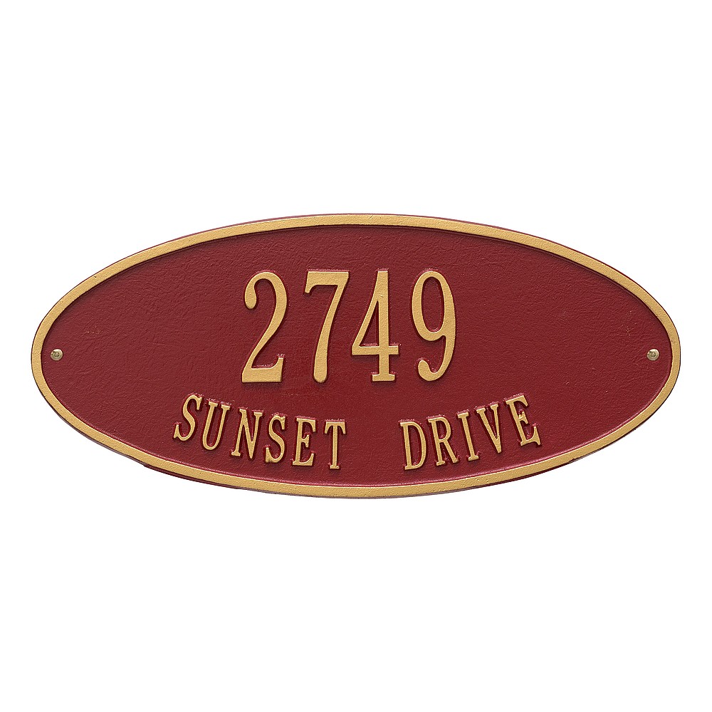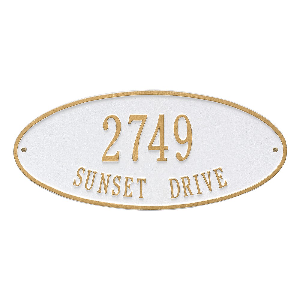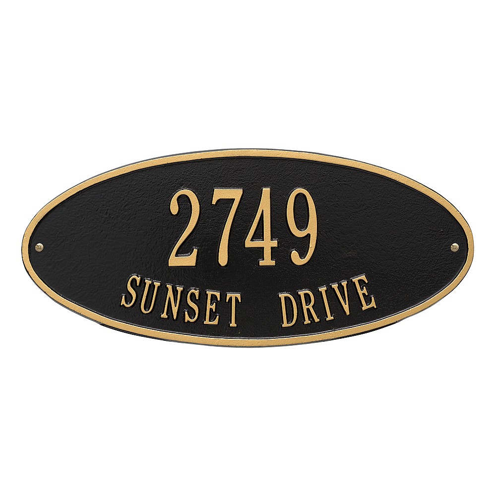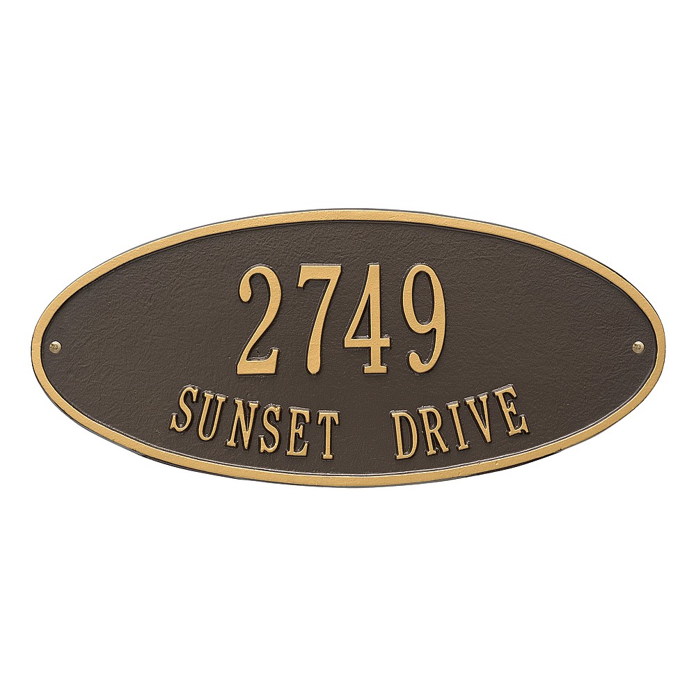 Line 1: 5 – 3″ characters Line 2: 17 – 1.25″ characters The classic oval design of our Madison Address Plaques makes it ideal for most any home’s exterior. Available in a variety of finish colors to accommodate your outdoor color scheme. Made in the USA Cast from recycled aluminum – will not rust. Alumi-Shield™ All Weather Coatings: A Whitehall Exclusive Enhances curb appeal while adding value to your home Personalization is permanently cast into the sign