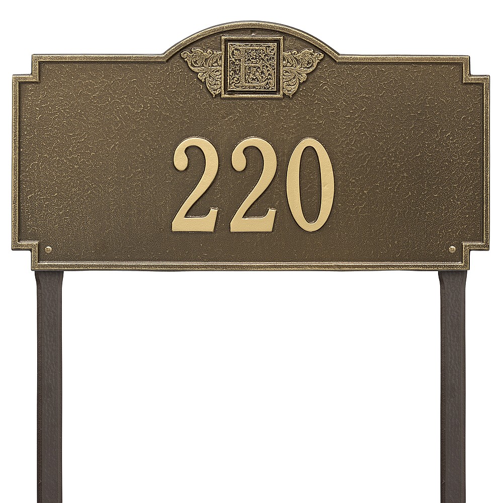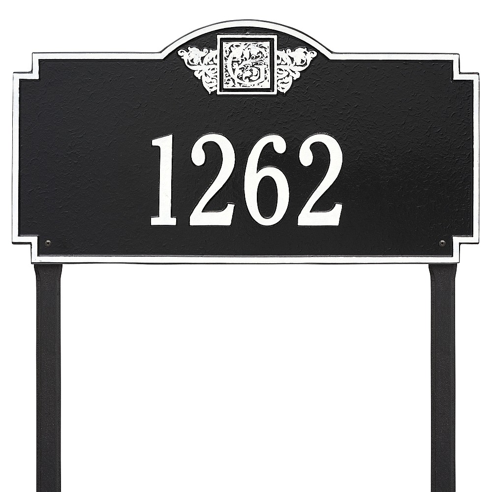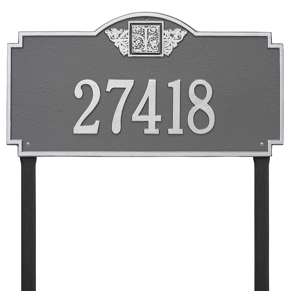 5 – 4.5″ numbers or 17 – 2″ characters Make a prestigious statement with your Monogram initial in this distinctive house numbers plaque. The Monogram address sign will provide a nice upgrade to the curb appeal of your home. Home address plaques also make great gifts for any special occasion Made in the USA Cast from recycled aluminum – will not rust. Alumi-Shield™ All Weather Coatings: A Whitehall Exclusive Enhances curb appeal while adding value to your home Personalization is permanently cast into the sign