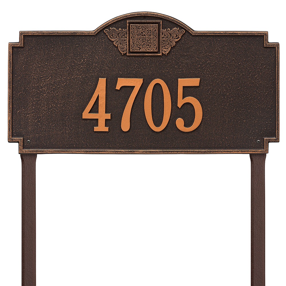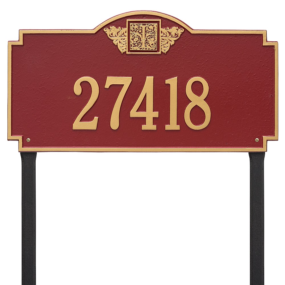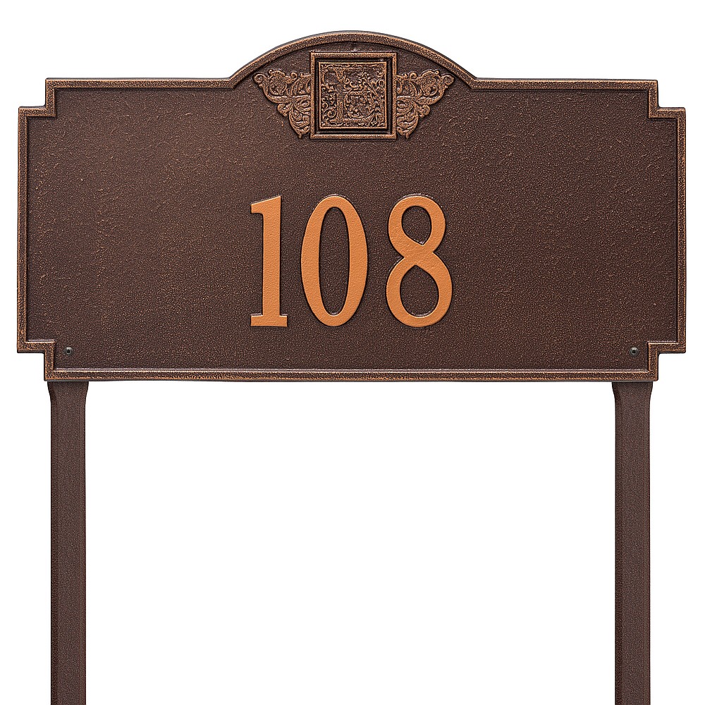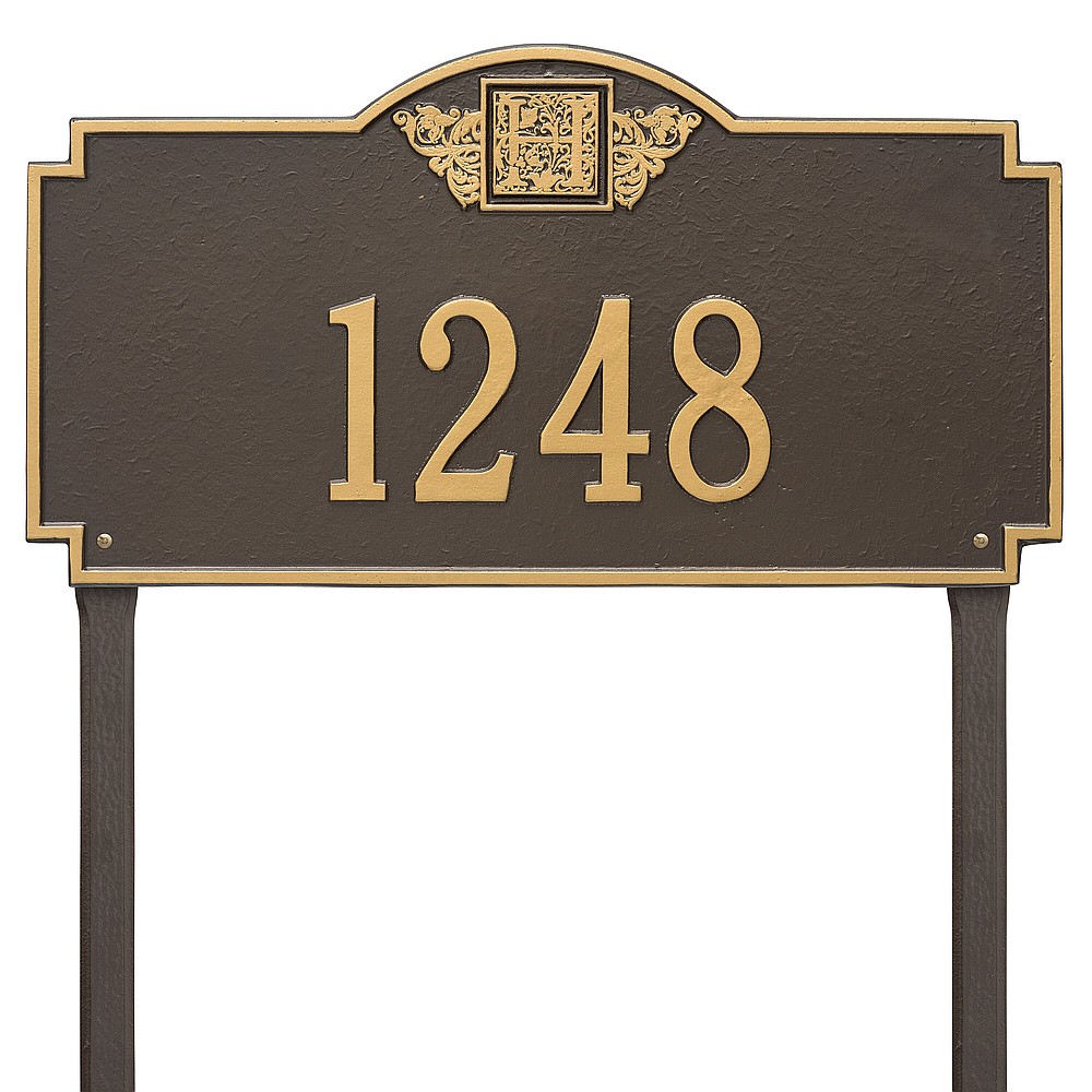 5 – 4.5″ numbers or 17 – 2″ characters Make a prestigious statement with your Monogram initial in this distinctive house numbers plaque. The Monogram address sign will provide a nice upgrade to the curb appeal of your home. Home address plaques also make great gifts for any special occasion Made in the USA Cast from recycled aluminum – will not rust. Alumi-Shield™ All Weather Coatings: A Whitehall Exclusive Enhances curb appeal while adding value to your home Personalization is permanently cast into the sign