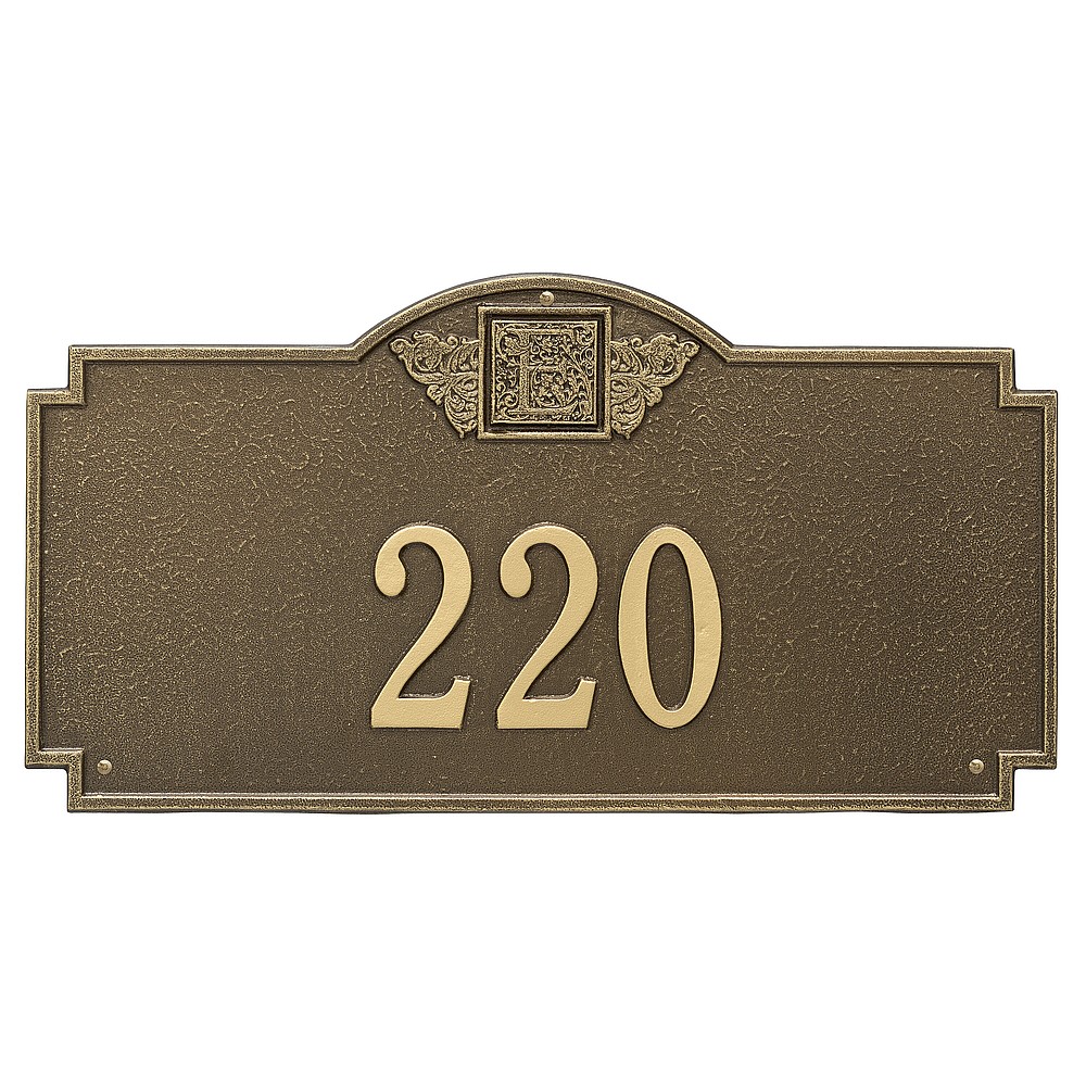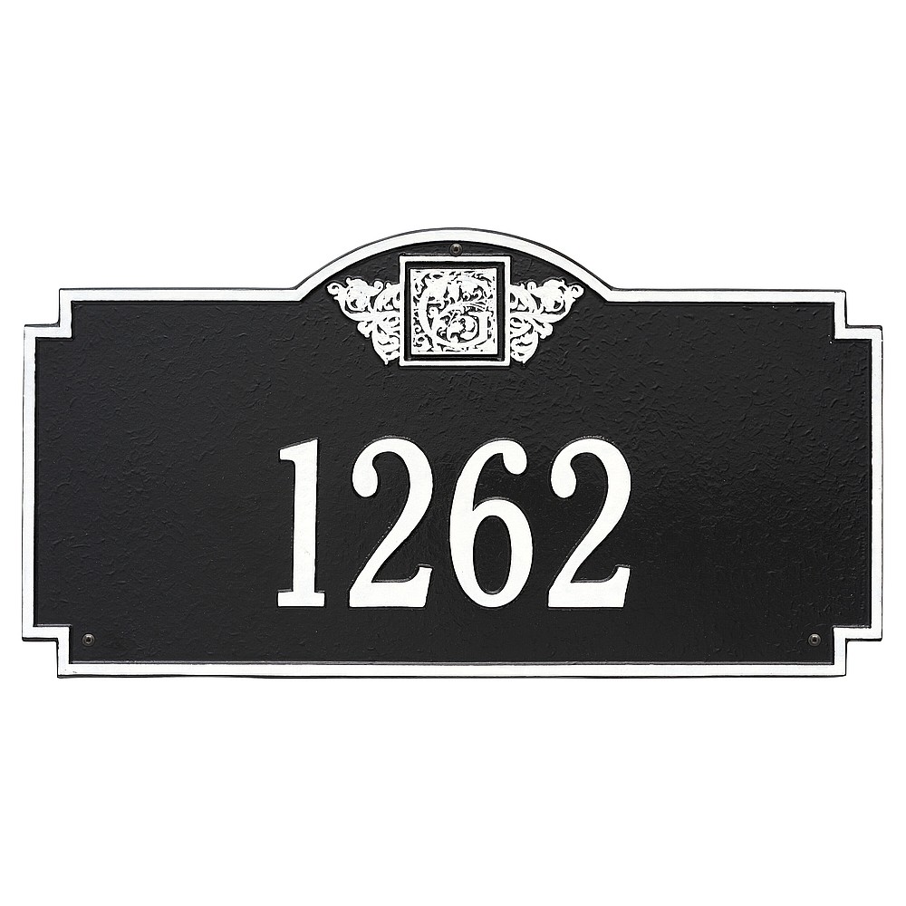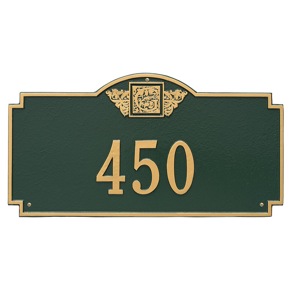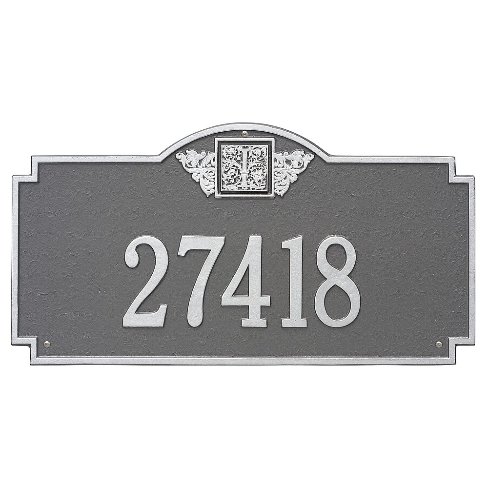5 – 4.5″ numbers or 17 – 2″ characters The Whitehall Products Monogram Estate Address Plaque lends a classic vintage look to your home. The lightweight rust-free aluminum is handcrafted to make this elegant address plaque. The plaque has weather resistant paints that provide a long life Made in the USA Cast from recycled aluminum – will not rust. Alumi-Shield™ All Weather Coatings: A Whitehall Exclusive Enhances curb appeal while adding value to your home Personalization is permanently cast into the sign