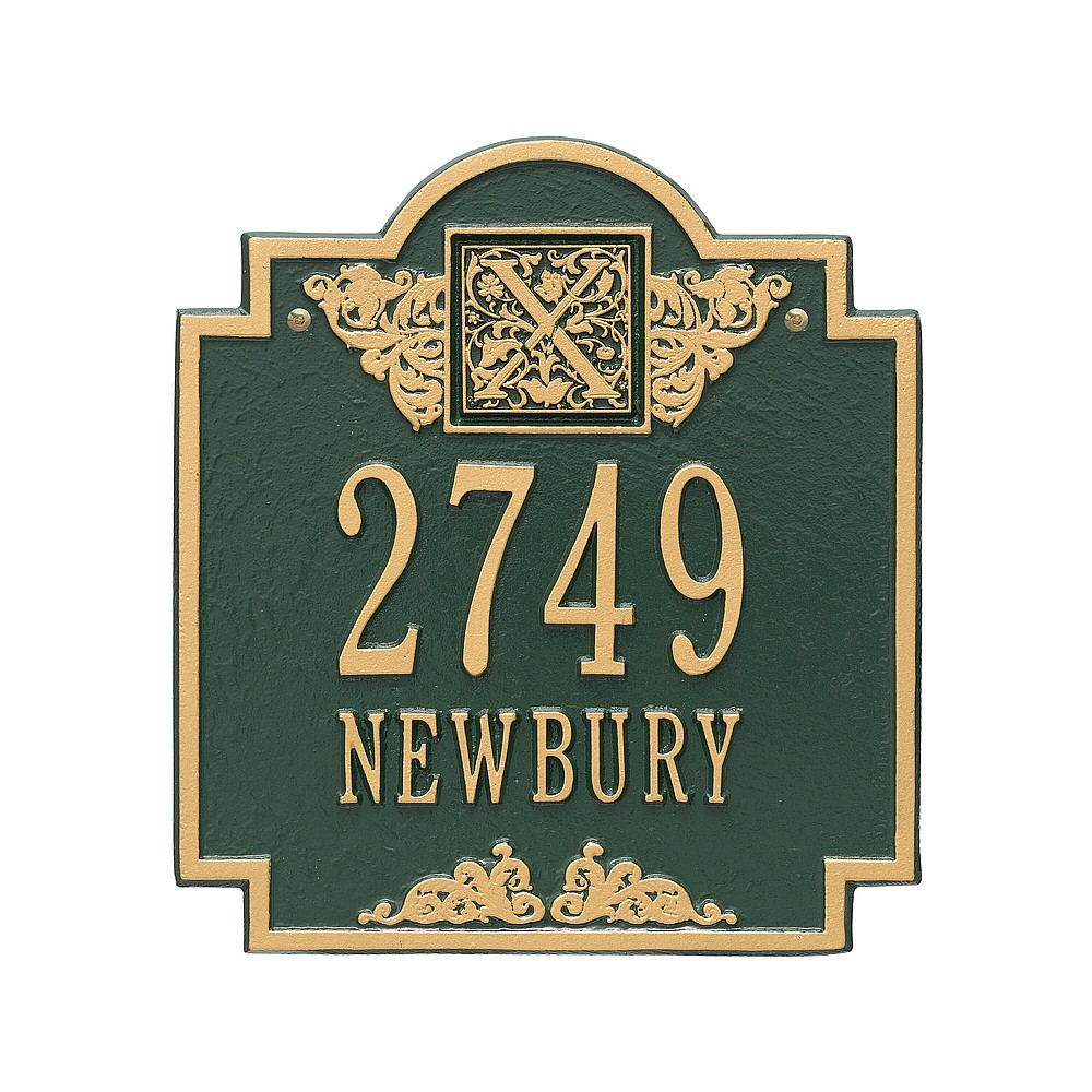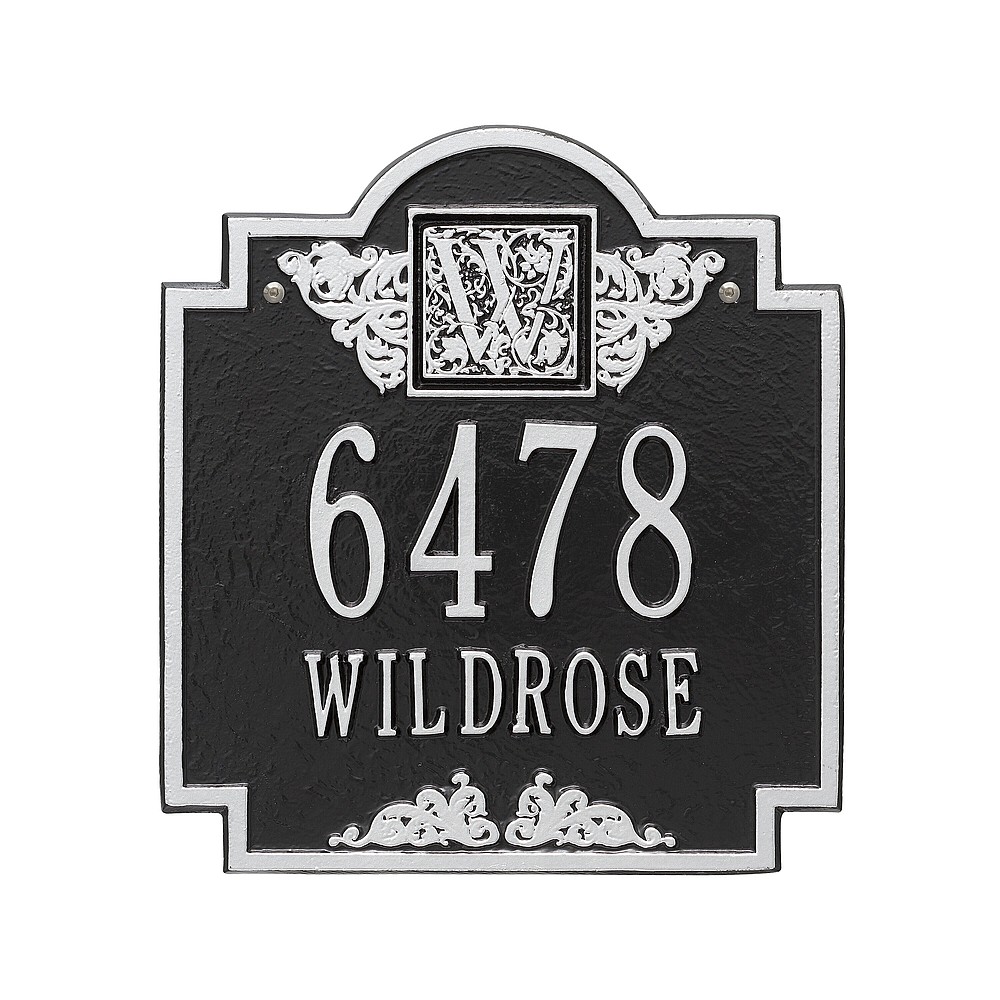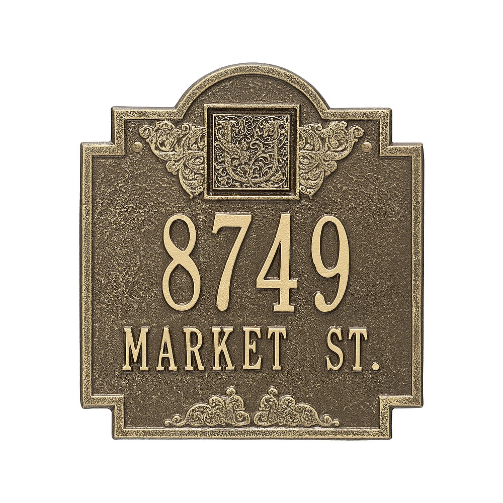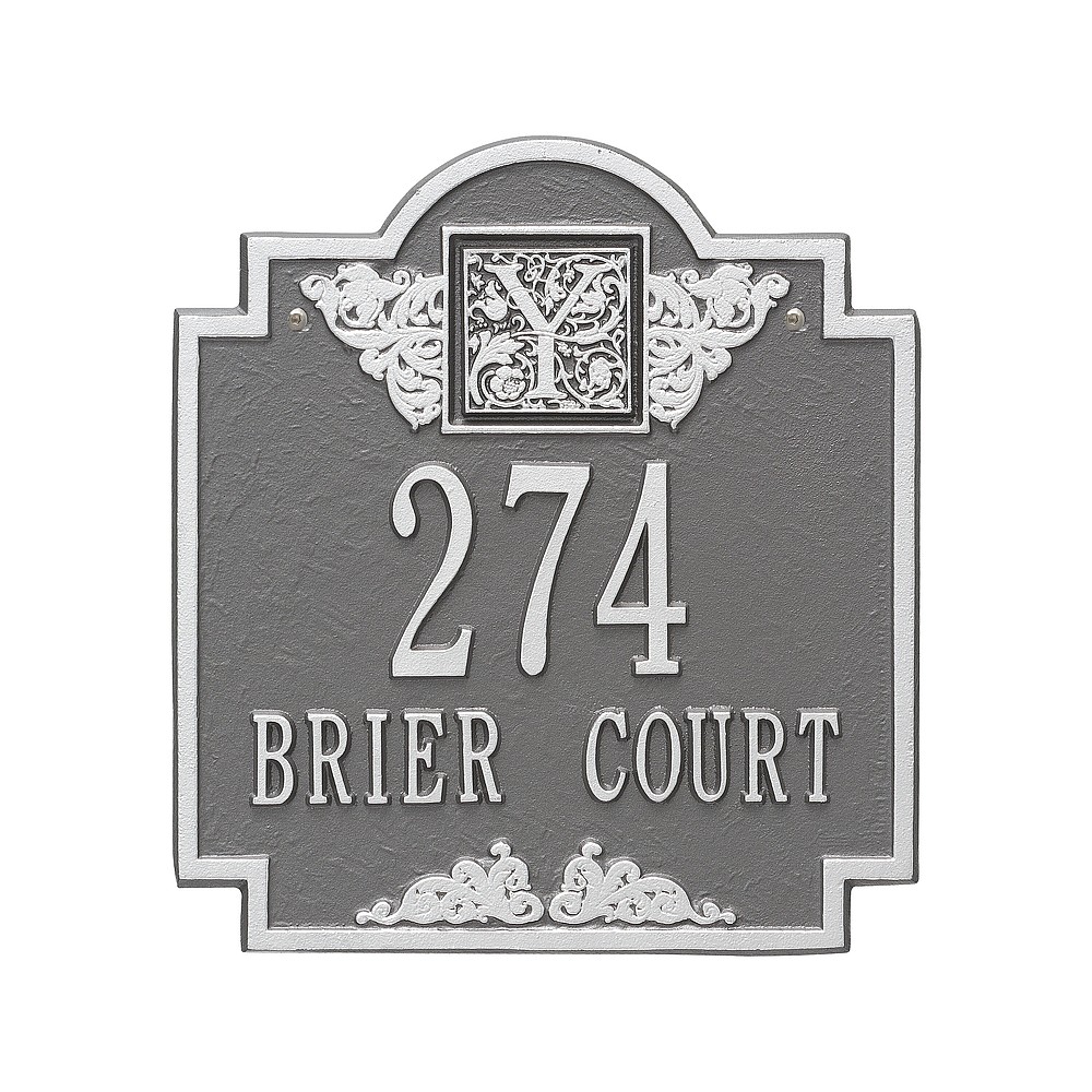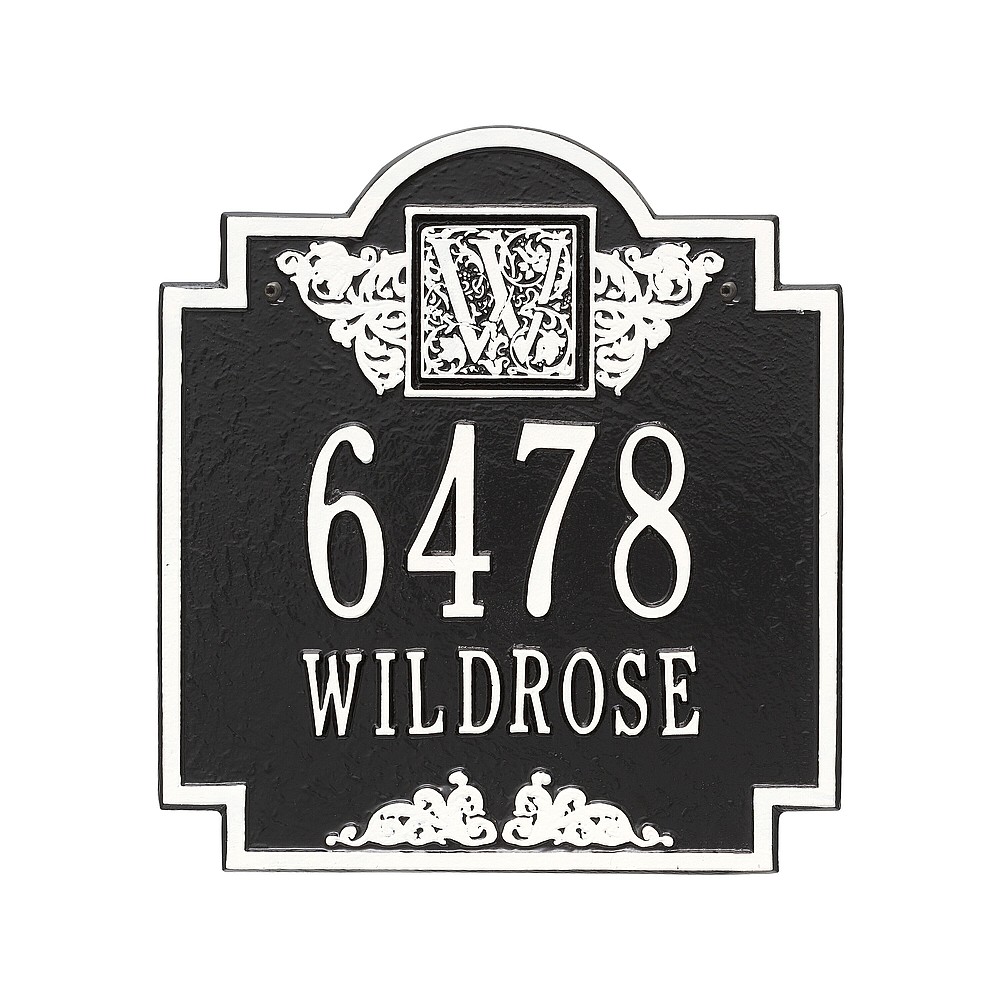 Line 1: 5-3″ characters Line 2: 12-1.25″ char. or Line 1: 12-1.25″ characters Line 2: 5-3″ char. Make a prestigious statement with your Monogram initial in this distinctive house numbers plaque. The Monogram address sign will provide a nice upgrade to the curb appeal of your home. Home address plaques also make great gifts for any special occasion Made in the USA Cast from recycled aluminum – will not rust. Alumi-Shield™ All Weather Coatings: A Whitehall Exclusive Enhances curb appeal while adding value to your home Personalization is permanently cast into the sign
