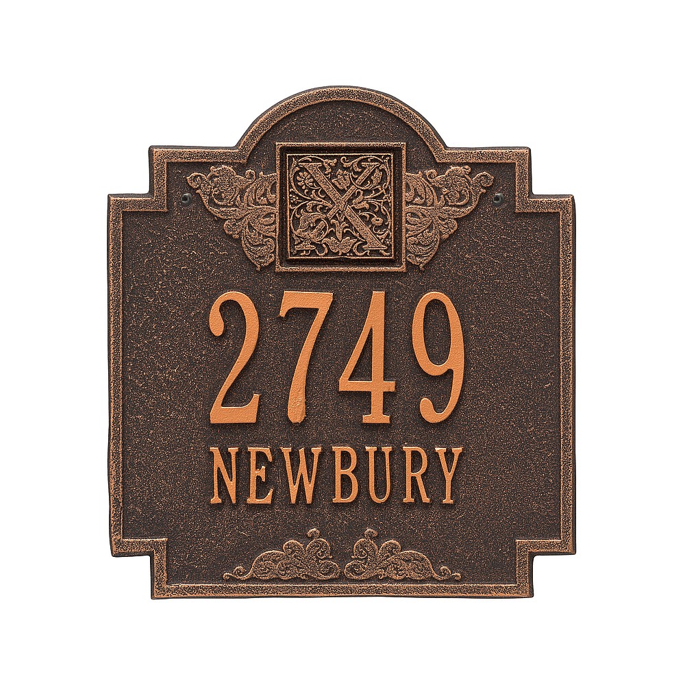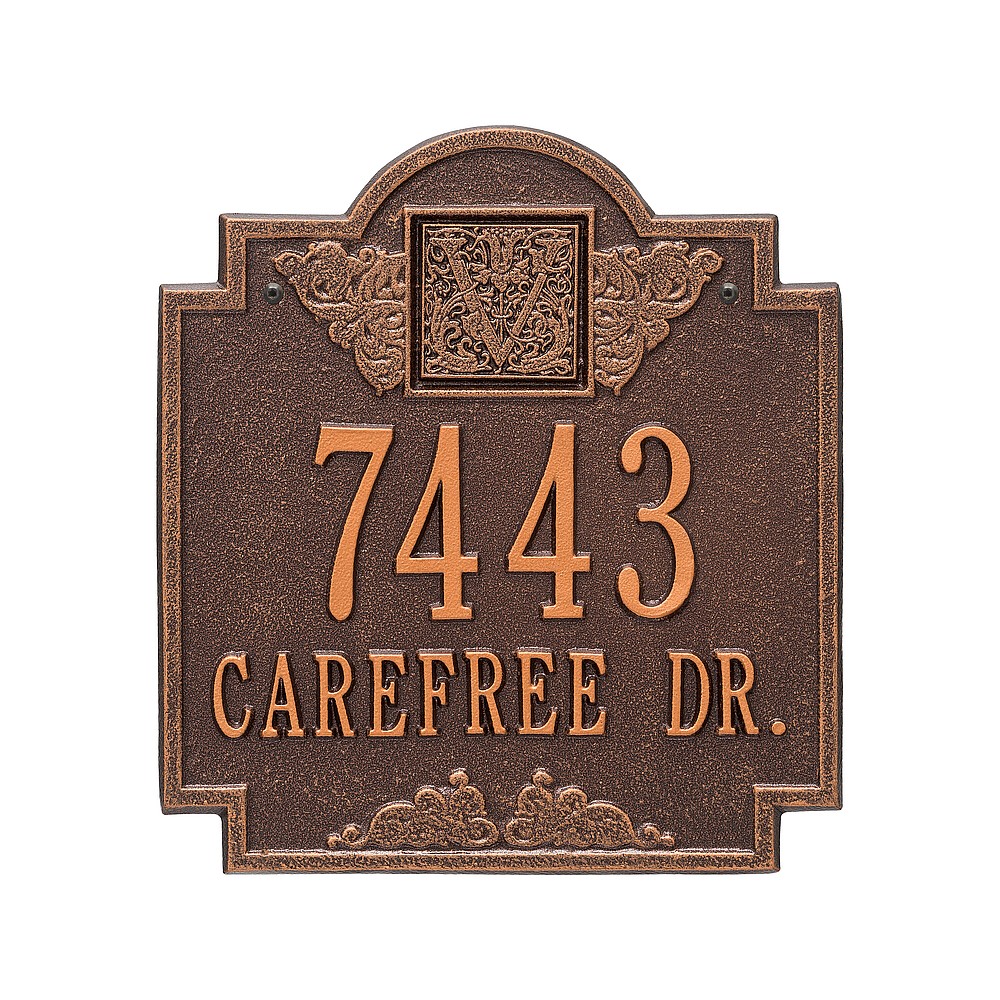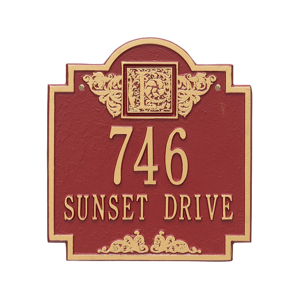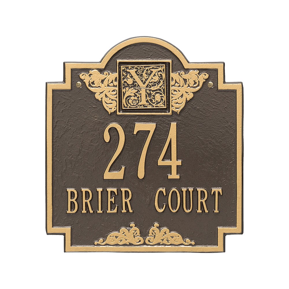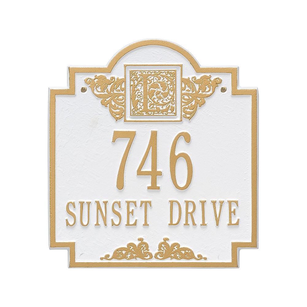Line 1: 5-3″ characters Line 2: 12-1.25″ char. or Line 1: 12-1.25″ characters Line 2: 5-3″ char. Make a prestigious statement with your Monogram initial in this distinctive house numbers plaque. The Monogram address sign will provide a nice upgrade to the curb appeal of your home. Home address plaques also make great gifts for any special occasion Made in the USA Cast from recycled aluminum – will not rust. Alumi-Shield™ All Weather Coatings: A Whitehall Exclusive Enhances curb appeal while adding value to your home Personalization is permanently cast into the sign