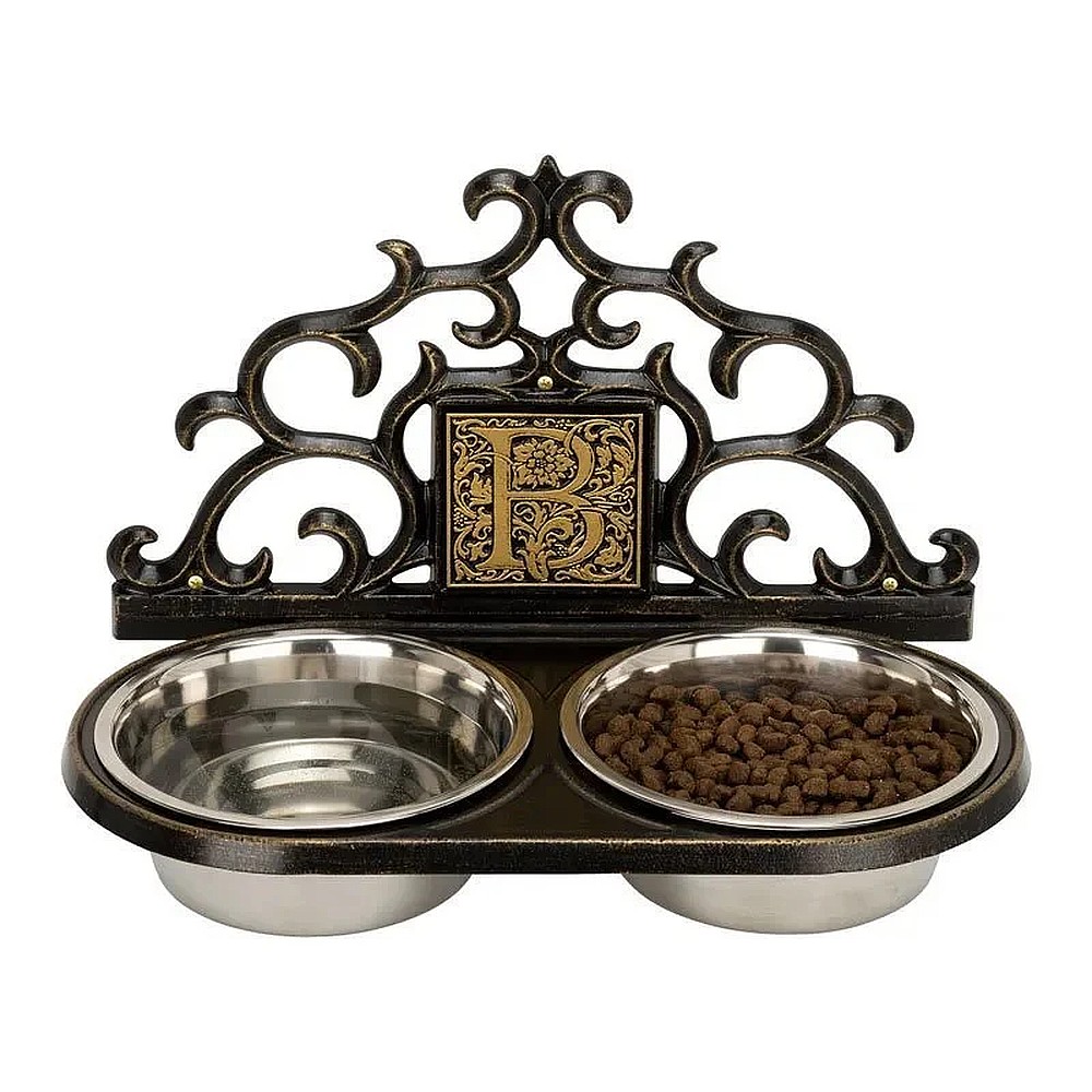 Assembled Dimensions Include Stakes (LxWxH): 18″ x 12.5″ x 10.5″ Personalize your pet’s eating area with the elegant Monogram Wall Pet Feeder. Featuring a hand-carved scroll backplate, it’s a delightful combination of decoration and function. With its two large 64 oz. (8 cups) bowls and wall installation method, its perfect for furry friends large and small. Proudly made in the USA. Manufactured from recycled aluminum. Includes two 64 oz. / 8 c. / 1.9 liter bowls. Holds one monogram letter. Monogram is permanently cast into the plaque. Easily assembled and installed with only 3 wall screws. Alumi-Shieldâ„¢ – All Weather Coating protects against the harshest weather and environmental elements. Extends the product life and maintains the look and function.