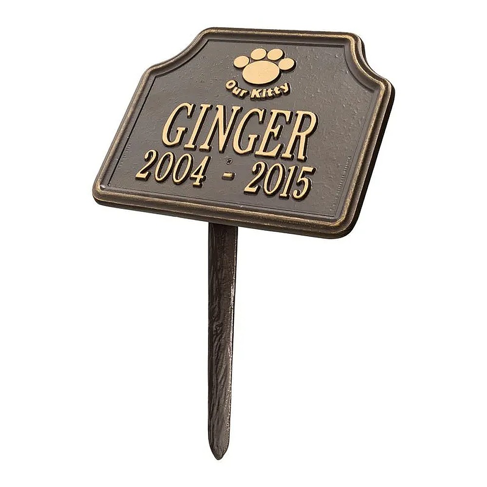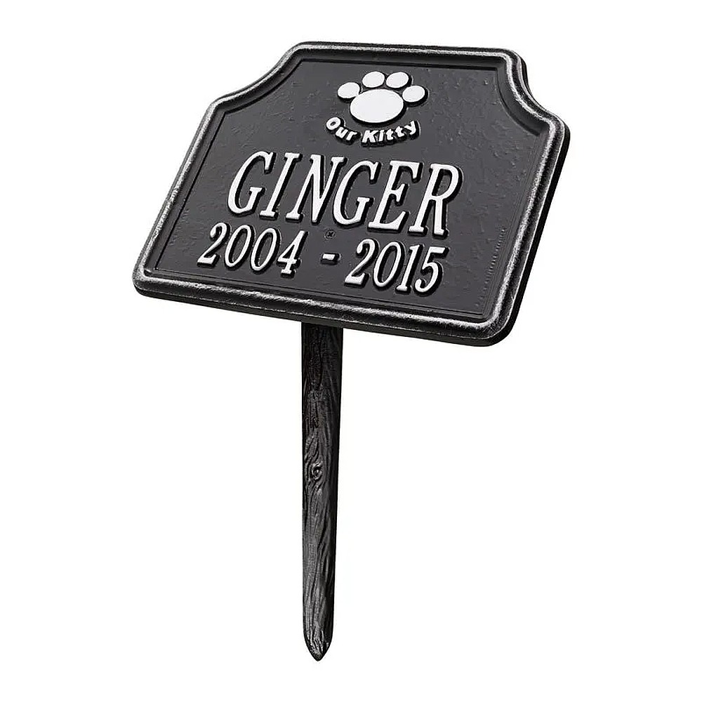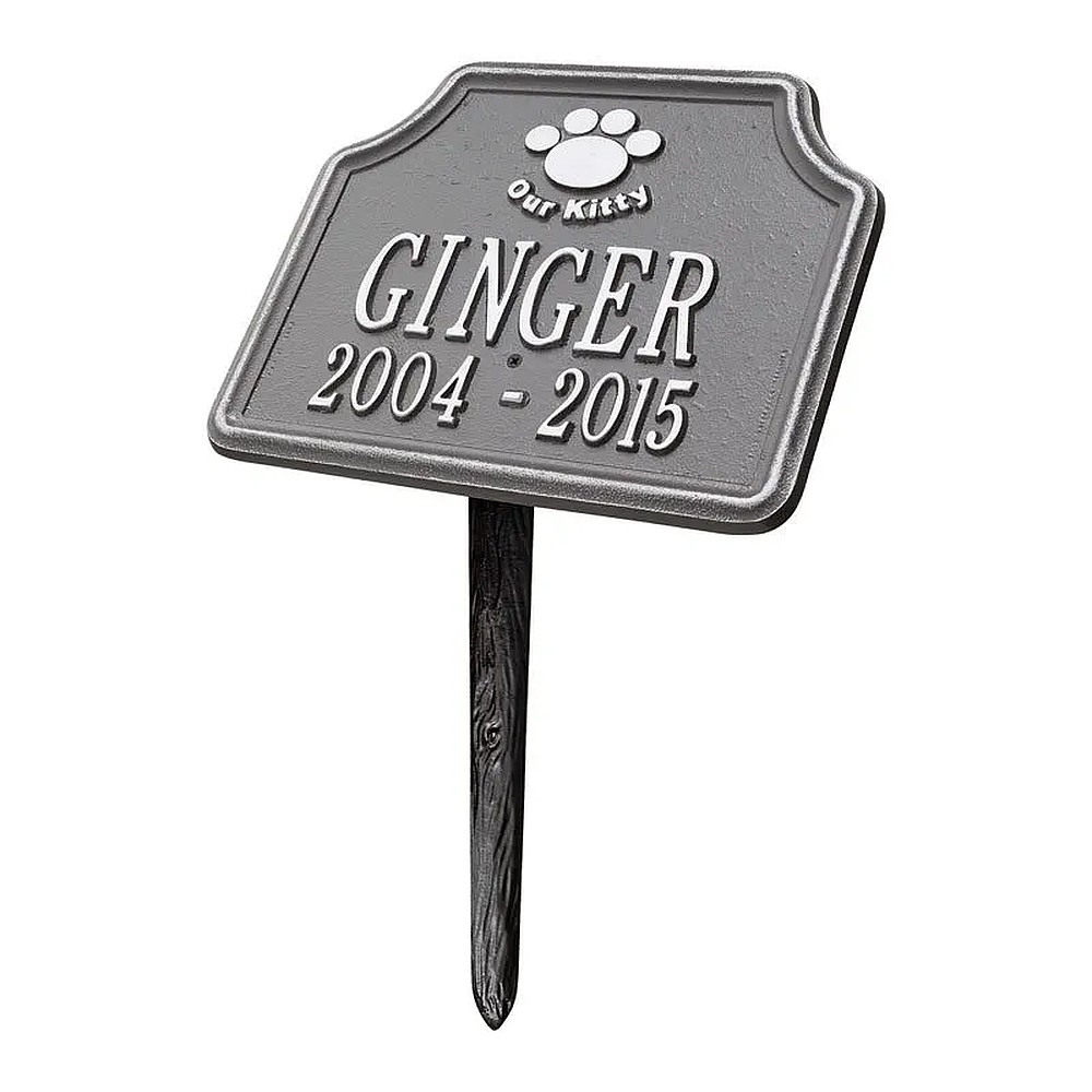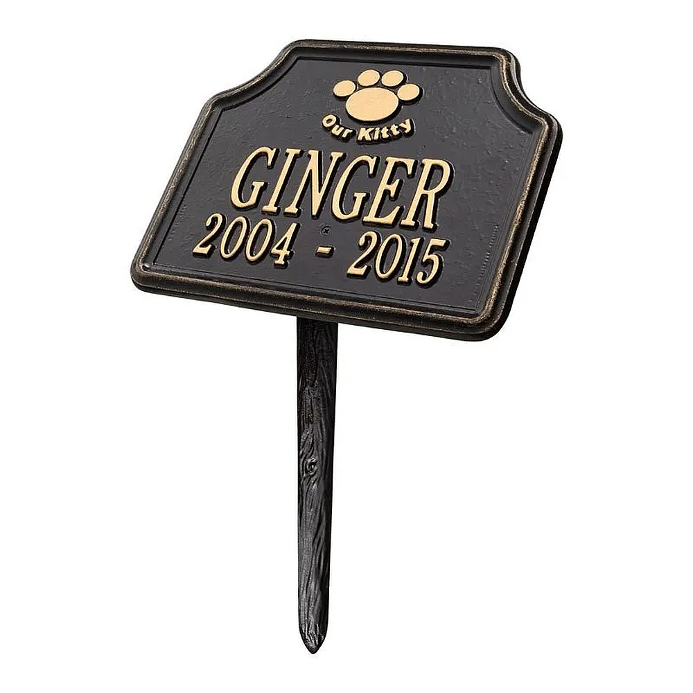 Assembled Dimensions Include Stakes (LxWxH): 10.75″ x 17.25″ x 6.75″ Keep your feline companion’s memory alive with this Our Kitty personalized pet memorial marker. Celebrate and honor the memory of your pet and create a lasting memorial with this solid cast aluminum garden marker. This unique lawn plaque can be used to designate a favorite area in your yard, a play area, or the pet’s burial site. Features a 10 inch angled lawn stake for easy installation. Proudly made in the USA. Manufactured from recycled aluminum. Line 1 hold sup to eight 2″ characters. Line 2 hold sup to eleven 1.25″ characters. Personalization is permanently cast into the plaque. Includes one 10″ angled lawn stake. Alumi-Shieldâ„¢ – All Weather Coating protects against the harshest weather and environmental elements. Extends the product life and maintains the look and function.