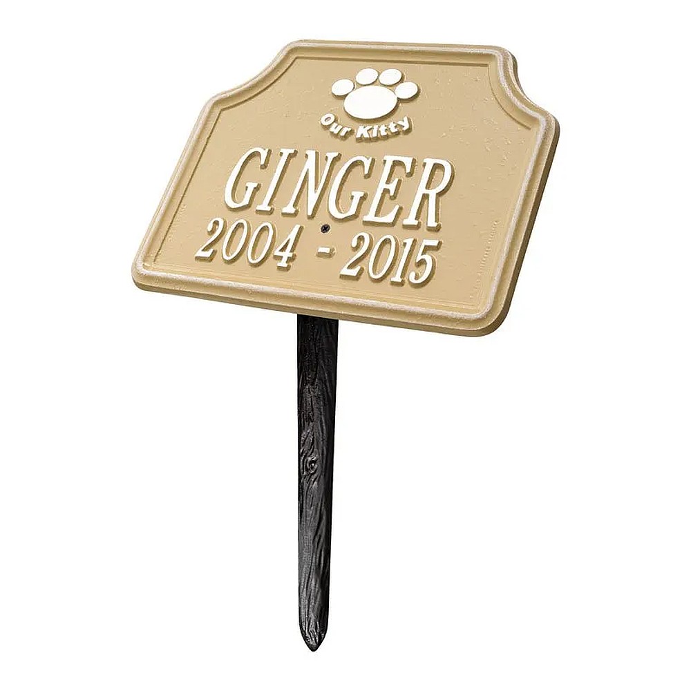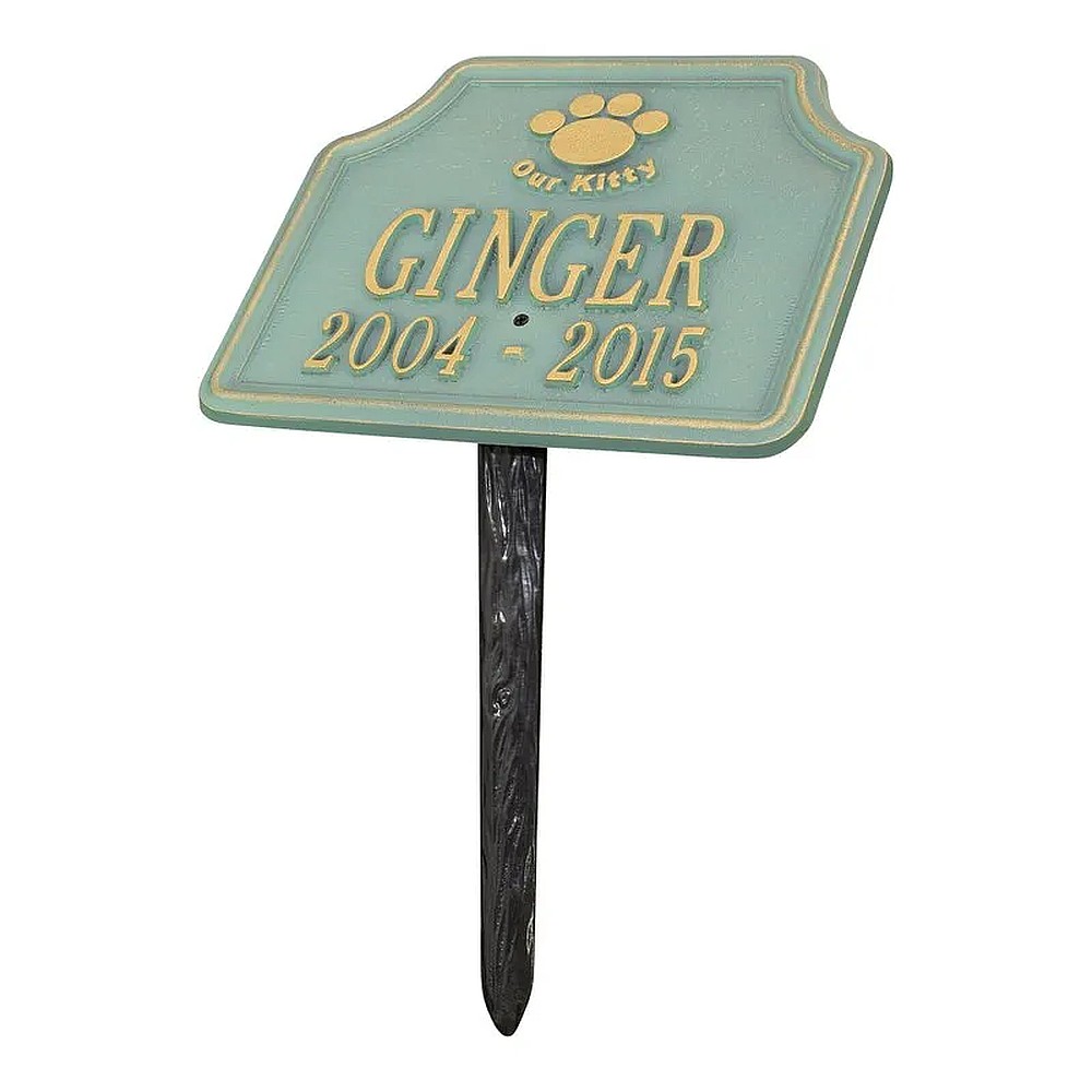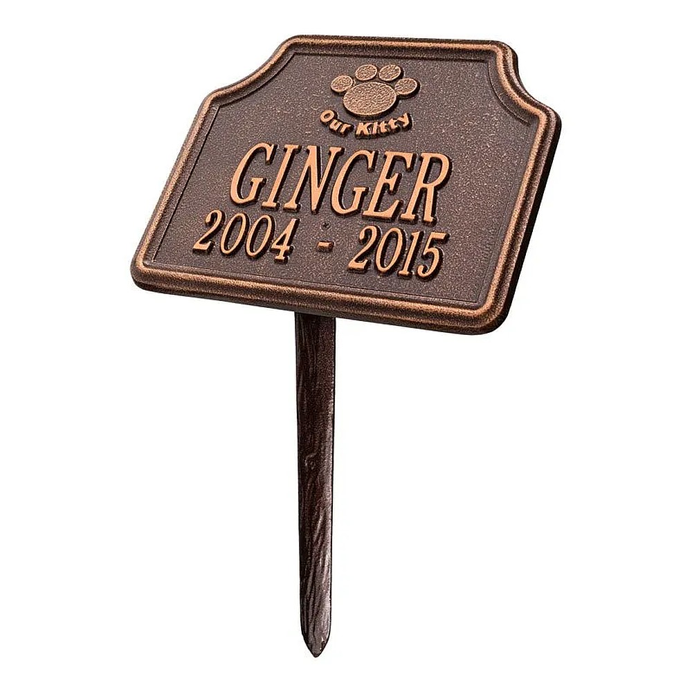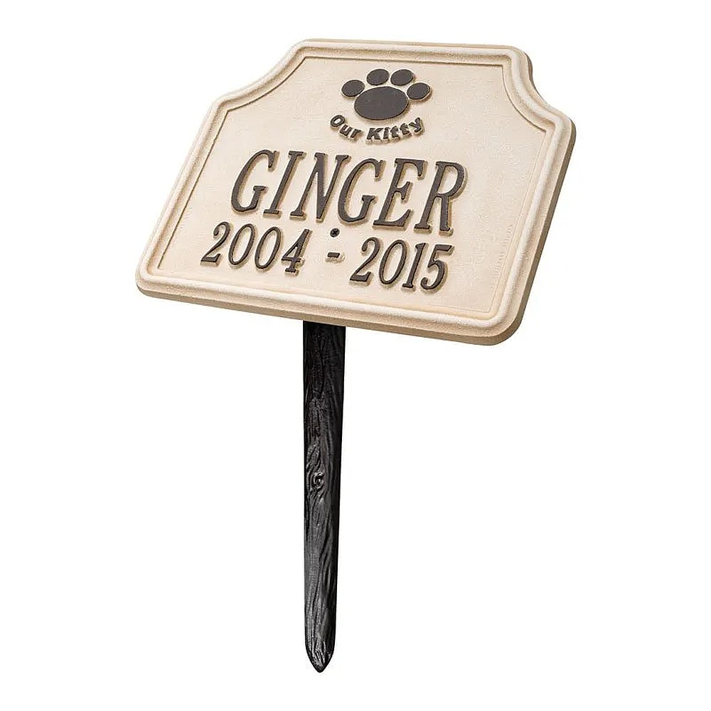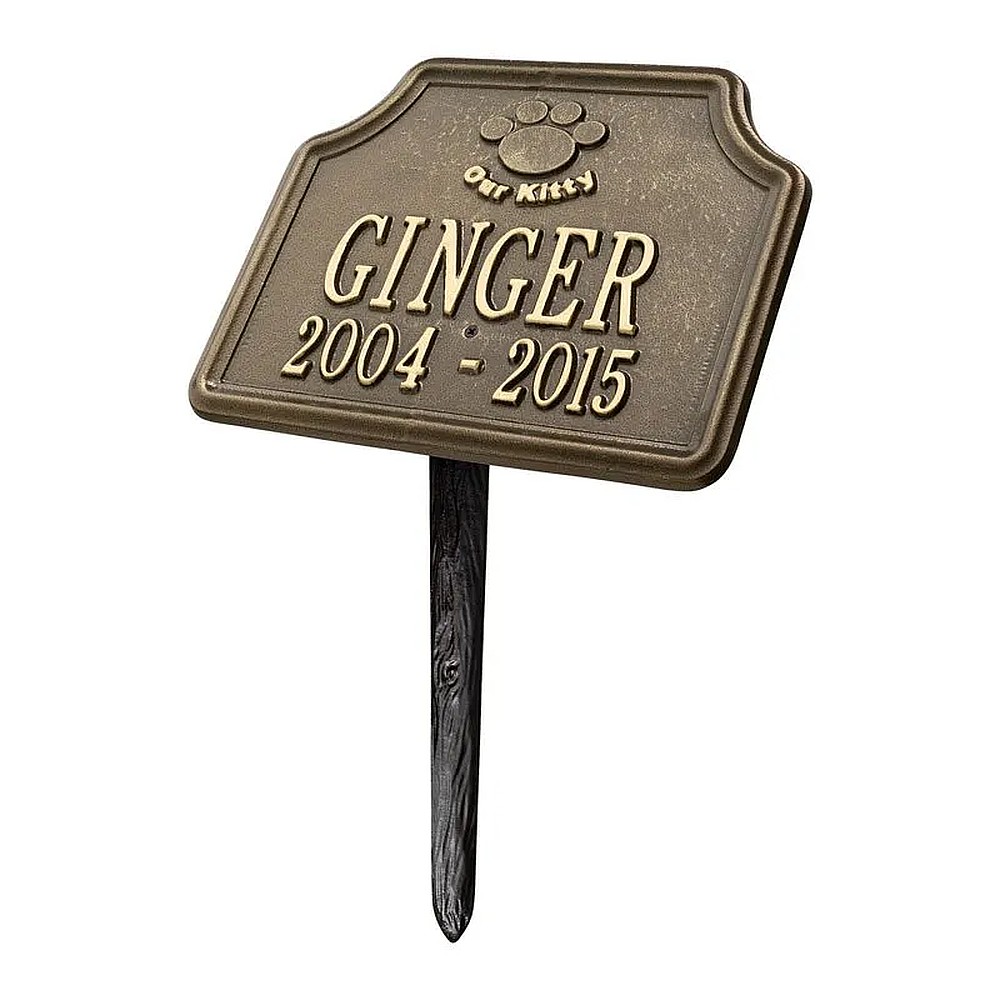 Assembled Dimensions Include Stakes (LxWxH): 10.75″ x 17.25″ x 6.75″ Keep your feline companion’s memory alive with this Our Kitty personalized pet memorial marker. Celebrate and honor the memory of your pet and create a lasting memorial with this solid cast aluminum garden marker. This unique lawn plaque can be used to designate a favorite area in your yard, a play area, or the pet’s burial site. Features a 10 inch angled lawn stake for easy installation. Proudly made in the USA. Manufactured from recycled aluminum. Line 1 hold sup to eight 2″ characters. Line 2 hold sup to eleven 1.25″ characters. Personalization is permanently cast into the plaque. Includes one 10″ angled lawn stake. Alumi-Shieldâ„¢ – All Weather Coating protects against the harshest weather and environmental elements. Extends the product life and maintains the look and function.