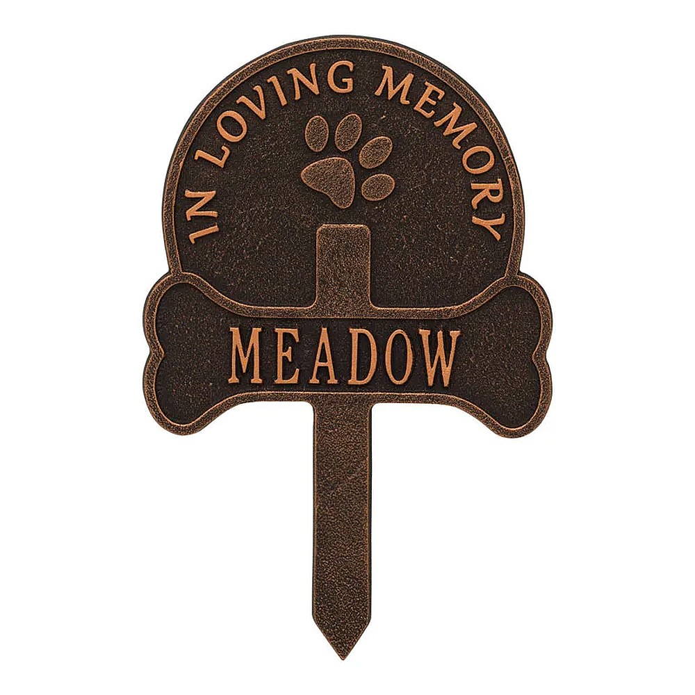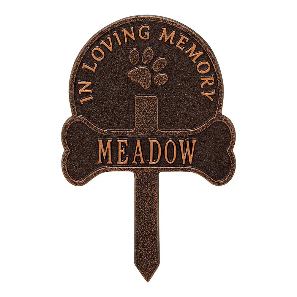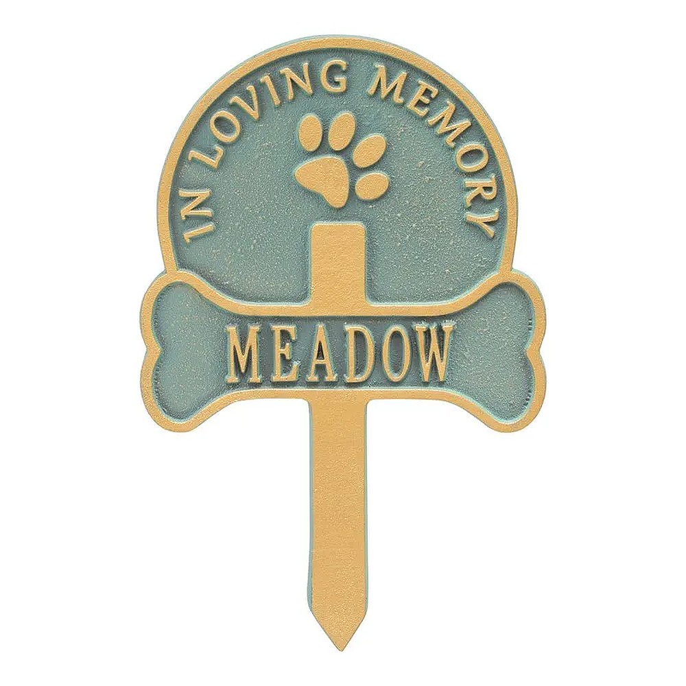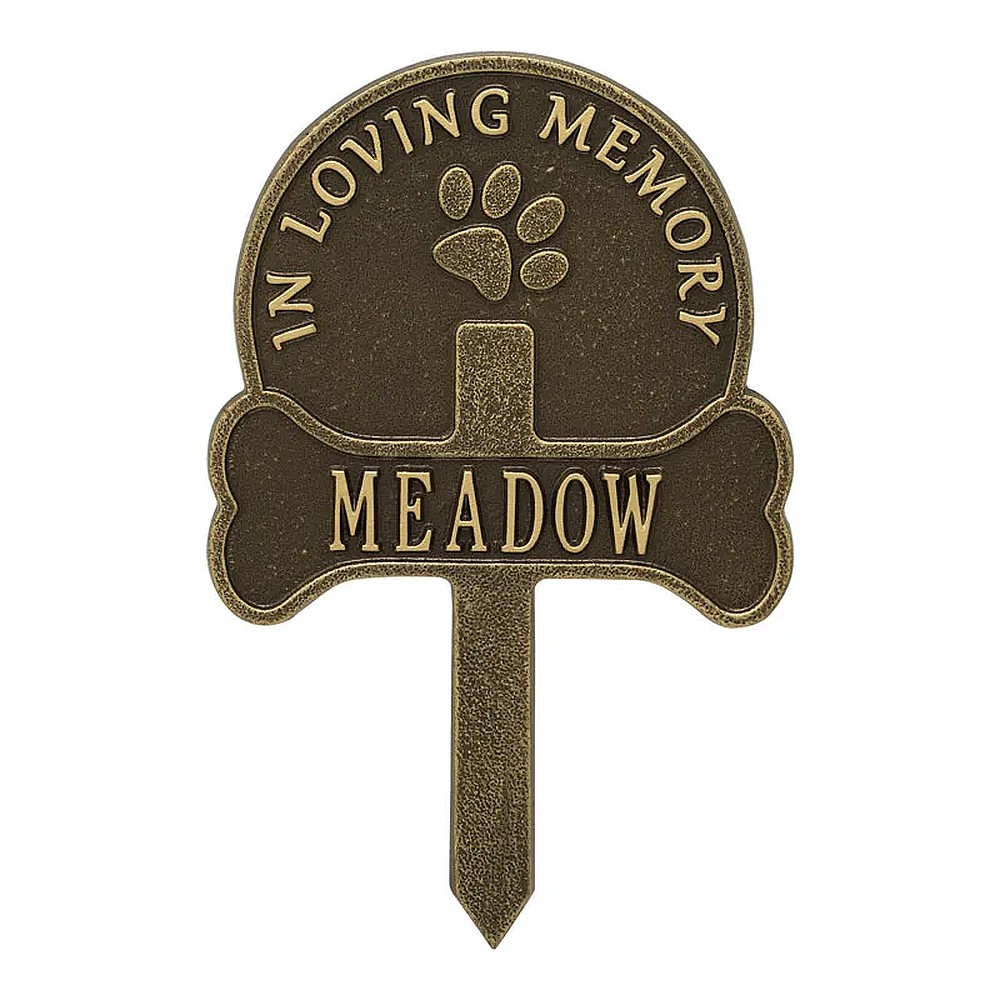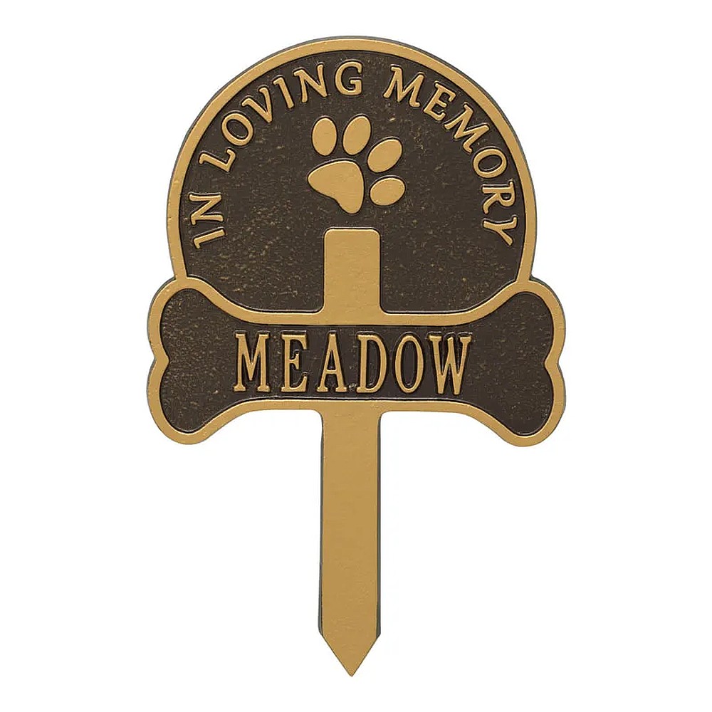 Assembled Dimensions Include Stakes (LxWxH): 9.25″ x 14.25″ x 0.25″ Keep your canine companion’s memory alive with this Paw and Bone personalized pet memorial marker. Celebrate and honor the memory of your pet and create a lasting memorial with this solid cast aluminum garden marker. This unique lawn stake can be used to designate a favorite area in your yard, a play area, or the pet’s burial site. Features an easy-to-install design for staking the plaque to the ground. Proudly made in the USA. Manufactured from recycled aluminum. Holds up to twelve 1.25″ characters. Personalization is permanently cast into the plaque. Lawn piercing stake design makes for easy installation. Alumi-Shieldâ„¢ – All Weather Coating protects against the harshest weather and environmental elements. Extends the product life and maintains the look and function.